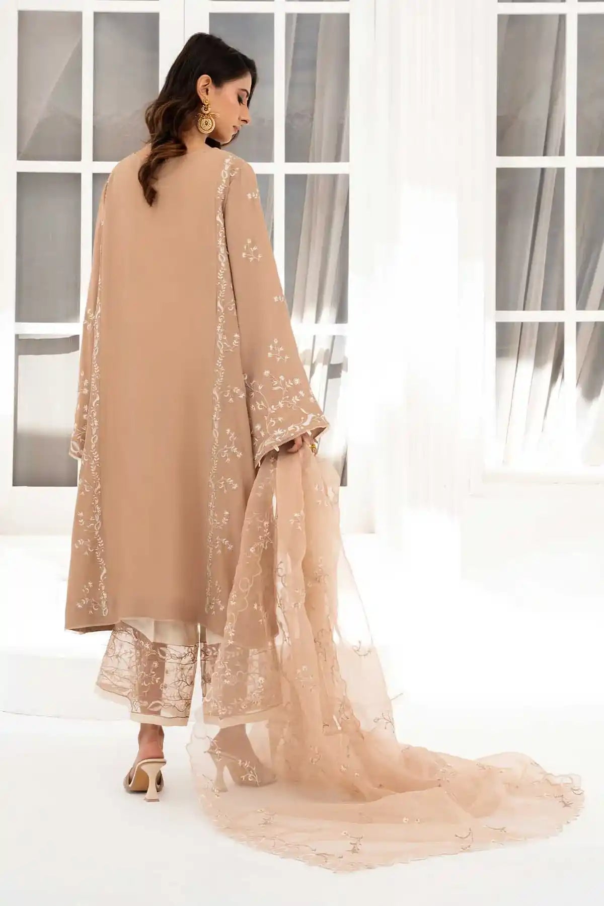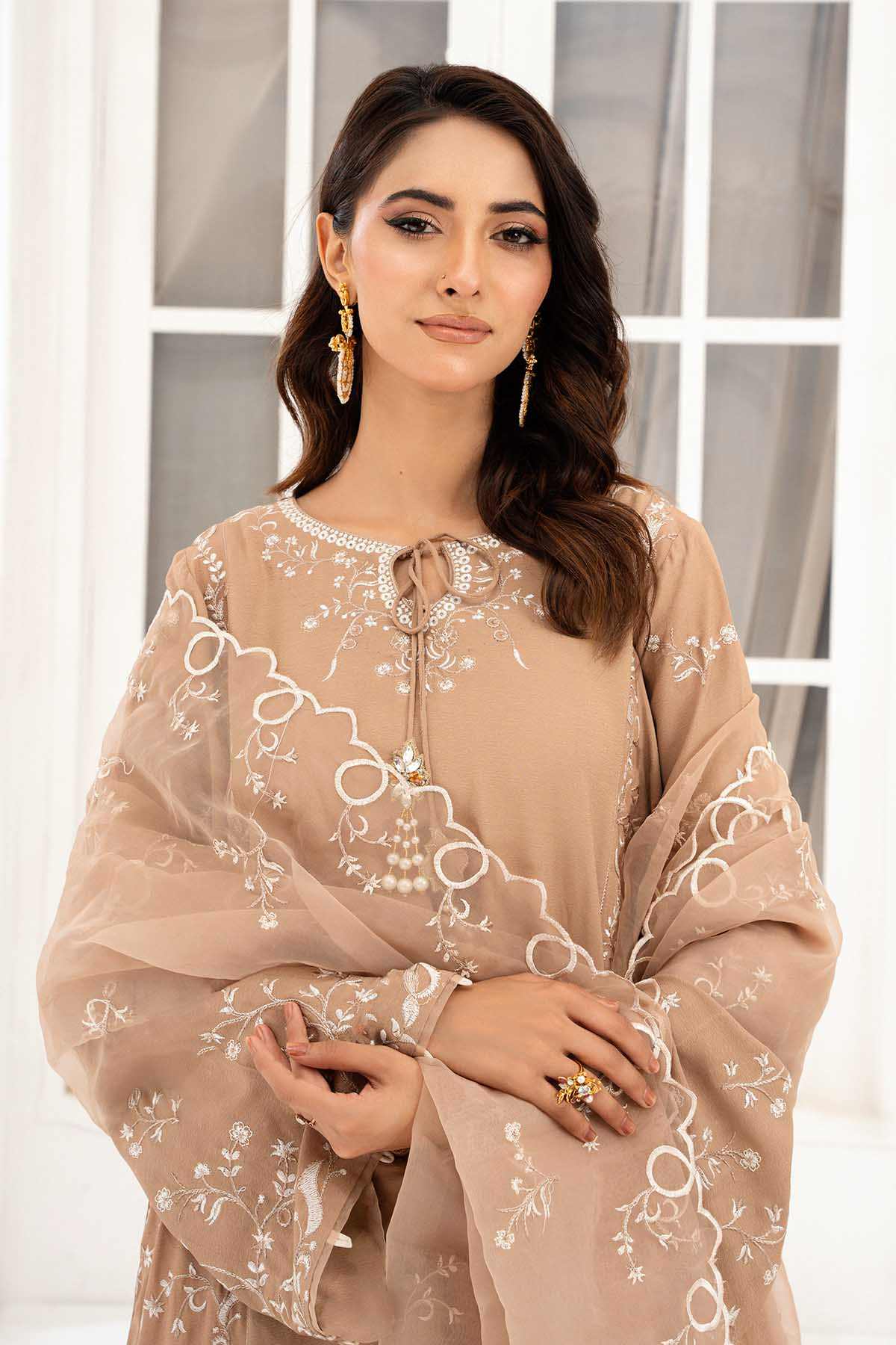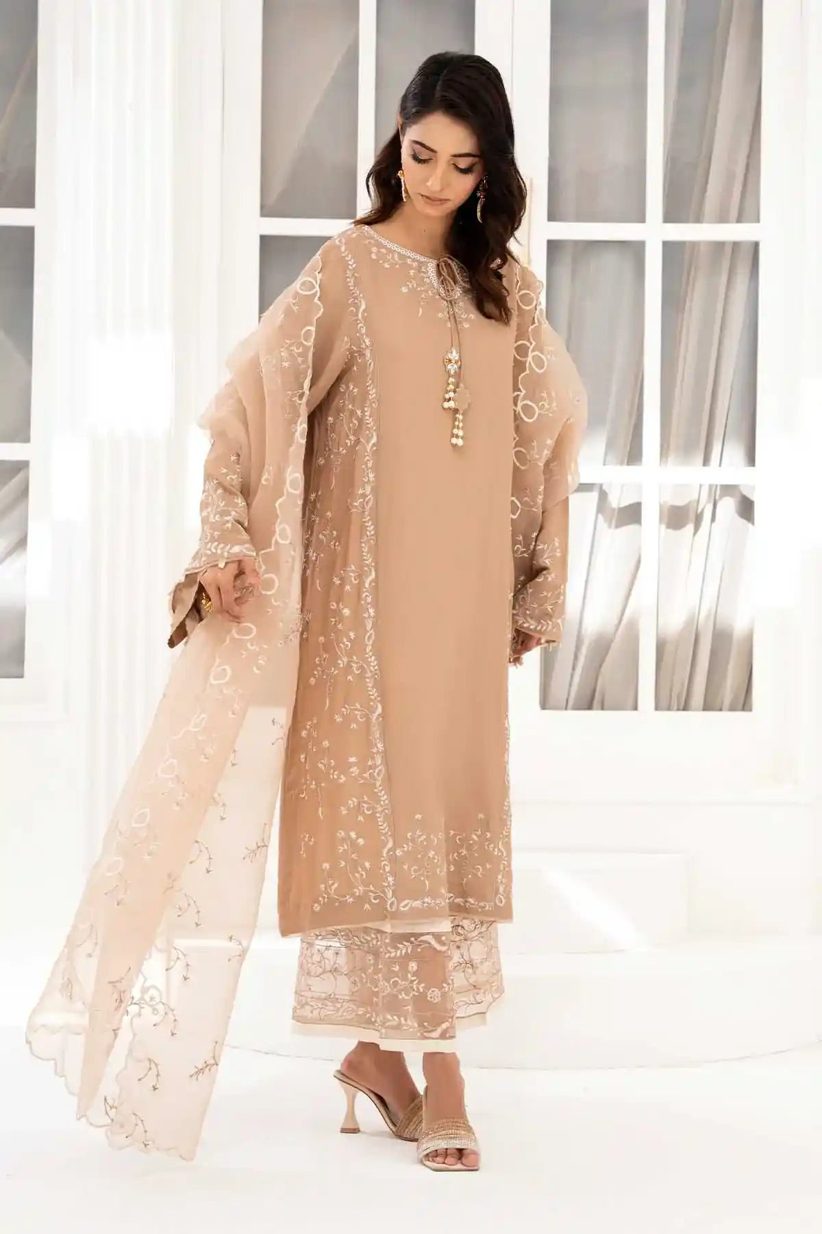 Flora & Fauna Eid Festive A Mocha Mousse Crepe Georgette Panelled A Line Shirt With Round Keyhole Neck Features Detailed Contrasting Thread Embroidery.Kurta Sleeves With Thread Embroidery And Pearl Finishing.Tassel Finishing On The Neckline.Cream Bamboo Rawsilk Culotte Embellished With Embroidered Organza On The Edges.Paired With Mocha Mousse Organza Dupatta Adorned With Contrasting Thread Embroidery And Cutwork Borders.