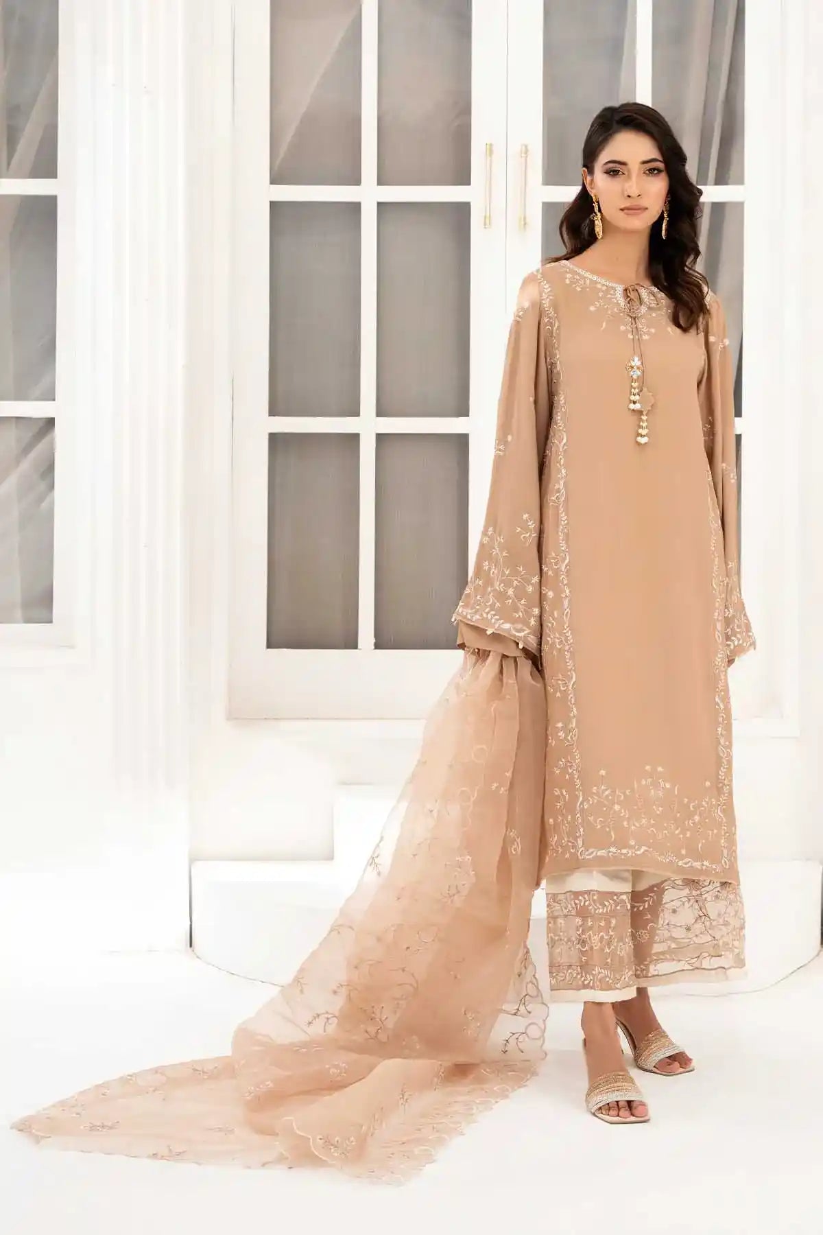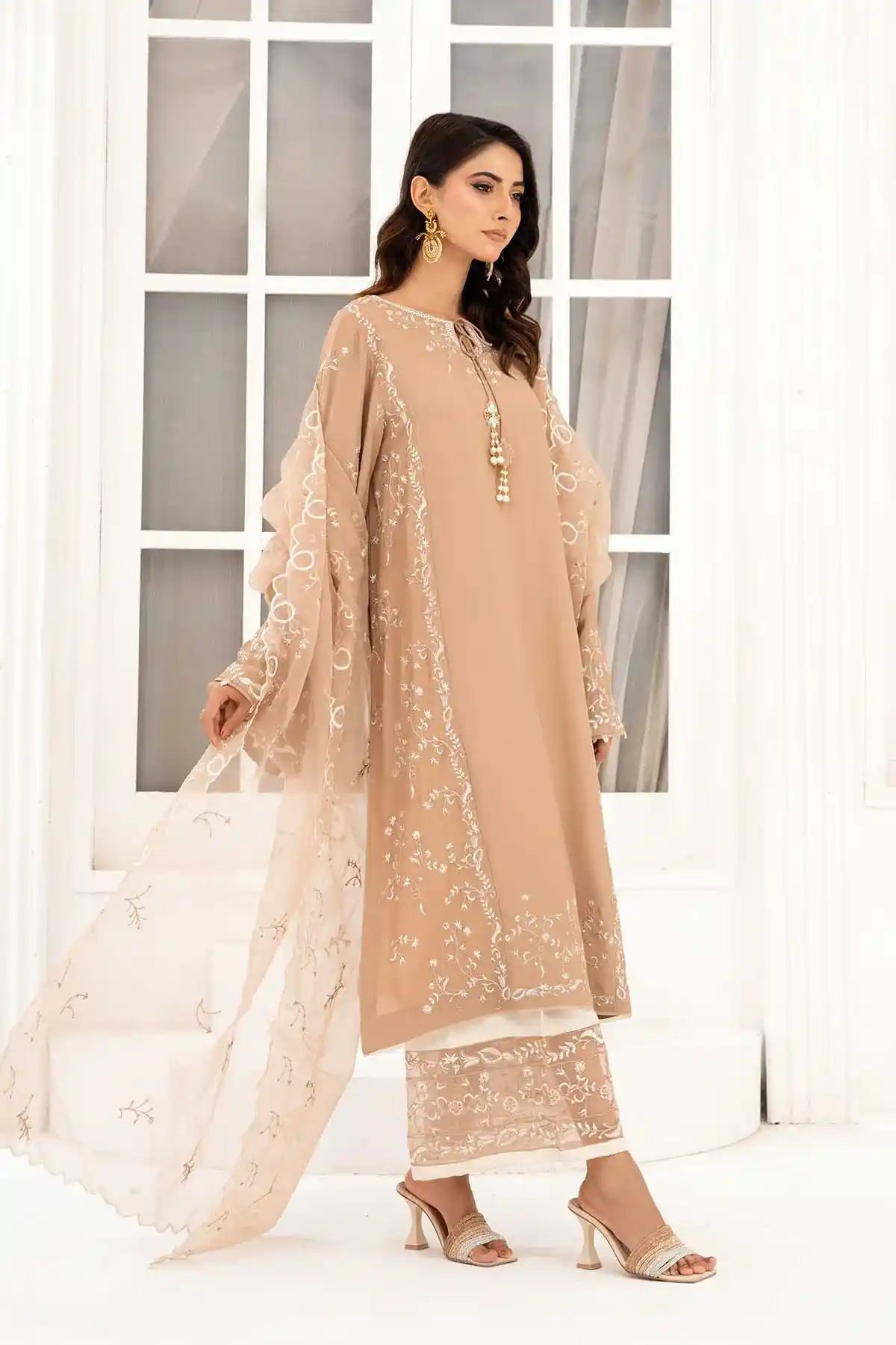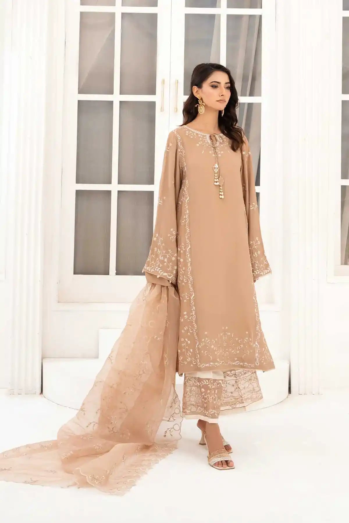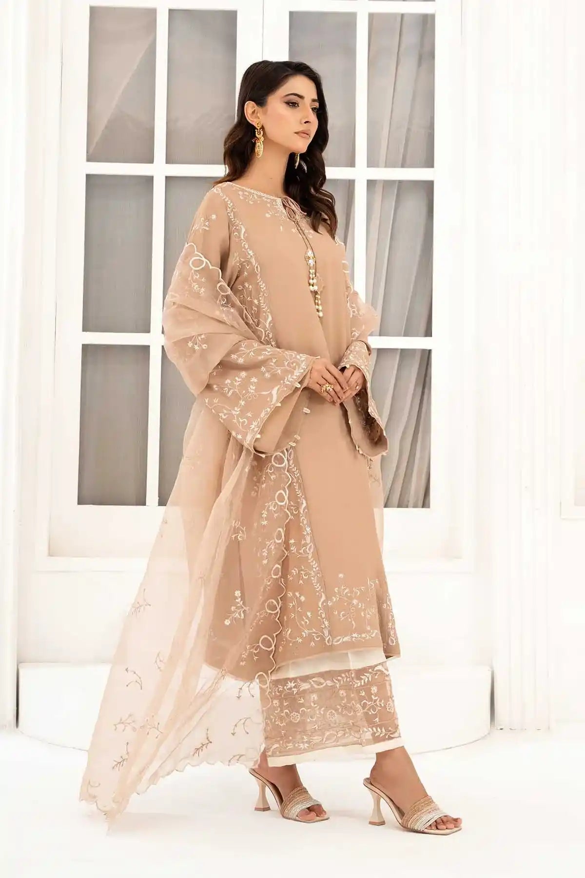 Flora & Fauna Eid Festive A Mocha Mousse Crepe Georgette Panelled A Line Shirt With Round Keyhole Neck Features Detailed Contrasting Thread Embroidery.Kurta Sleeves With Thread Embroidery And Pearl Finishing.Tassel Finishing On The Neckline.Cream Bamboo Rawsilk Culotte Embellished With Embroidered Organza On The Edges.Paired With Mocha Mousse Organza Dupatta Adorned With Contrasting Thread Embroidery And Cutwork Borders.