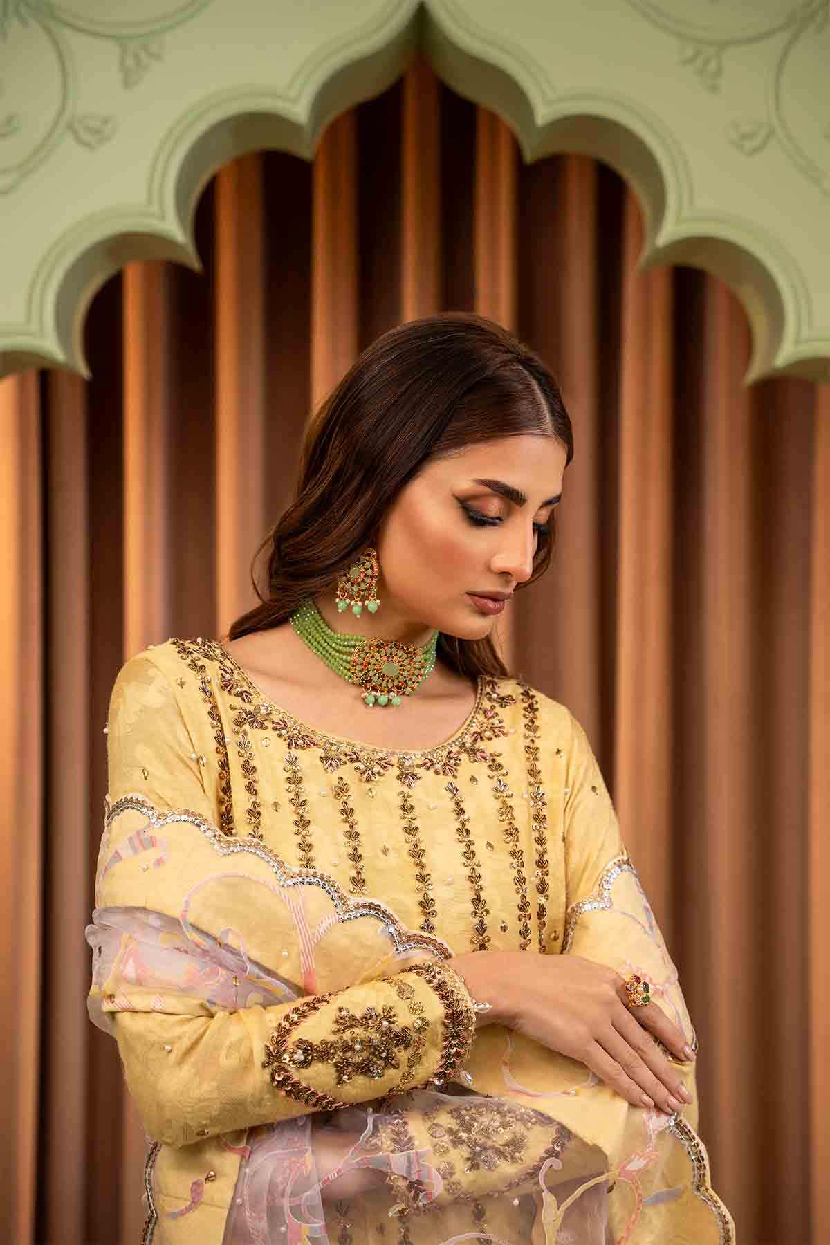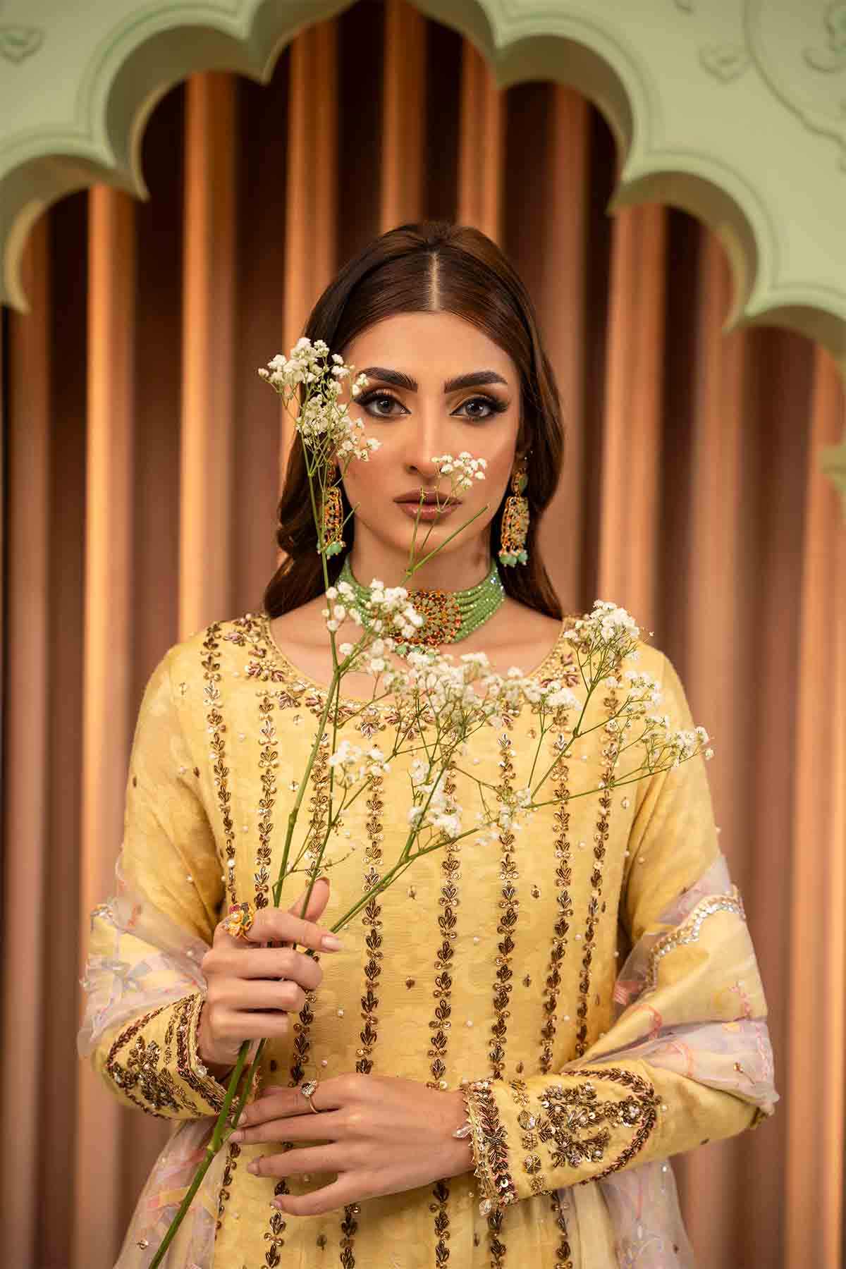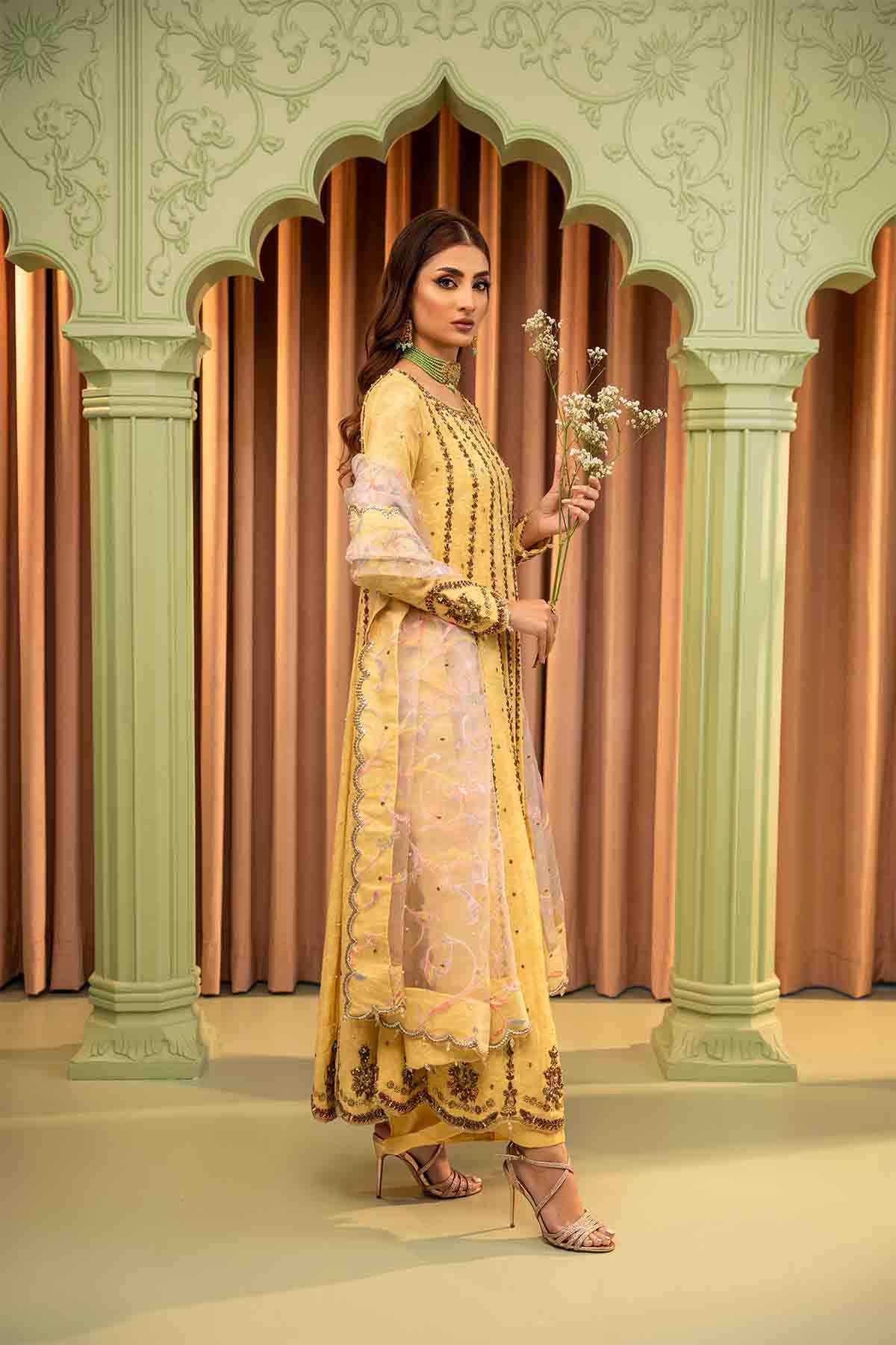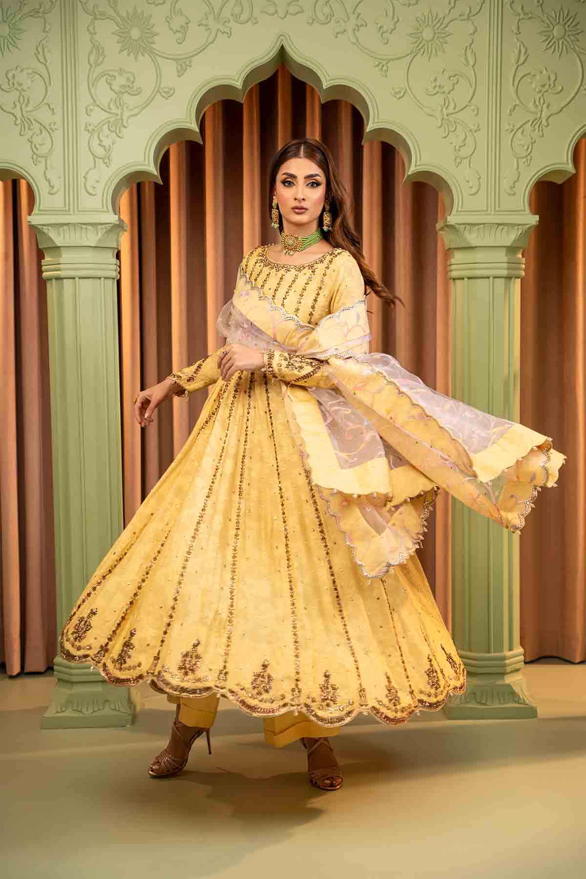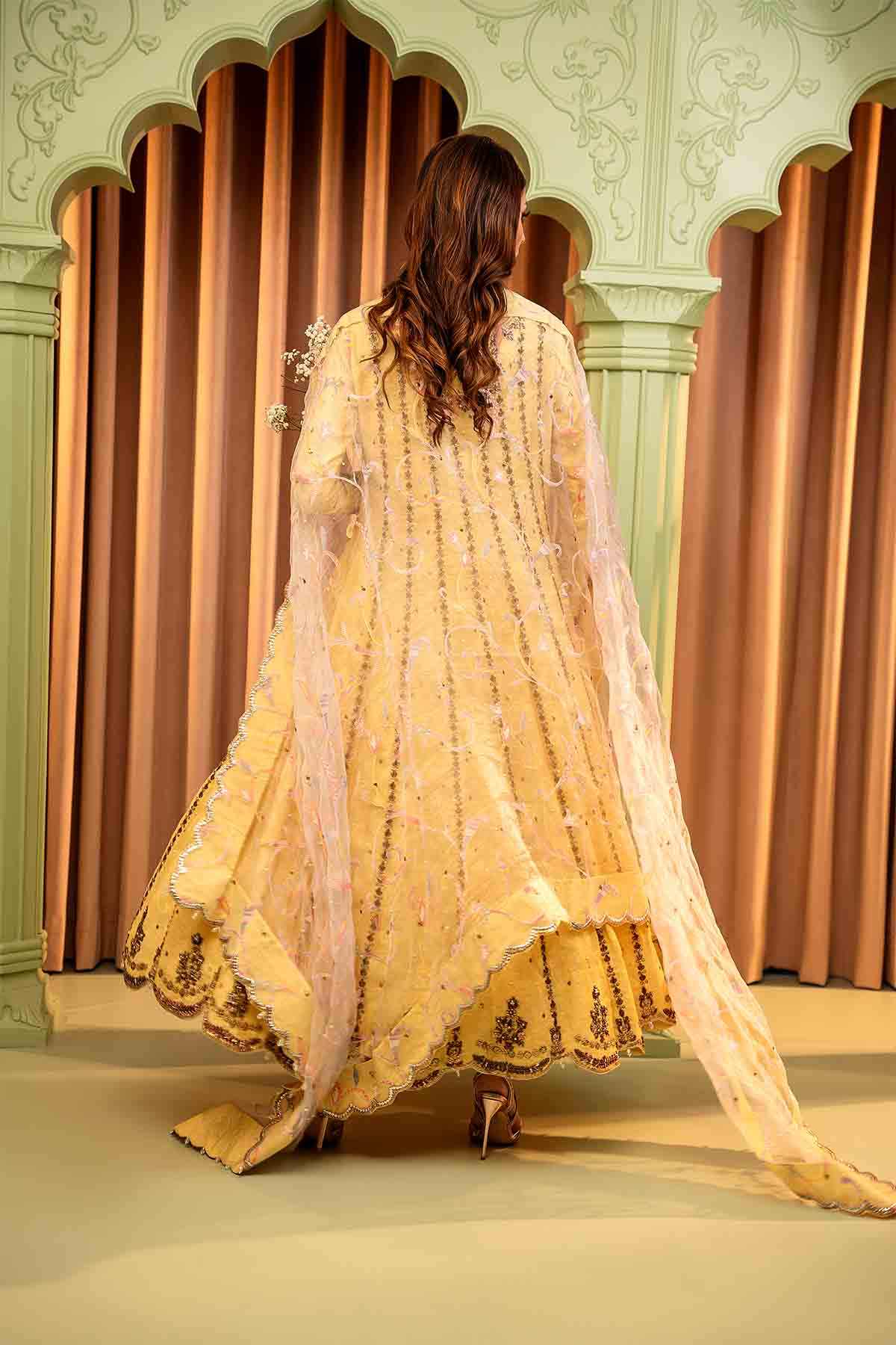 A Lemon Self Khaadi Silk Kalidar Is Delicately Hand Embroidered With Dull Gold And Hint Of Silver Zardoze And Gold Sequins And Crystals. Embellished With Baby Pink And Lavender Colour Resham Details On Kalidar. Paired With Khaadi Silk Pants And Broshia Organza.