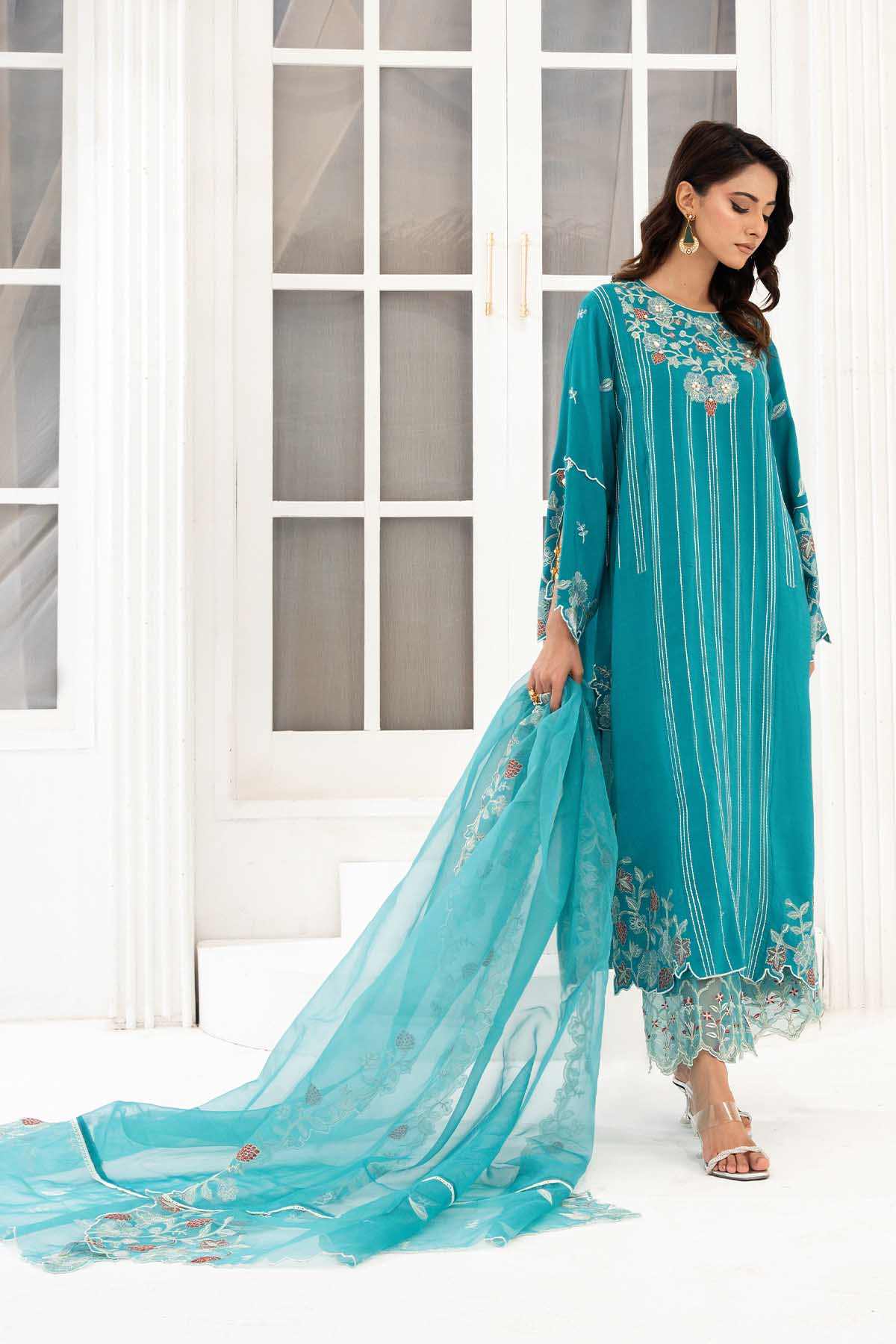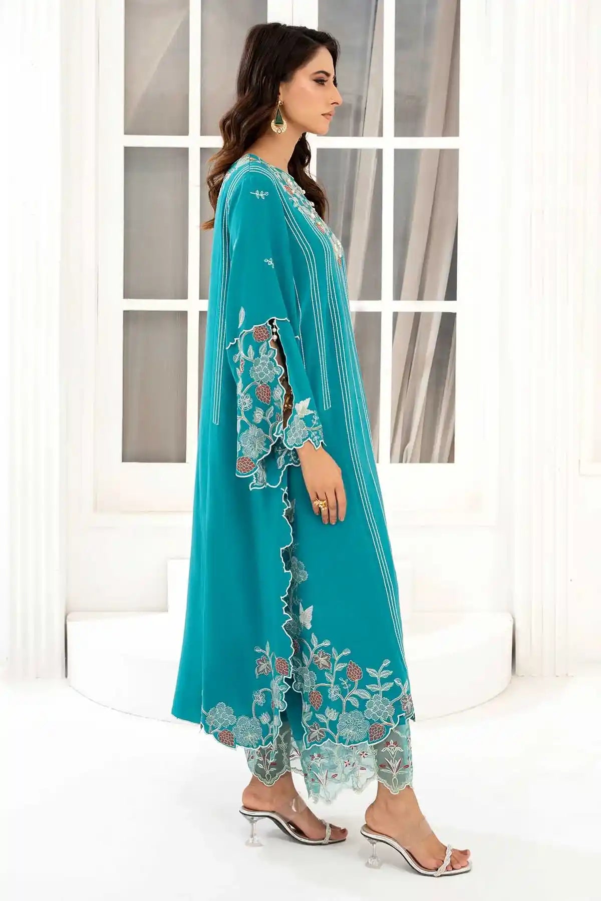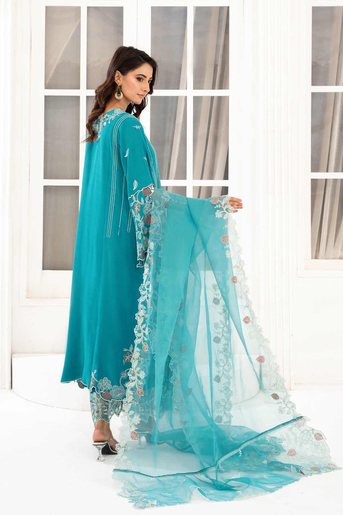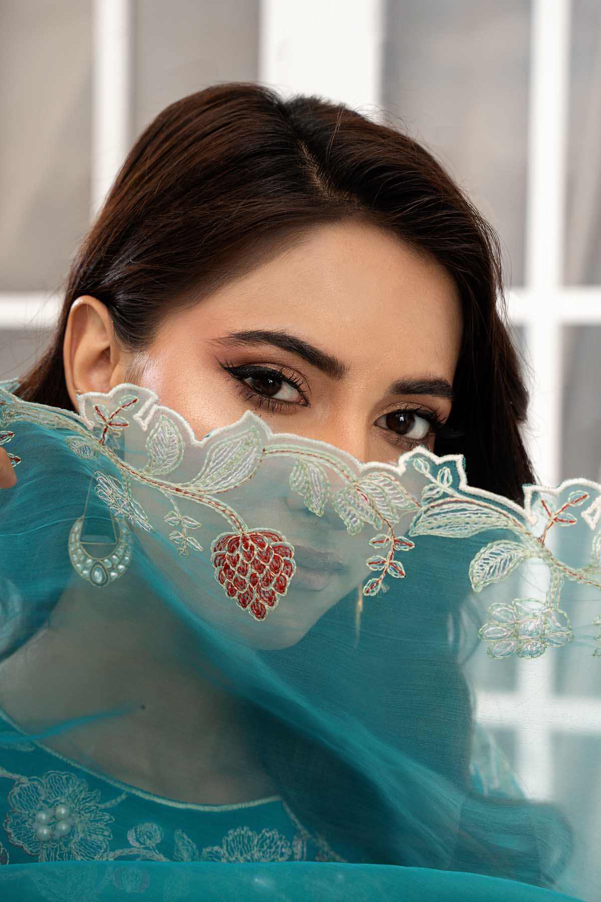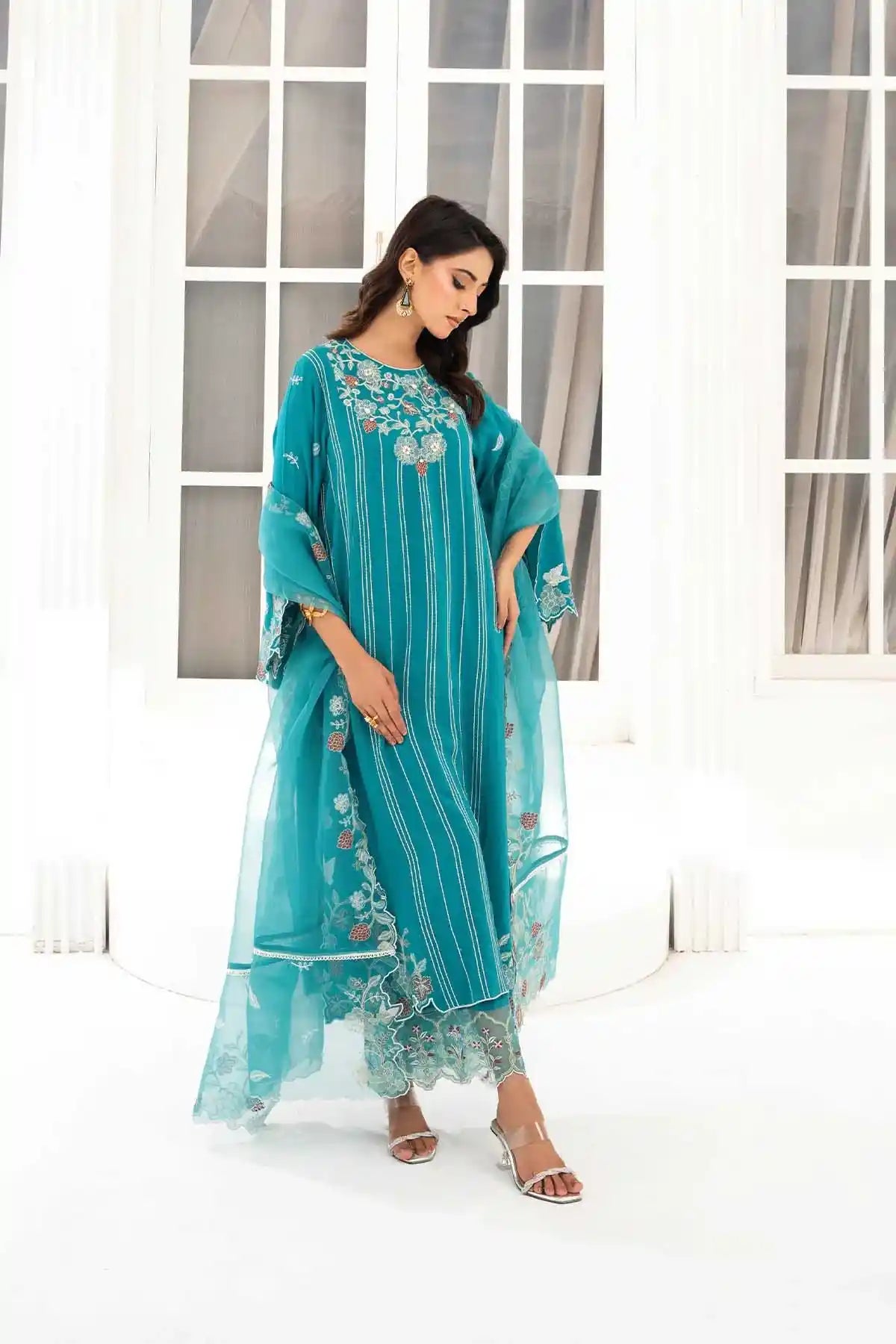 Flora & Fauna Eid Festive A Tropical Teal Crepe Georgette Long A Line Shirt With Round Neck Features Detailed Contrasting Thread Embroidery With Hand Touches Of Pearls.Slit Sleeves With Thread Embroidery And Pearl Finishing.Tropical Teal Crepe Georgette Culotte Embellished With Embroidered Organza On The Edges.Paired With Tropical Teal Organza Dupatta Adorned With Thread Embroidery And Cutwork Edges.