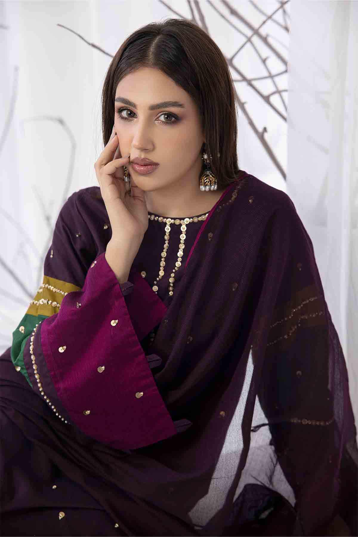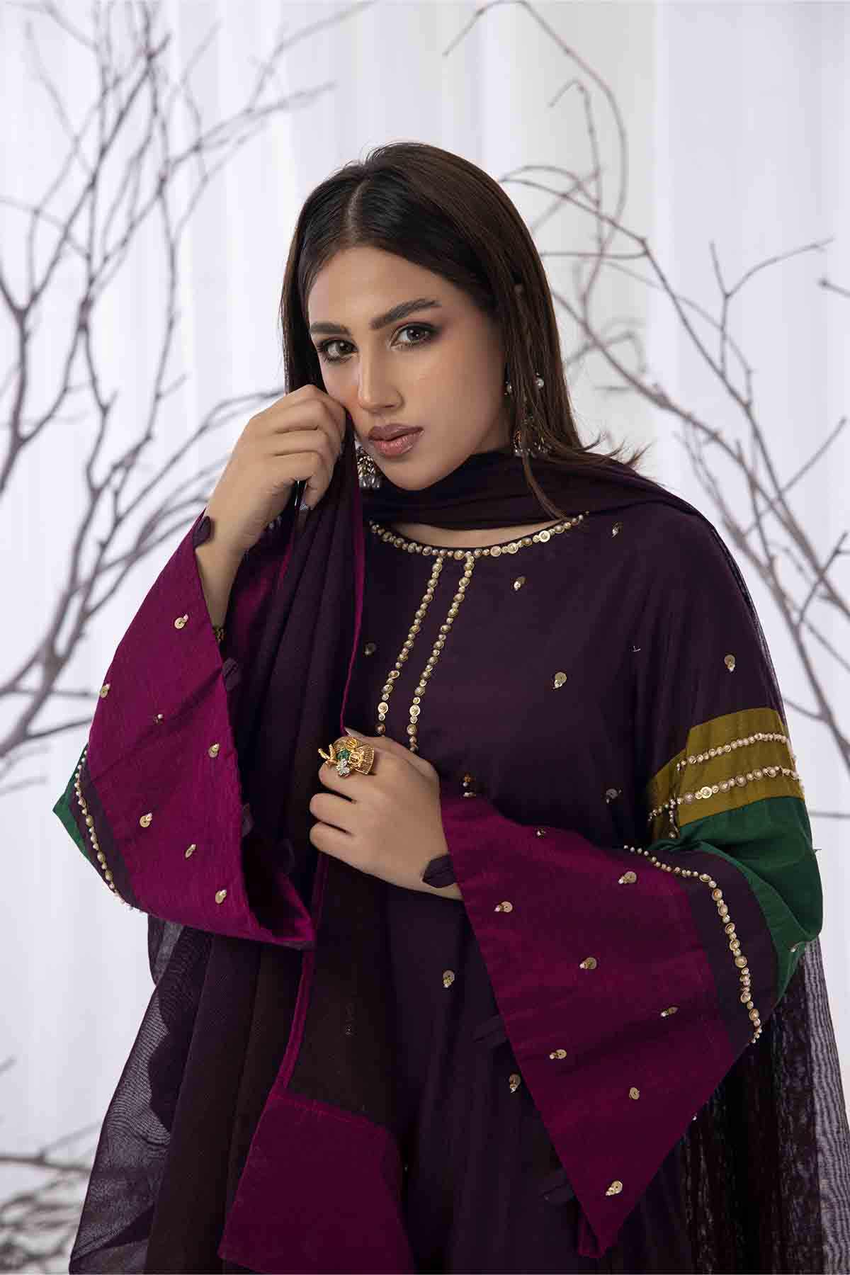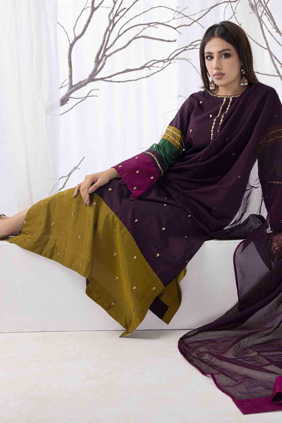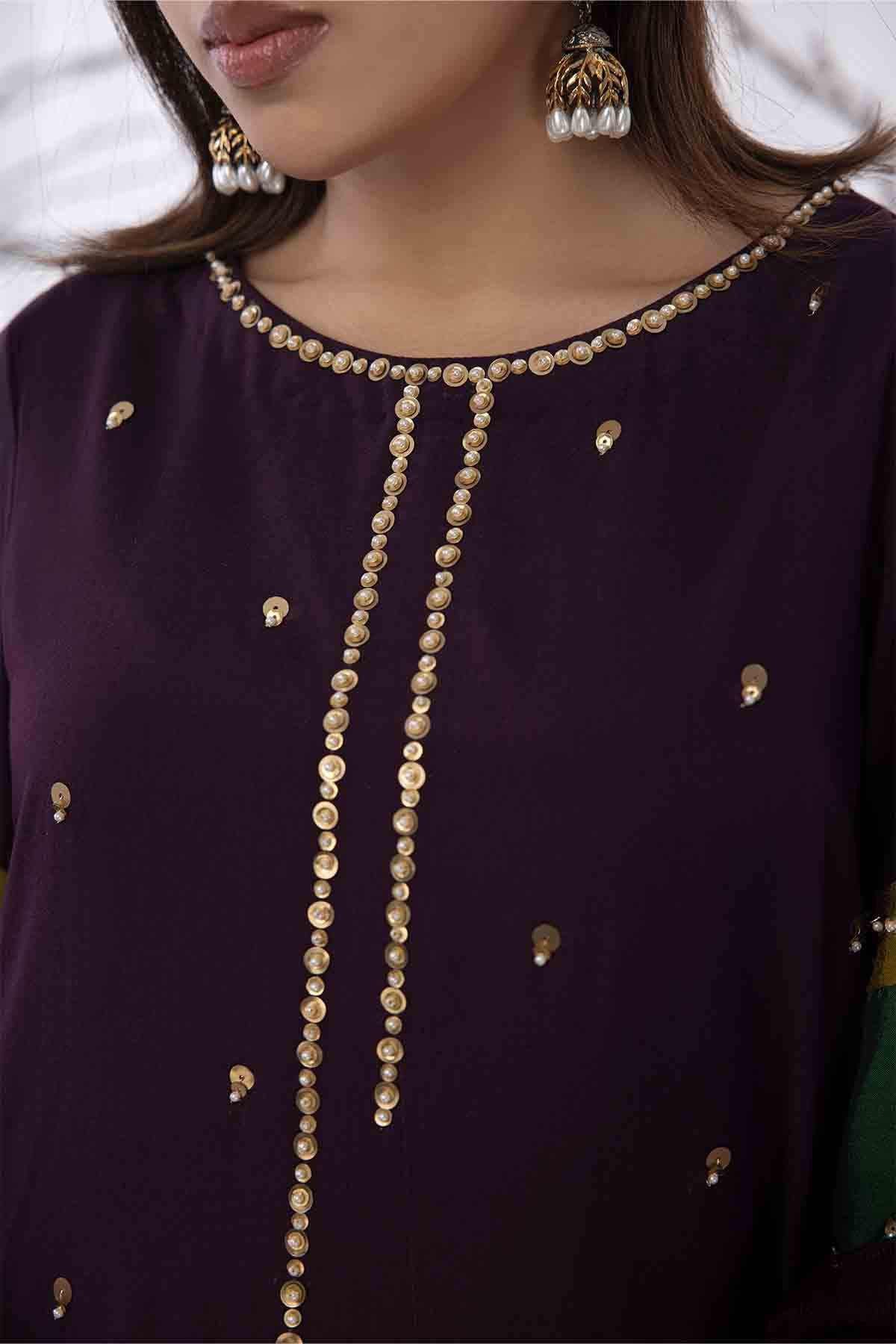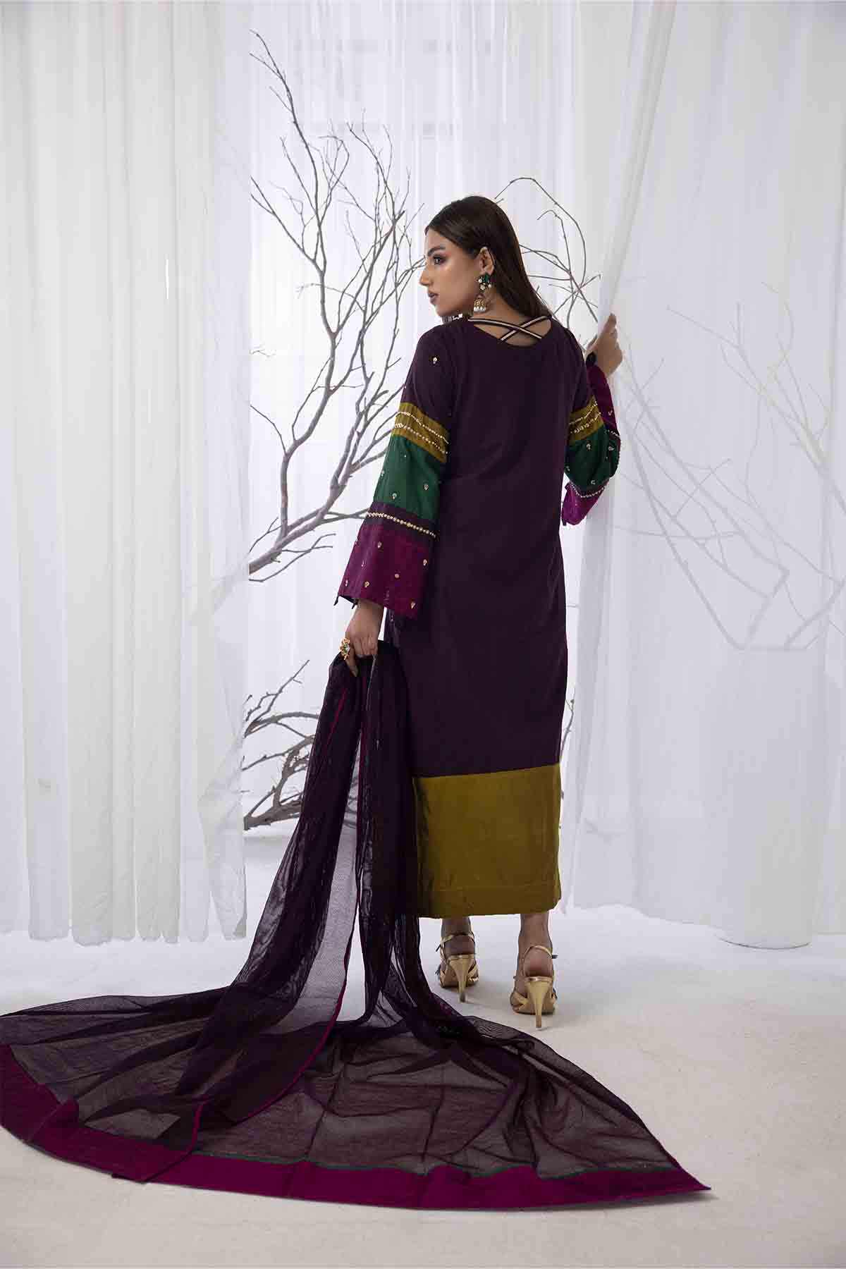 Jahaan 23: Color-Blocked Katan Silk Plum Shirt With Magenta, Green And Olive Green. A Line Shirt Adorned With Pearls & Sequins Hand Embroidery All Over. Paired Up With The Same Color Straight Button-Down Culottes And Cotton Net Dupatta. A Perfect Chic Look For This Festive Season.