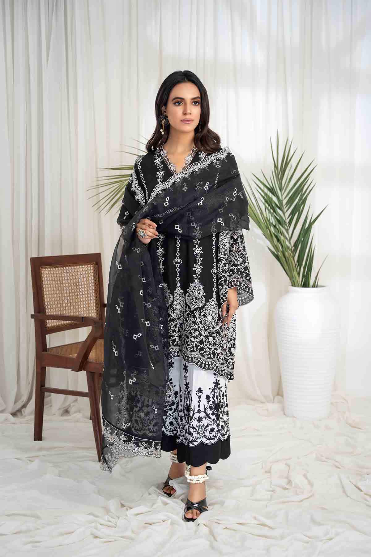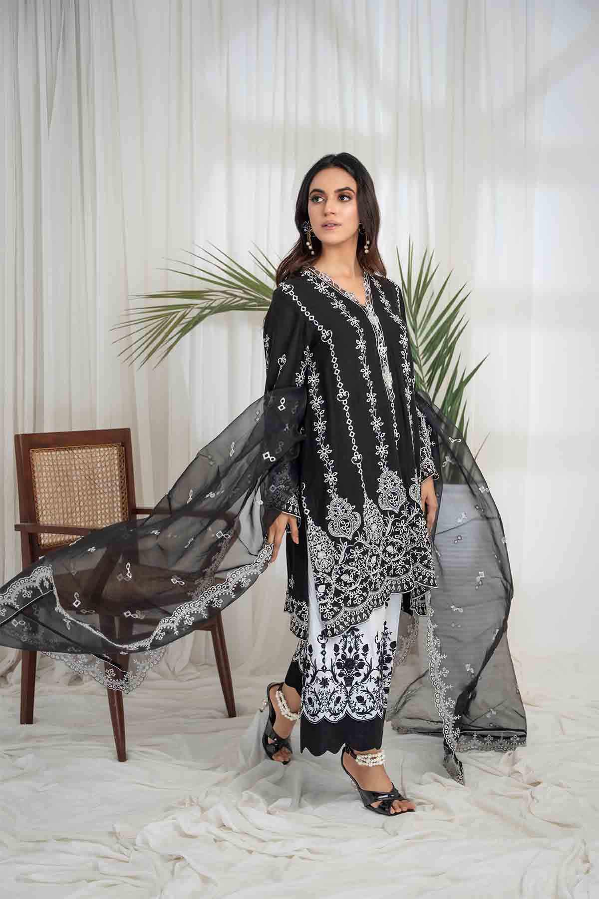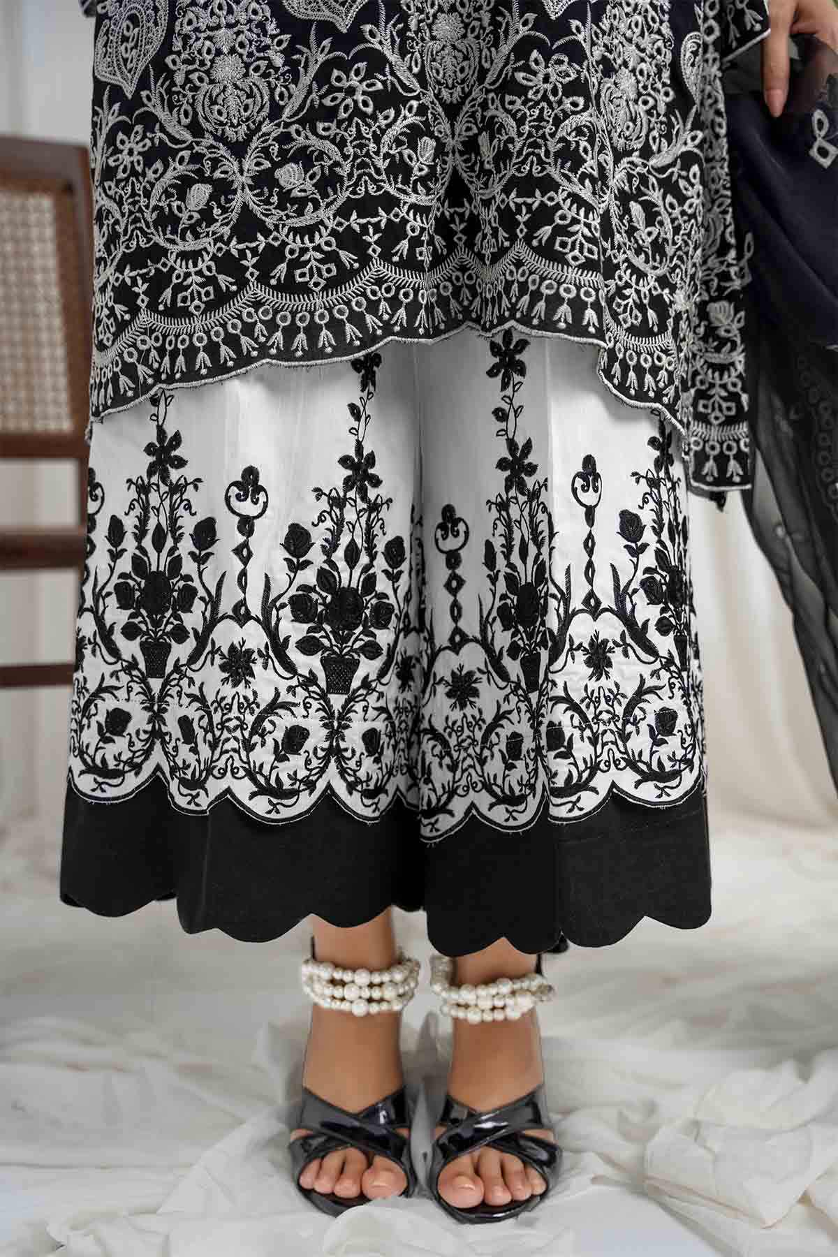 The Ensemble Features A Black Cotton Lawn Voile Tunic With An Organza Dupatta Featuring Off White Schiffli Thread Embroidery With Cutwork Scalloped Edges All Over. Embellished With Hand Embroidered Mirror Work Motifs. Paired Up With A Contrasting Off White Cotton Culotte Featuring Floral Scalloped Thread Embroidery All Over In Black To Create An Elegant And Timeless Look.
