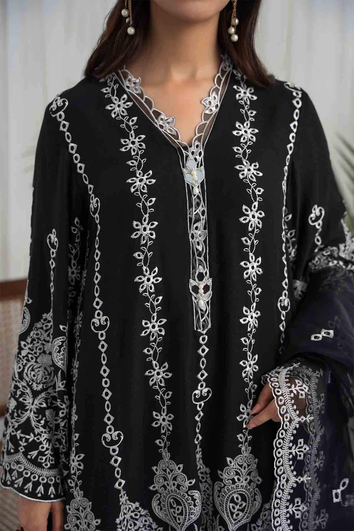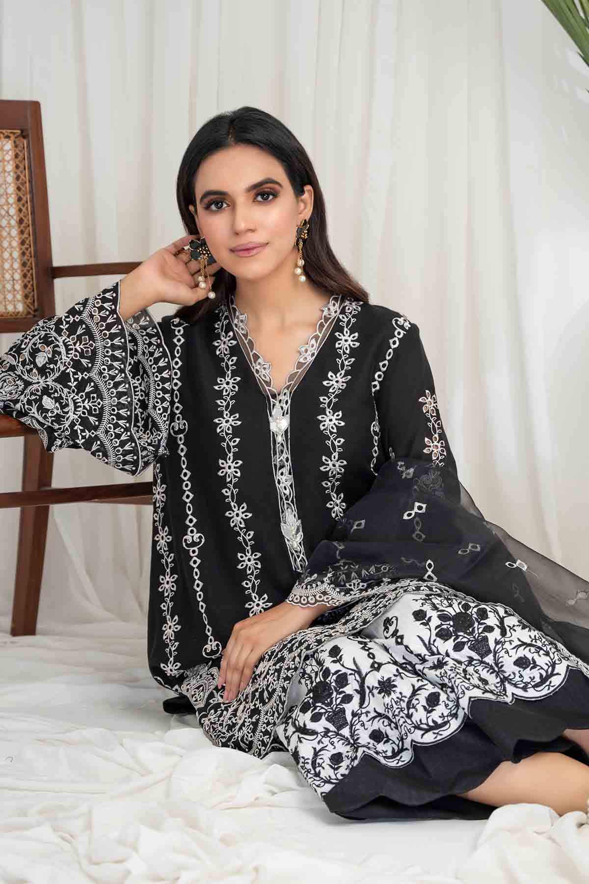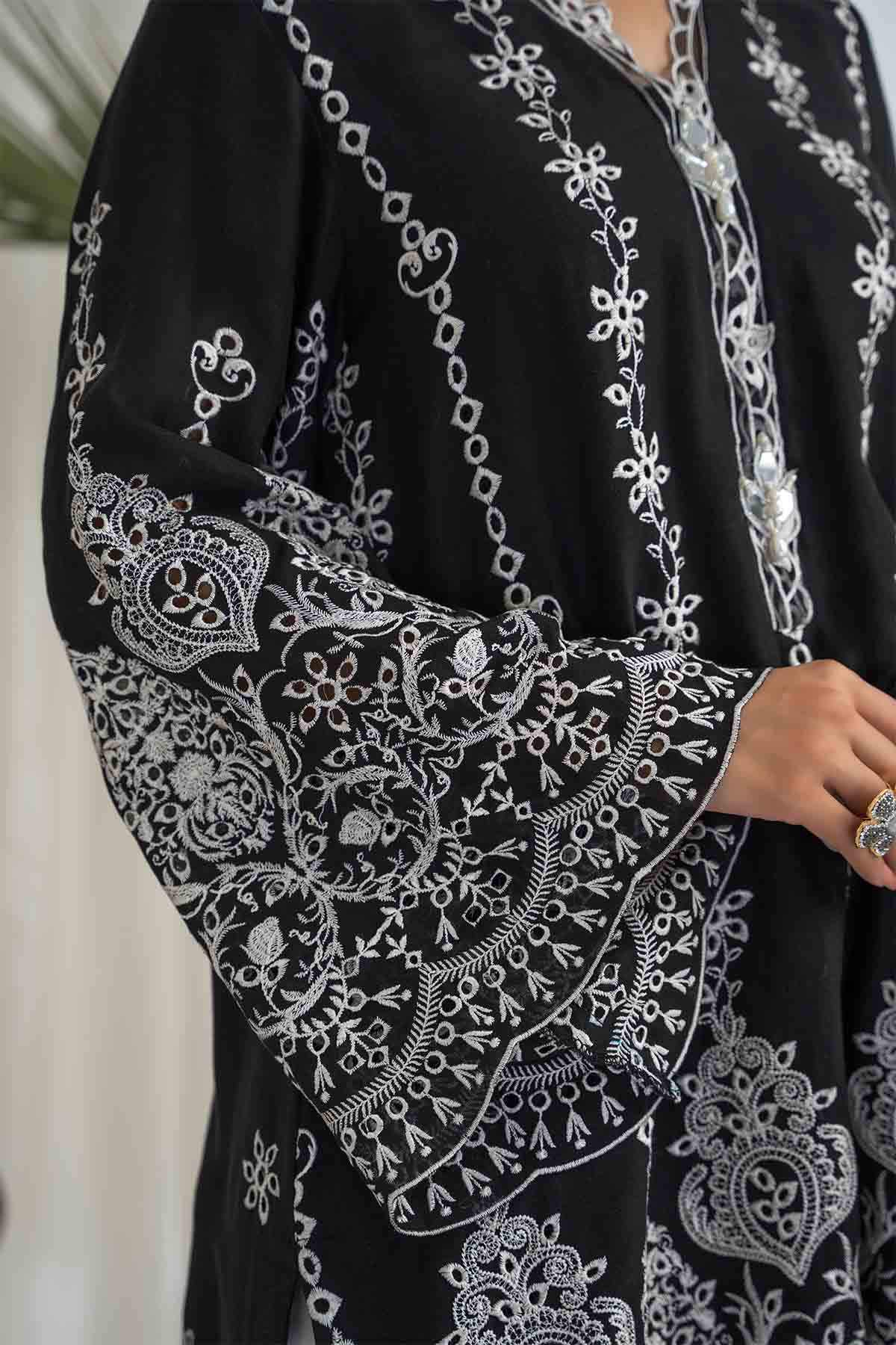 The Ensemble Features A Black Cotton Lawn Voile Tunic With An Organza Dupatta Featuring Off White Schiffli Thread Embroidery With Cutwork Scalloped Edges All Over. Embellished With Hand Embroidered Mirror Work Motifs. Paired Up With A Contrasting Off White Cotton Culotte Featuring Floral Scalloped Thread Embroidery All Over In Black To Create An Elegant And Timeless Look.