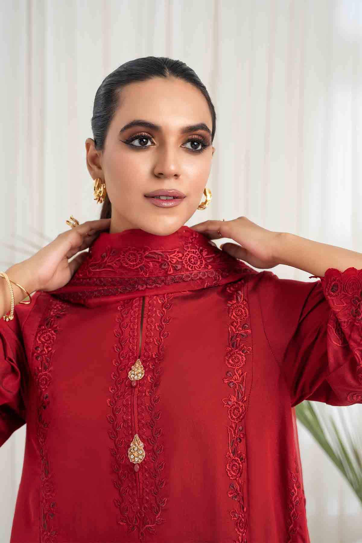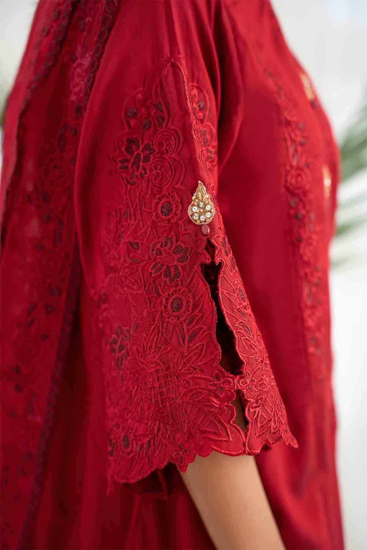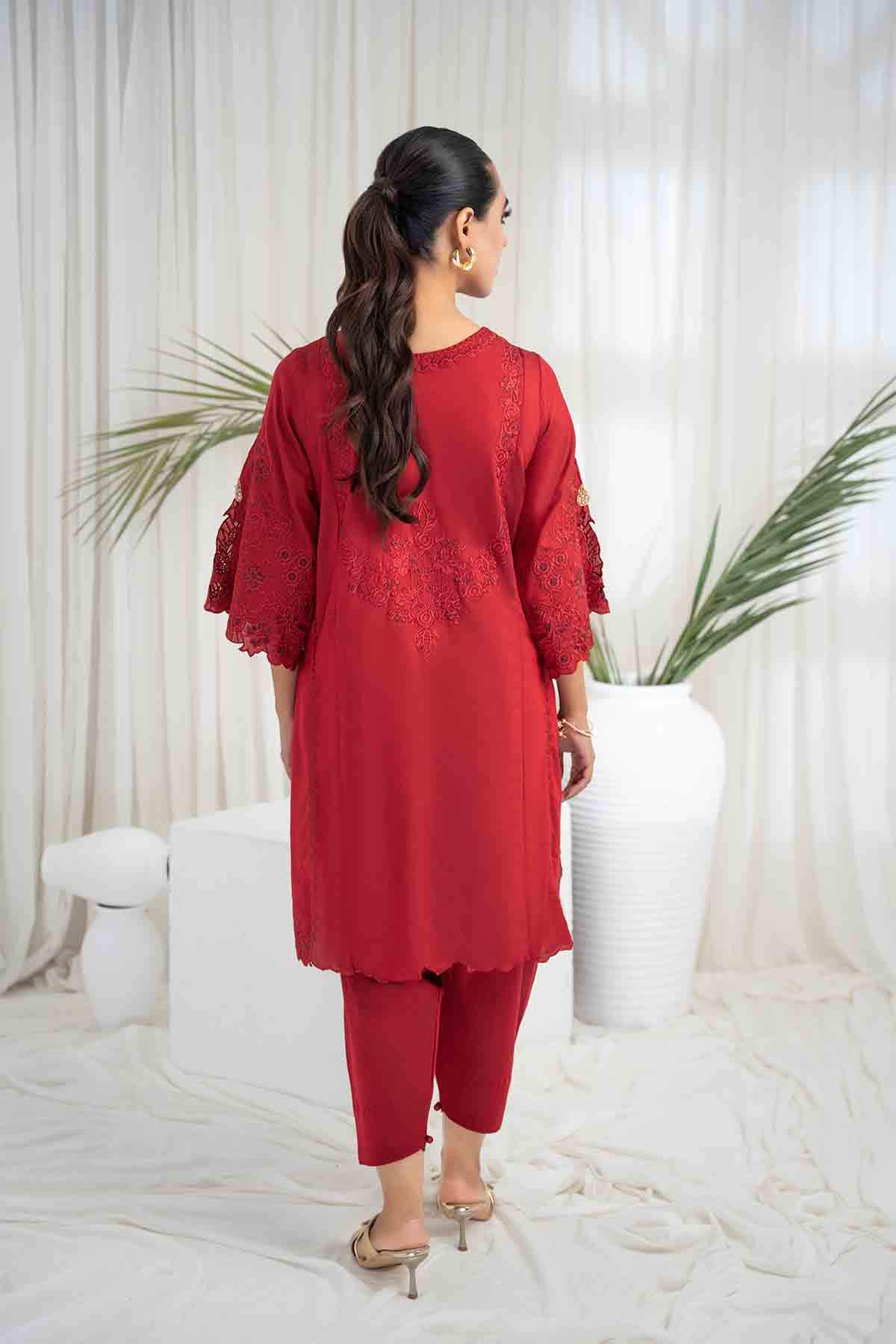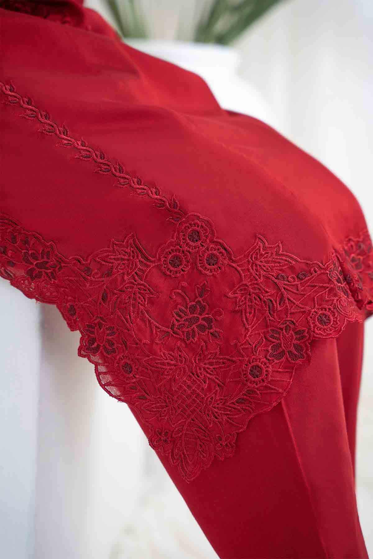 The Ensemble Features A Sindoori Red Mid-Length A-Line Kattan Silk Tunic With Three-Quarter Cutwork Sleeves. Paired With Organza Dupatta Embellished With Cutwork Thread Embroidery All Over. Finished With Hand Embroidered Motifs And Stones. Paired Up With A Matching  Kattan Silk Skinny Shalwar To Create An Elegant And Timeless Look.