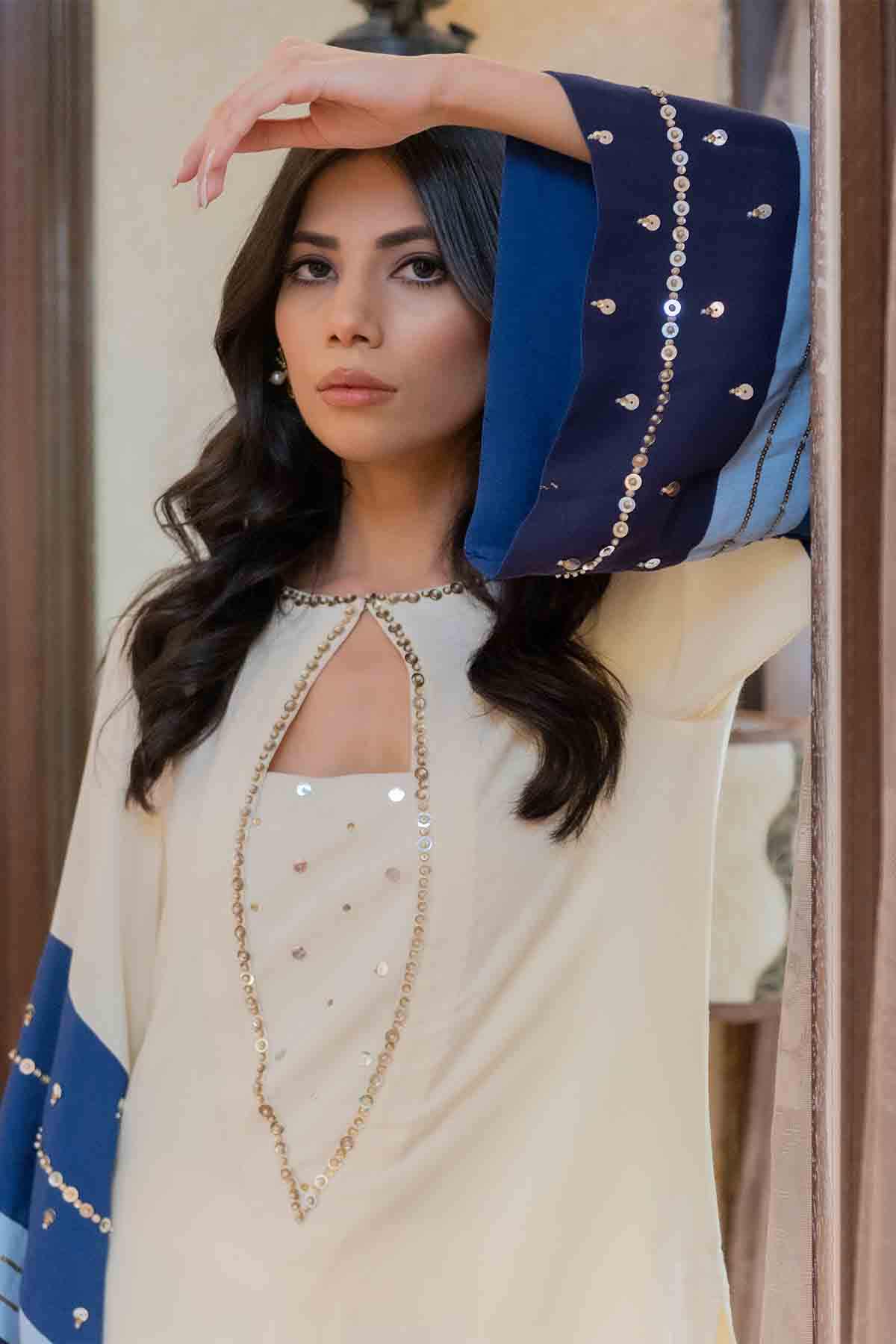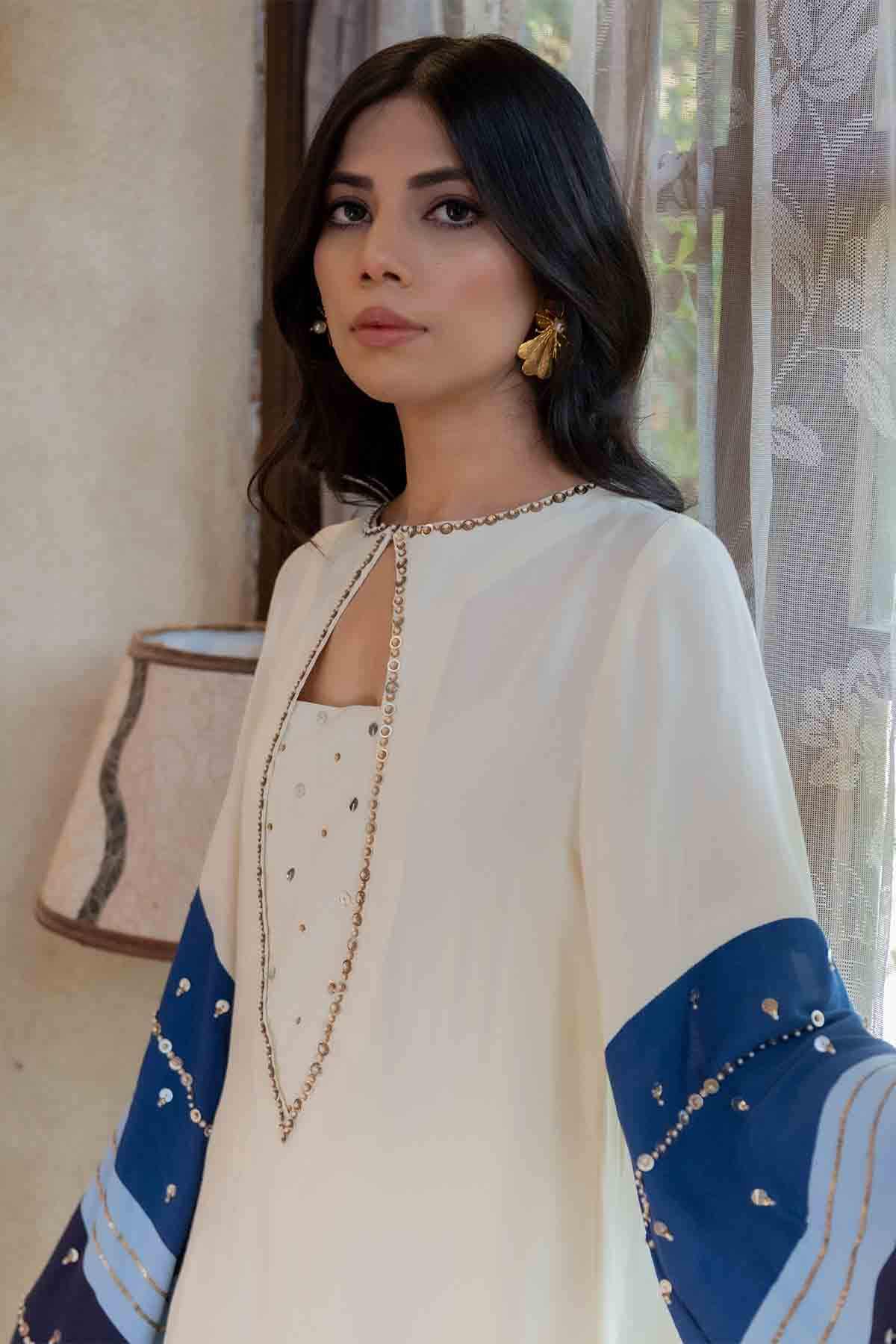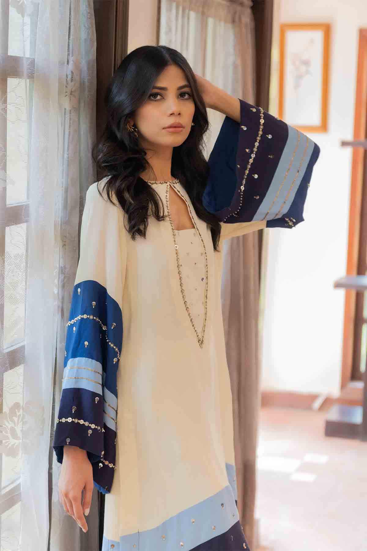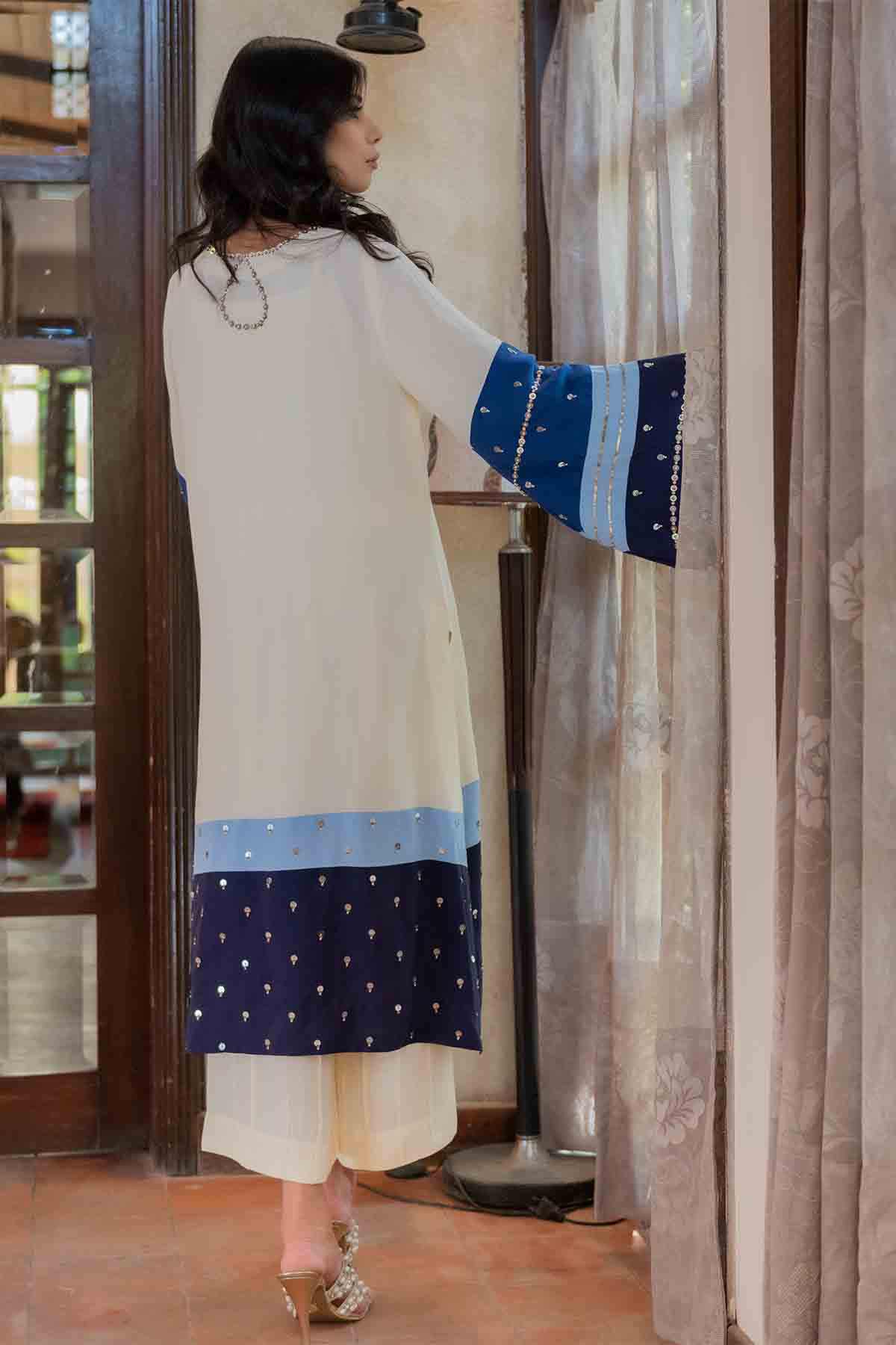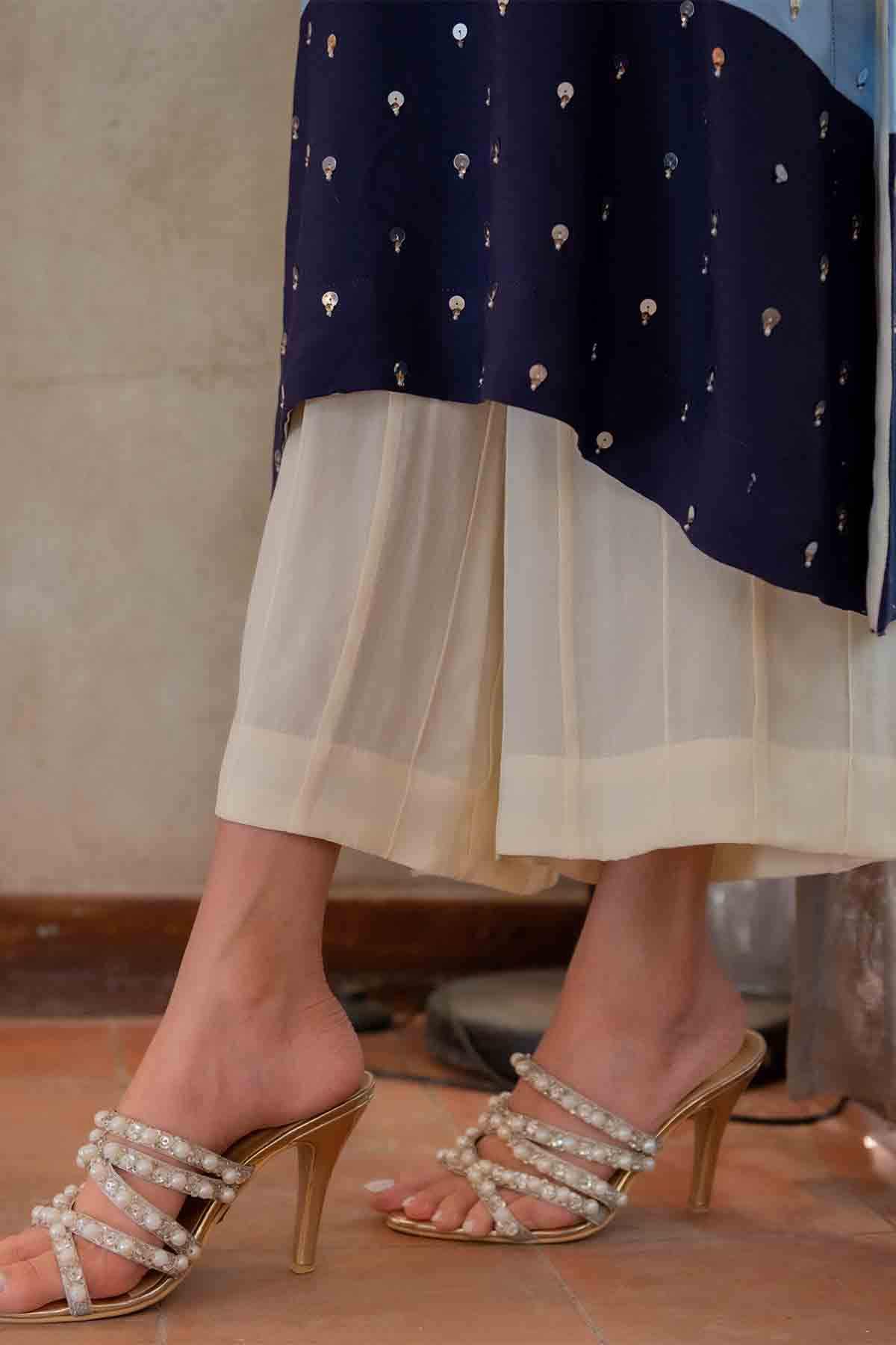 Color Blocked Pure Crepe Georgette Ivory Shirt With Shade's Of Blue. A Line Long Shirt Adorned With Pearls & Sequins Hand Embroidery All Over. Paired Up With Same Color Fabric Manipulated Culottes. A Perfect Chic Look For This Eid.