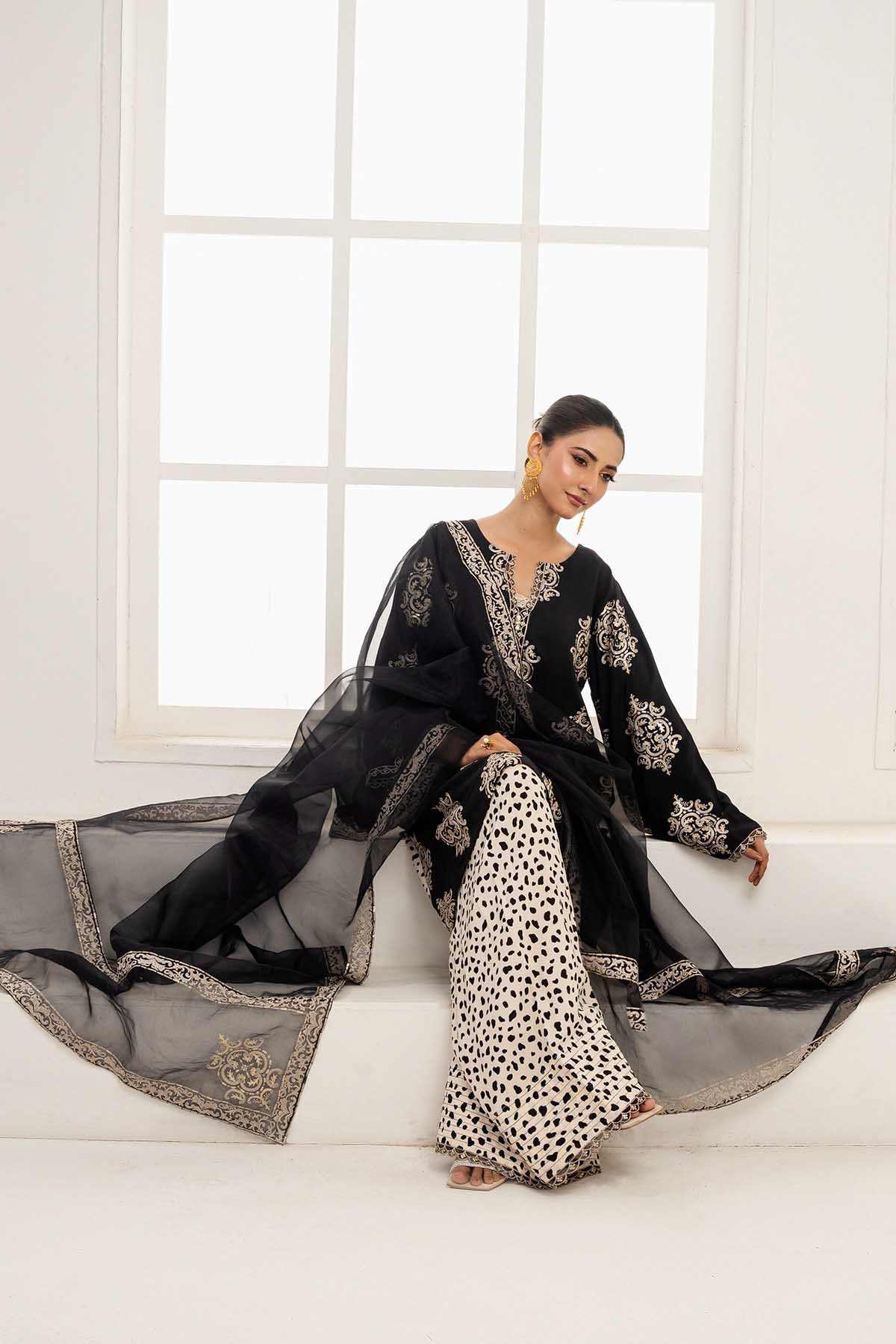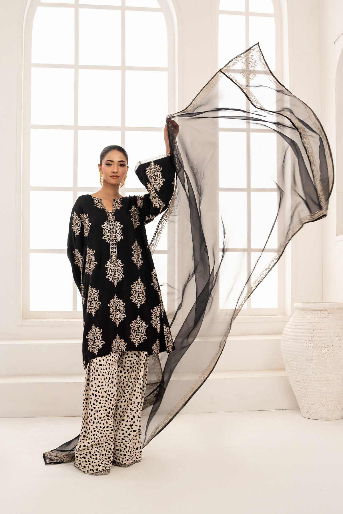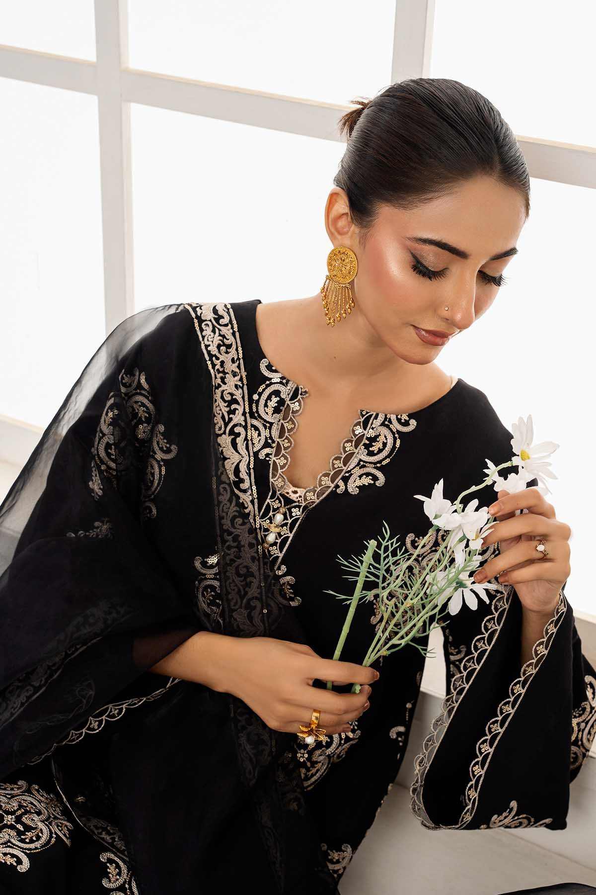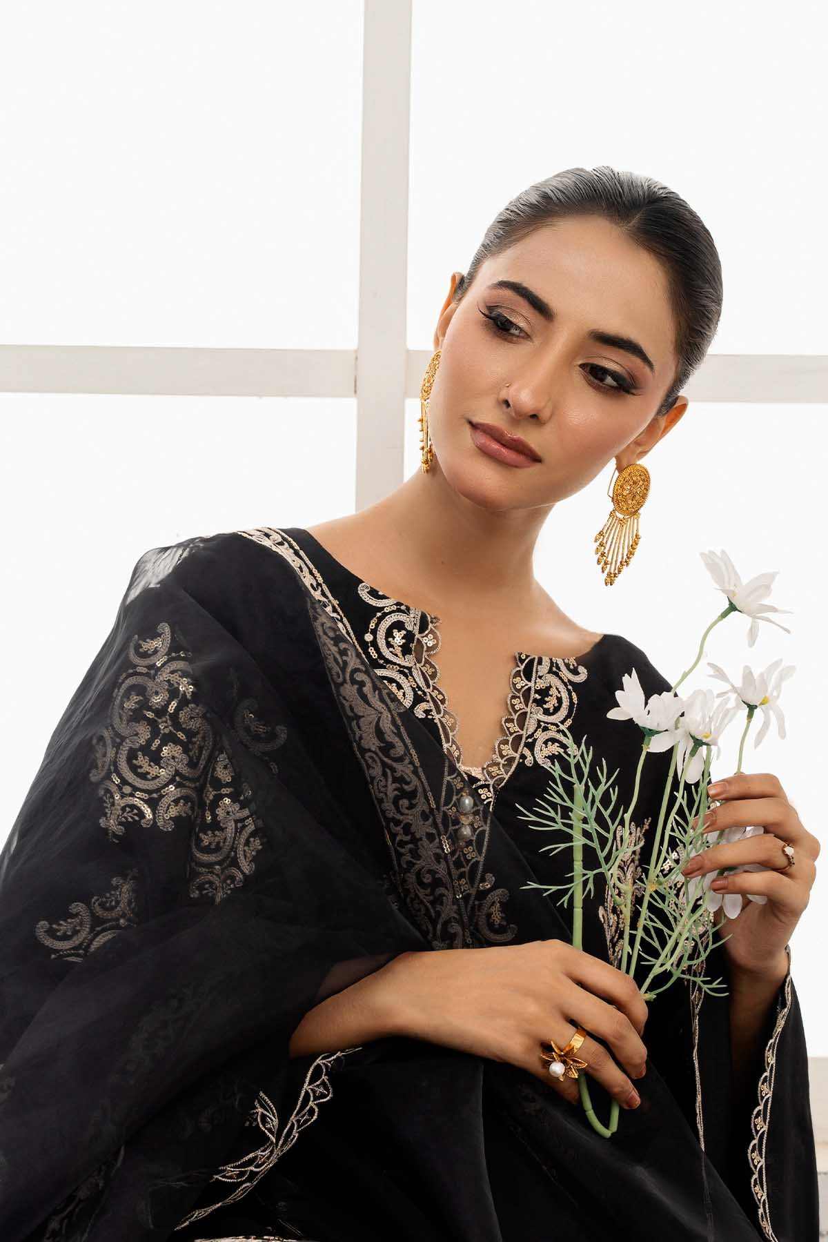 Flora & Fauna Eid Festive A Black Crepe Georgette Mid Length Round Neck Shirt Features Detailed Thread Embroidery With Sequins.Kurta Sleeves With Organza Lace Finishing.The Printed Crepe Georgette Wide Leg Shalwar Finished With Running Stitches And Organza Lace.Paired With Black Organza Dupatta Adorned With Thread And Sequins Embroidery Motifs And Border.