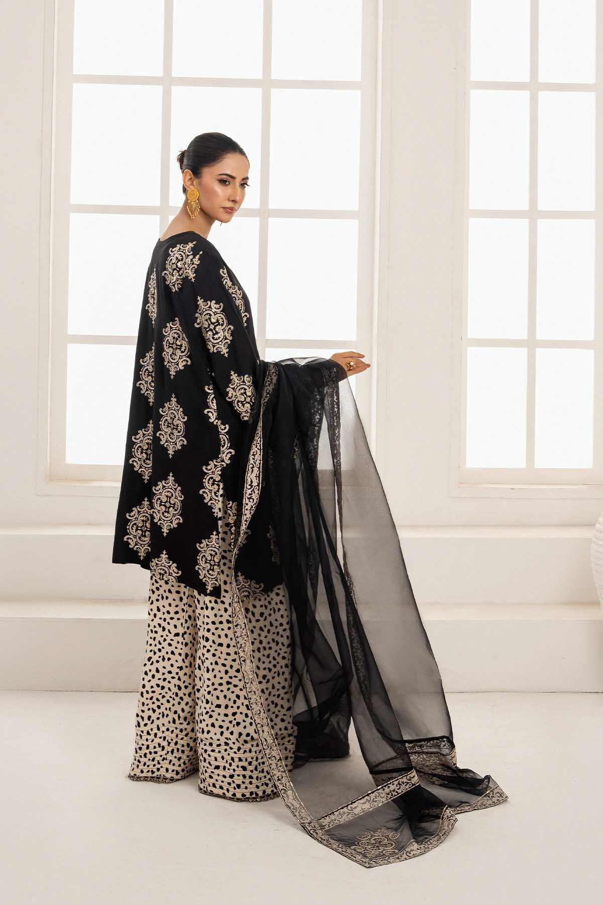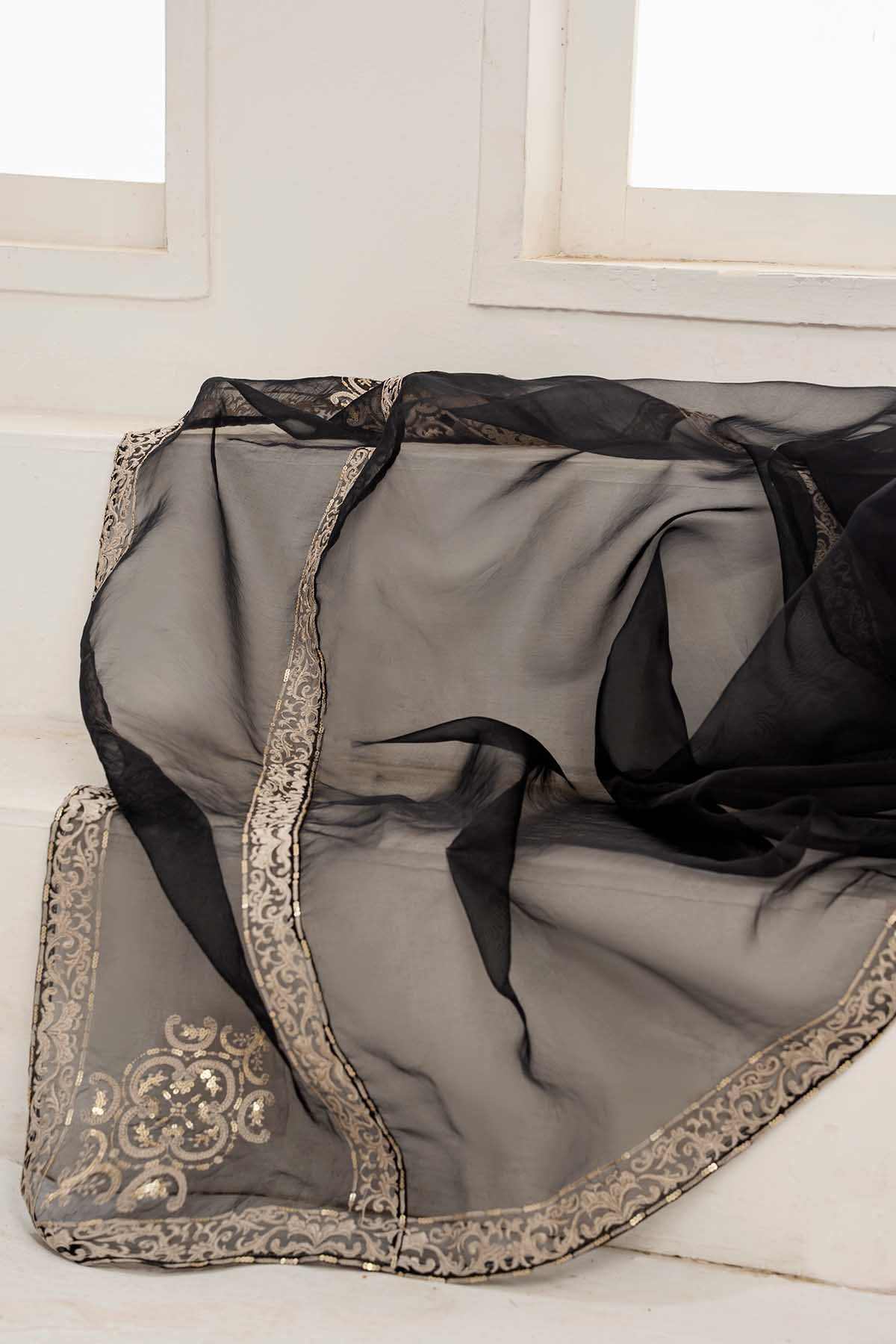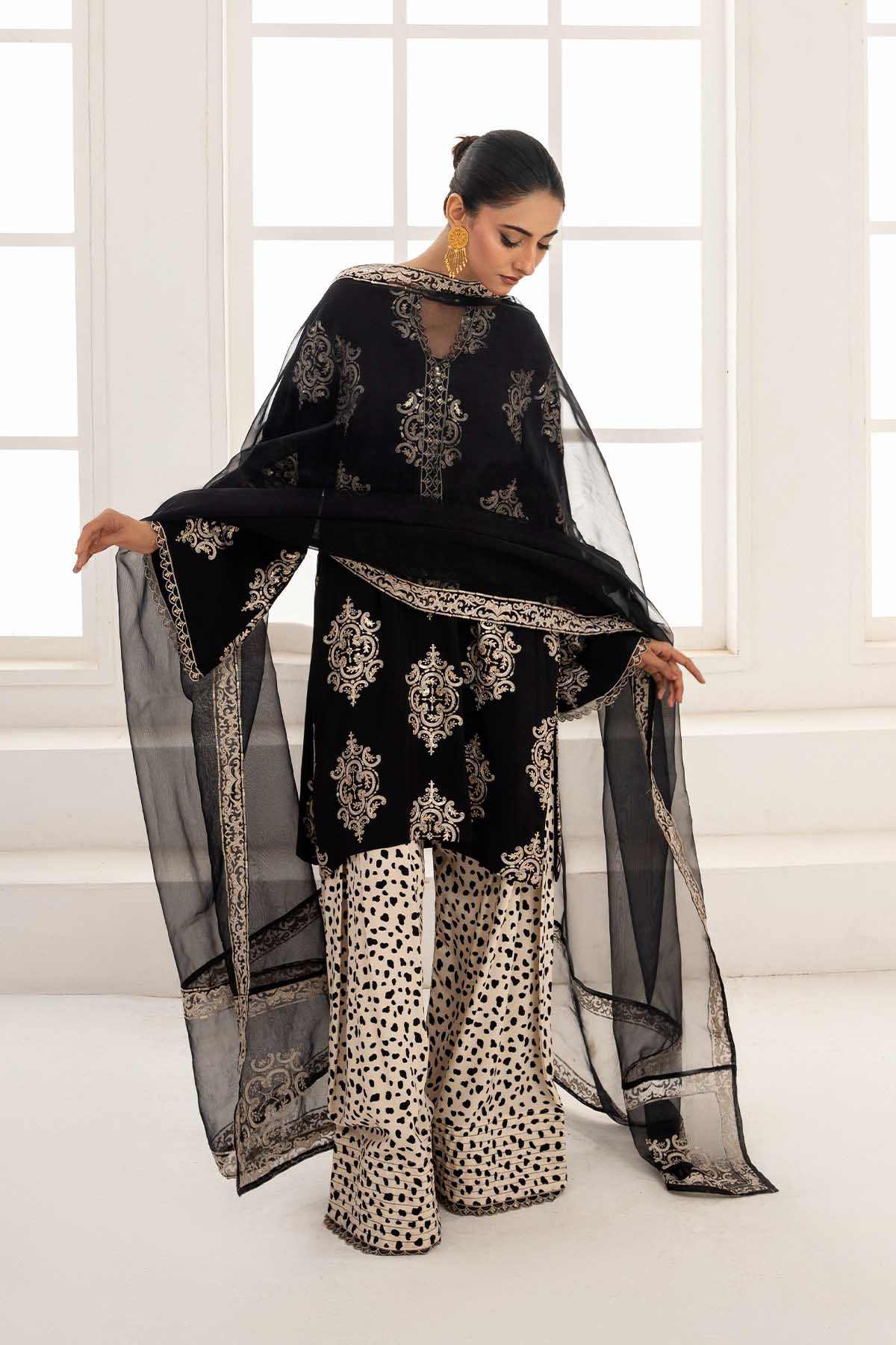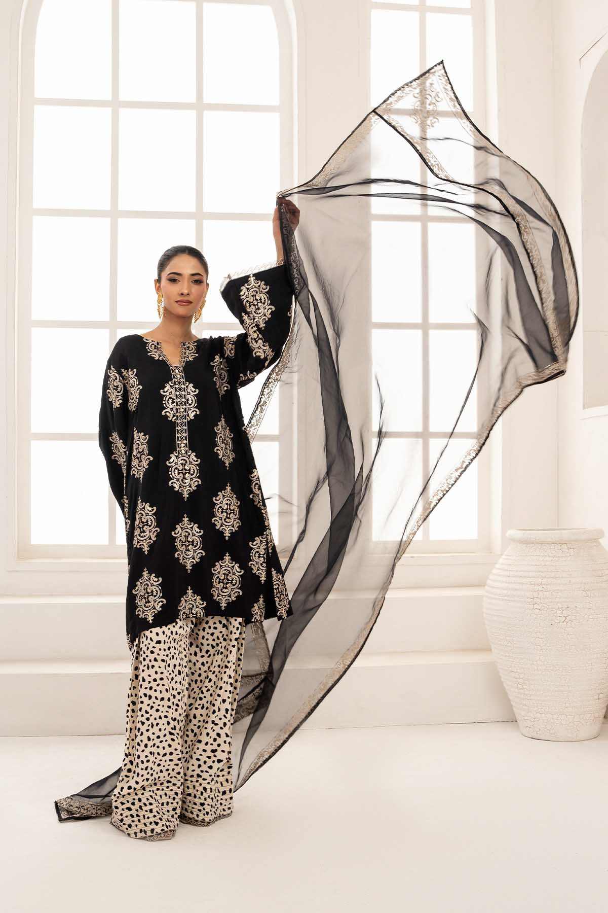 Flora & Fauna Eid Festive A Black Crepe Georgette Mid Length Round Neck Shirt Features Detailed Thread Embroidery With Sequins.Kurta Sleeves With Organza Lace Finishing.The Printed Crepe Georgette Wide Leg Shalwar Finished With Running Stitches And Organza Lace.Paired With Black Organza Dupatta Adorned With Thread And Sequins Embroidery Motifs And Border.