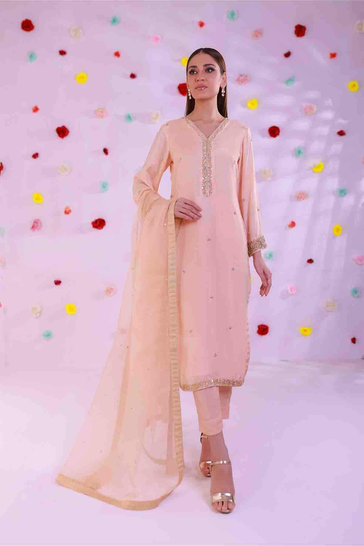 This Elegant Ensemble Pairs A Soft Peach Kattan Cotton-Silk Shirt With Raw Silk Trousers, Offering A Luxurious Blend Of Comfort And Texture. The Rich Fabric Combination Creates A Refined, Sophisticated Look, Perfect For Both Formal And Semi-Formal Occasions.