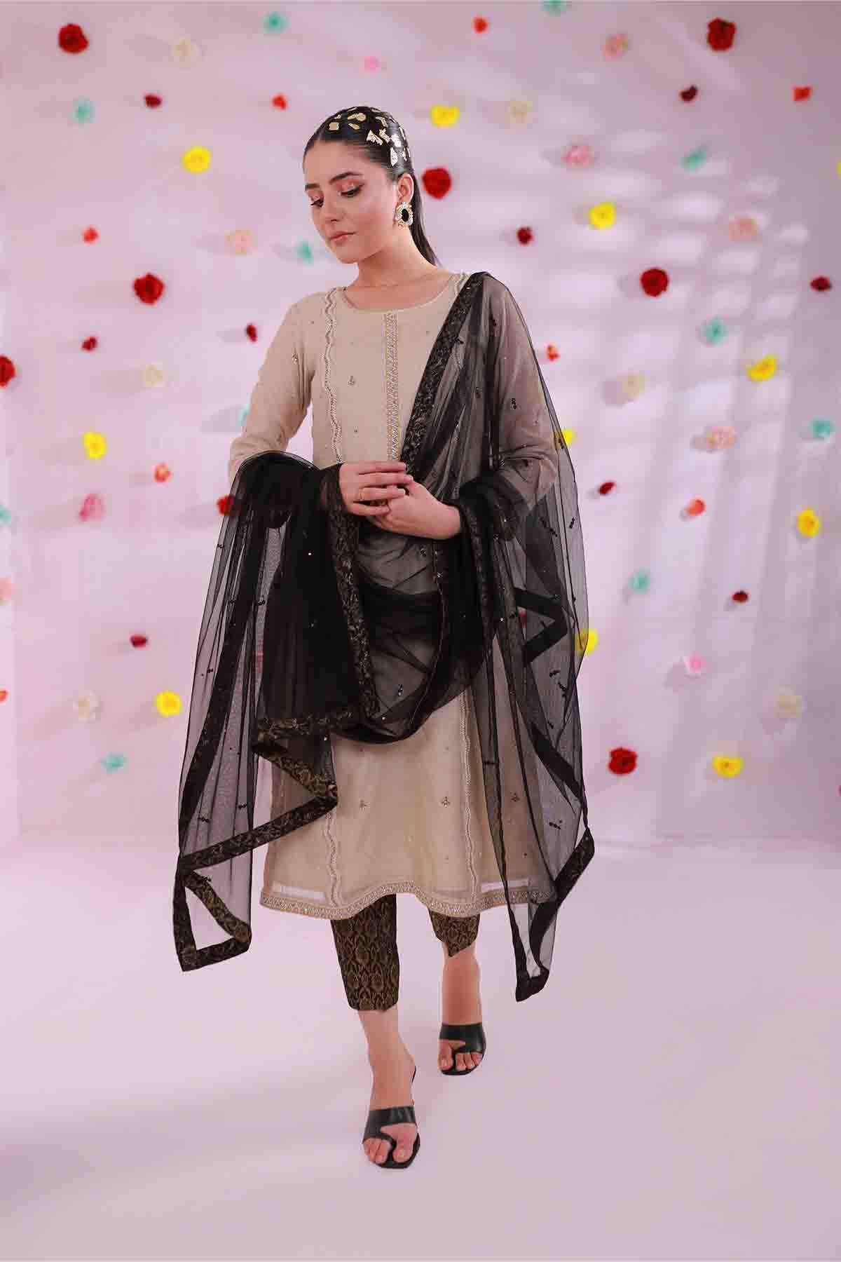 This Elegant Outfit Features A Beige Messuri Cotton Khaddi Shirt Paired With Jamawar Trousers, Offering A Perfect Blend Of Traditional And Contemporary Styles. The Rich Textures And Neutral Color Create A Sophisticated And Timeless Look, Ideal For Formal Occasions.
