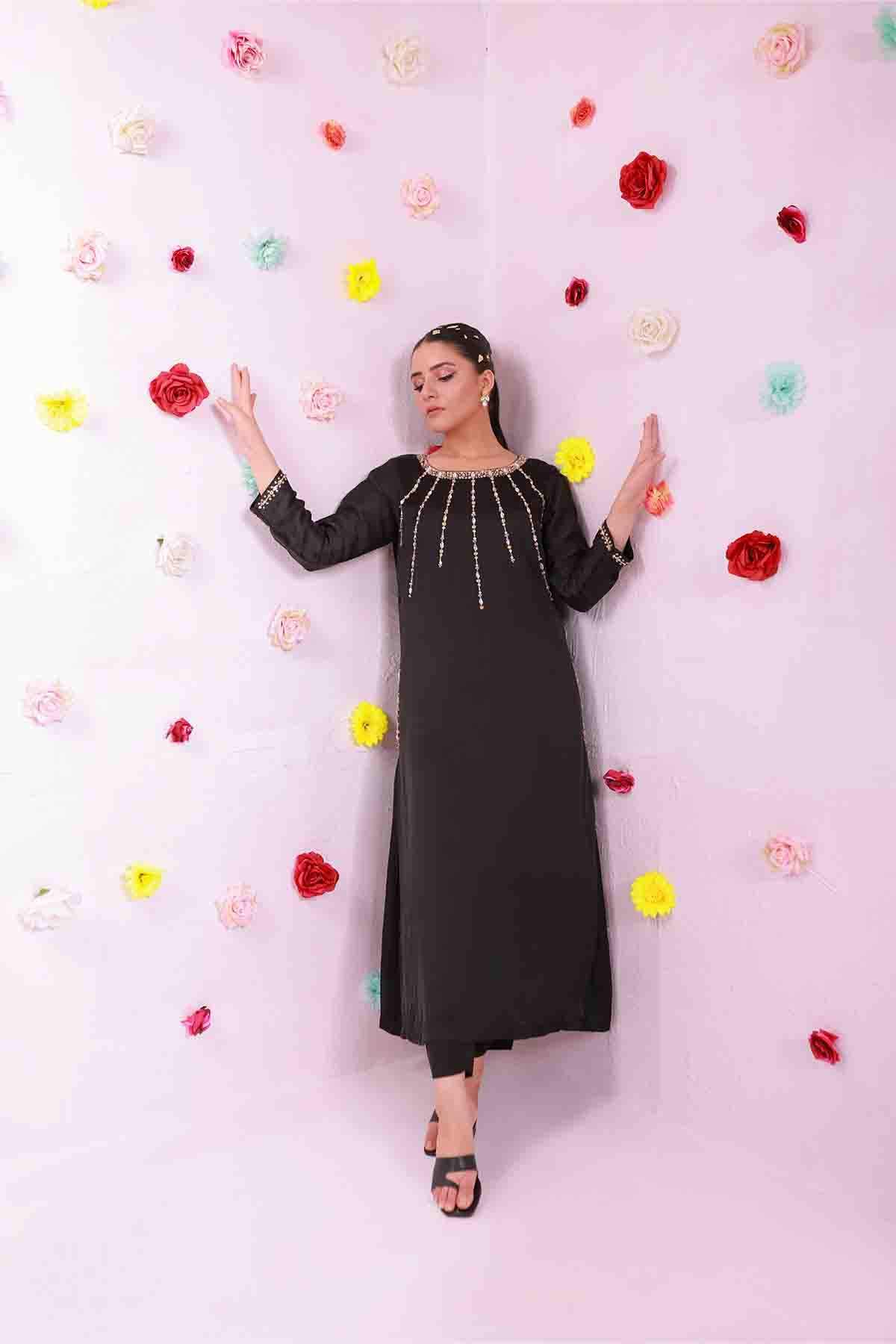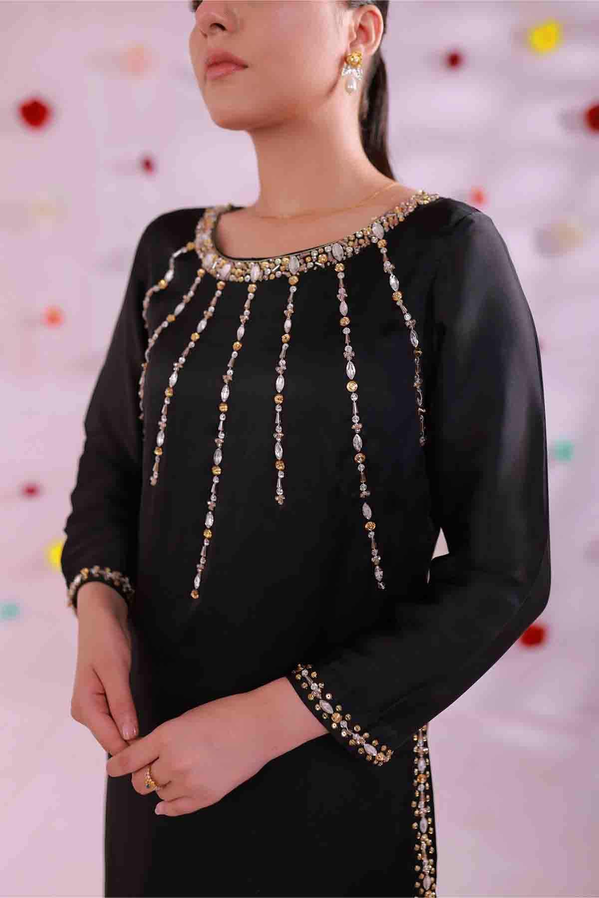 This Elegant Outfit Features A Charmeuse Silk Shirt Paired With Classic Raw Silk Trousers, Both In A Timeless Black Color. The Combination Exudes Sophistication And Is Ideal For Formal Or Evening Wear.