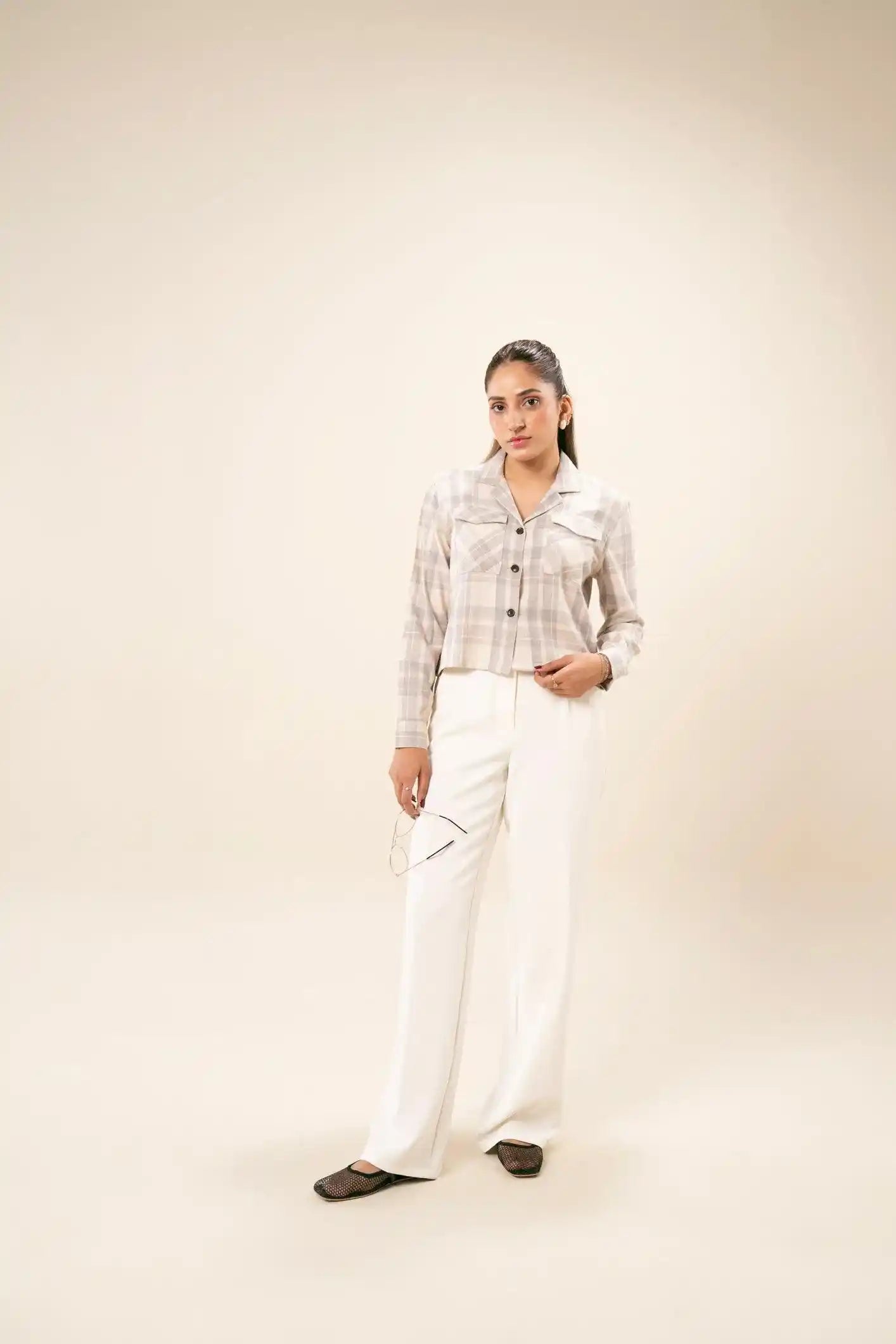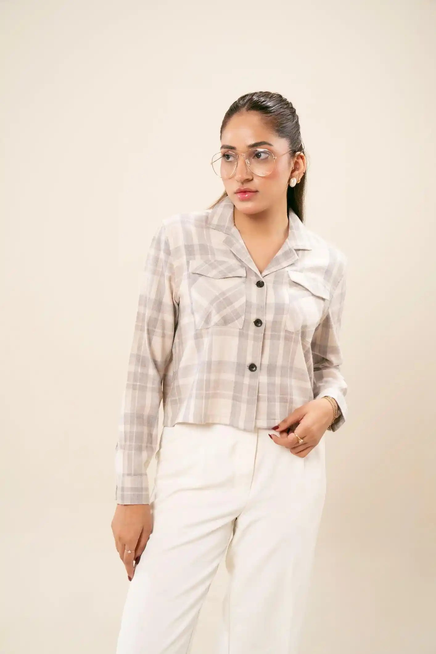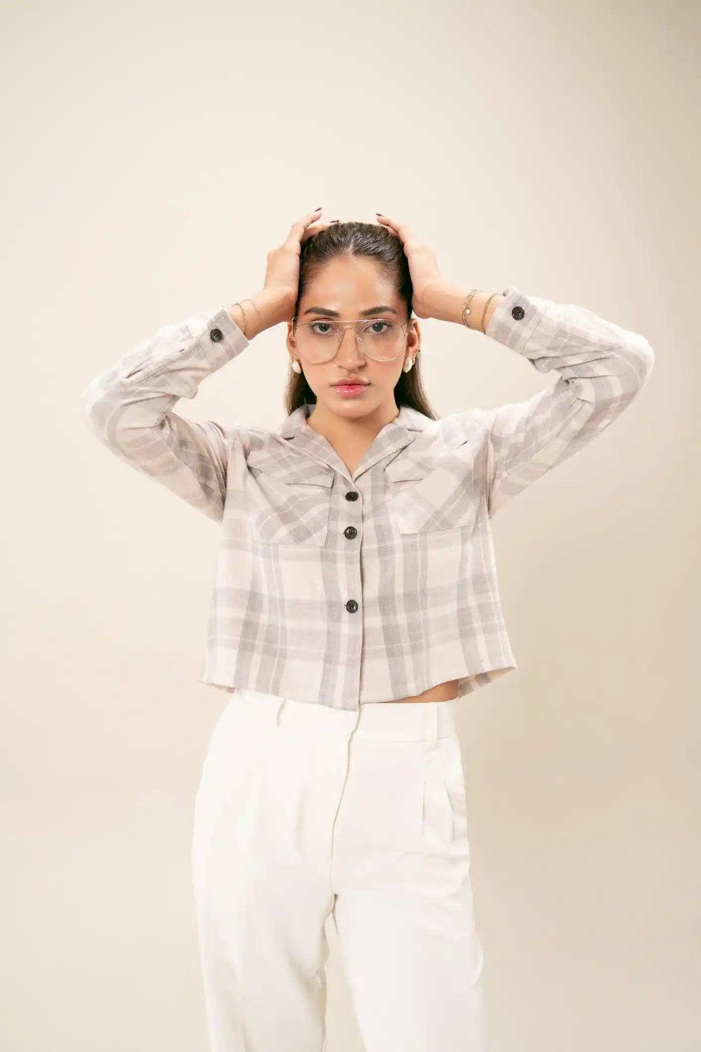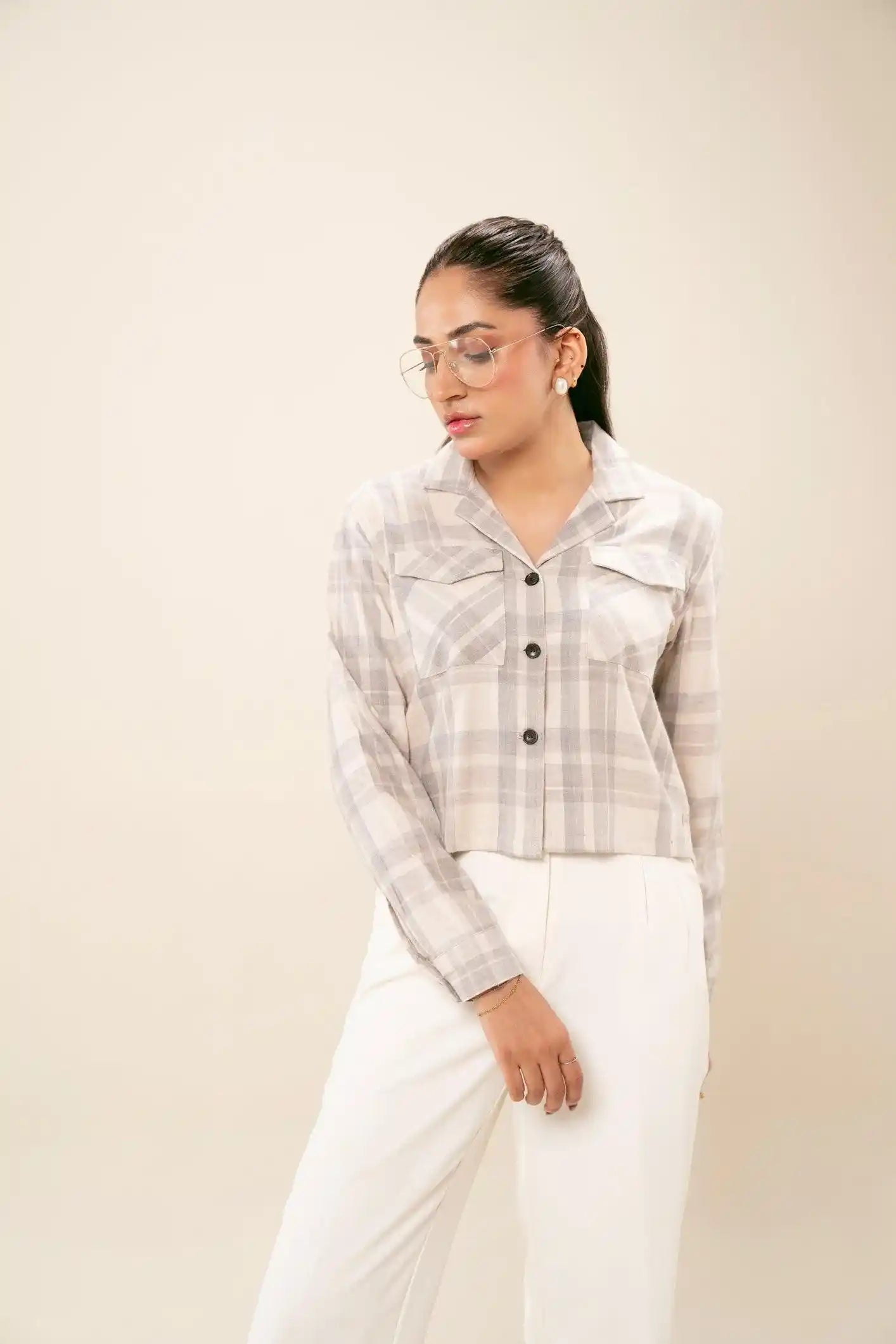 Cropped flannel revere shirt with full sleeves. Classic revere collar and cozy texture. Ideal for a laid-back yet stylish look.