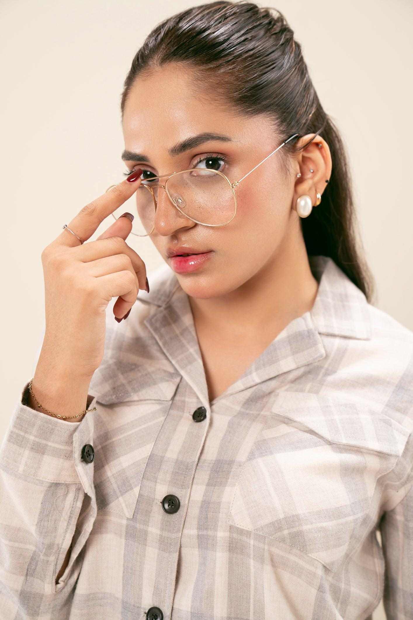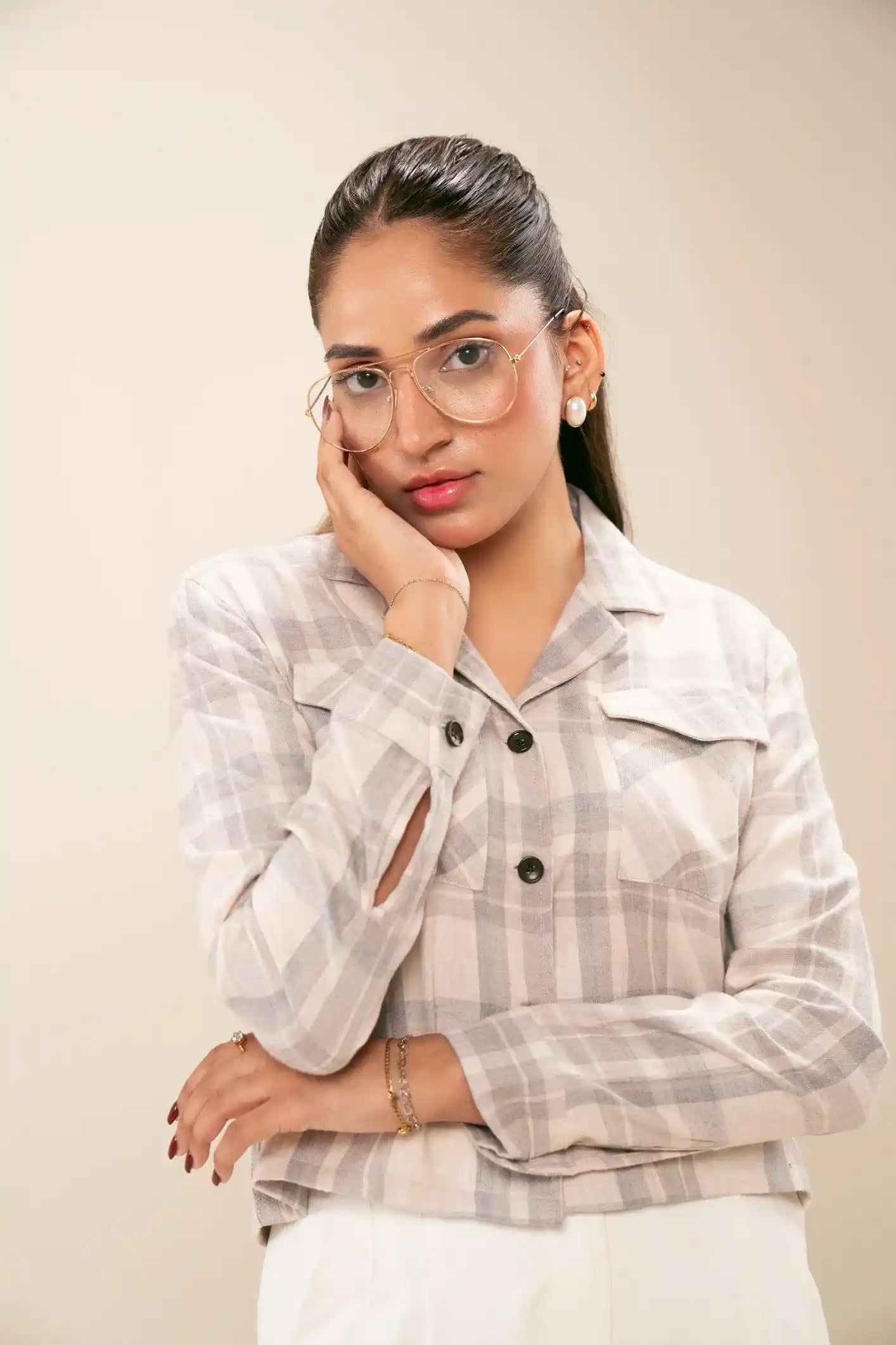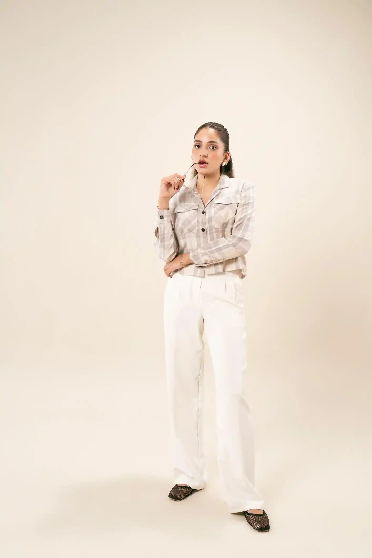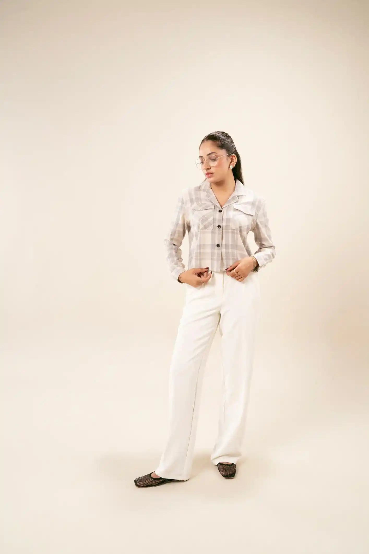 Cropped flannel revere shirt with full sleeves. Classic revere collar and cozy texture. Ideal for a laid-back yet stylish look.