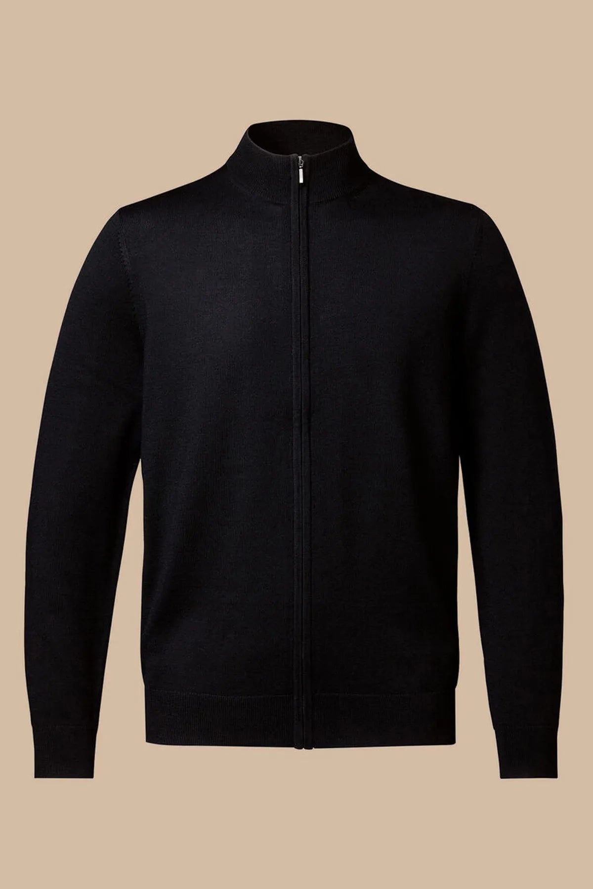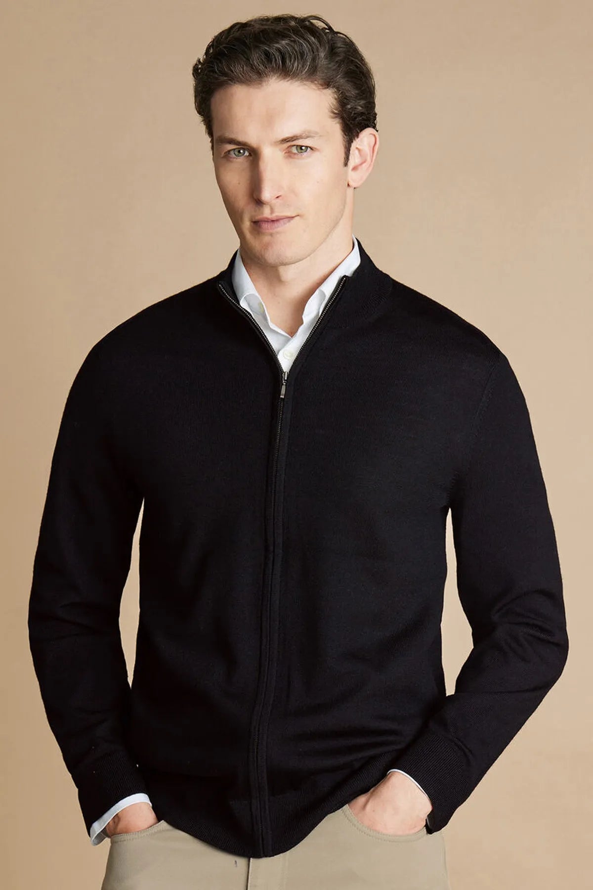 Wool mark-certified, Garment washed, Contrast back neck trim, Zip neck