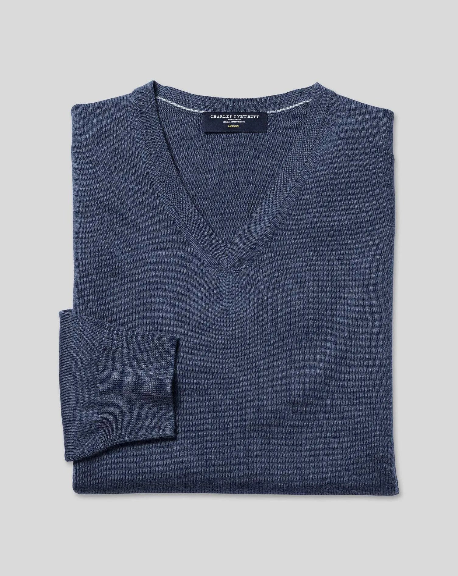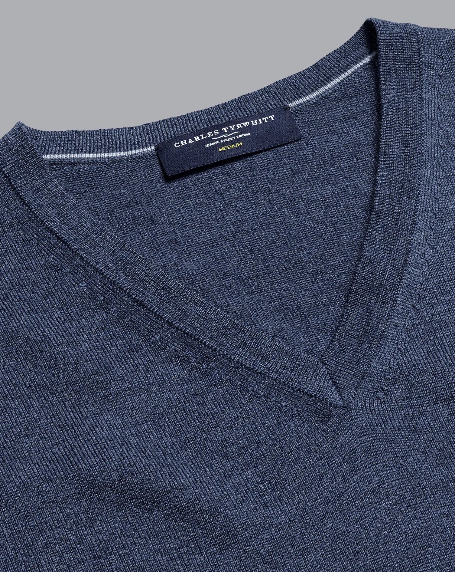 Indigo Blue Melange Pure Merino V Neck Jumper