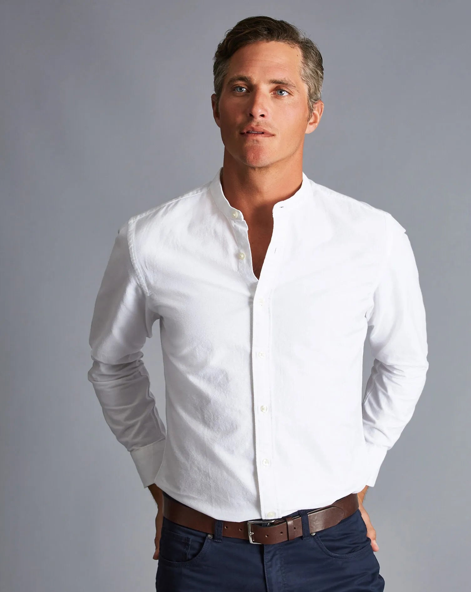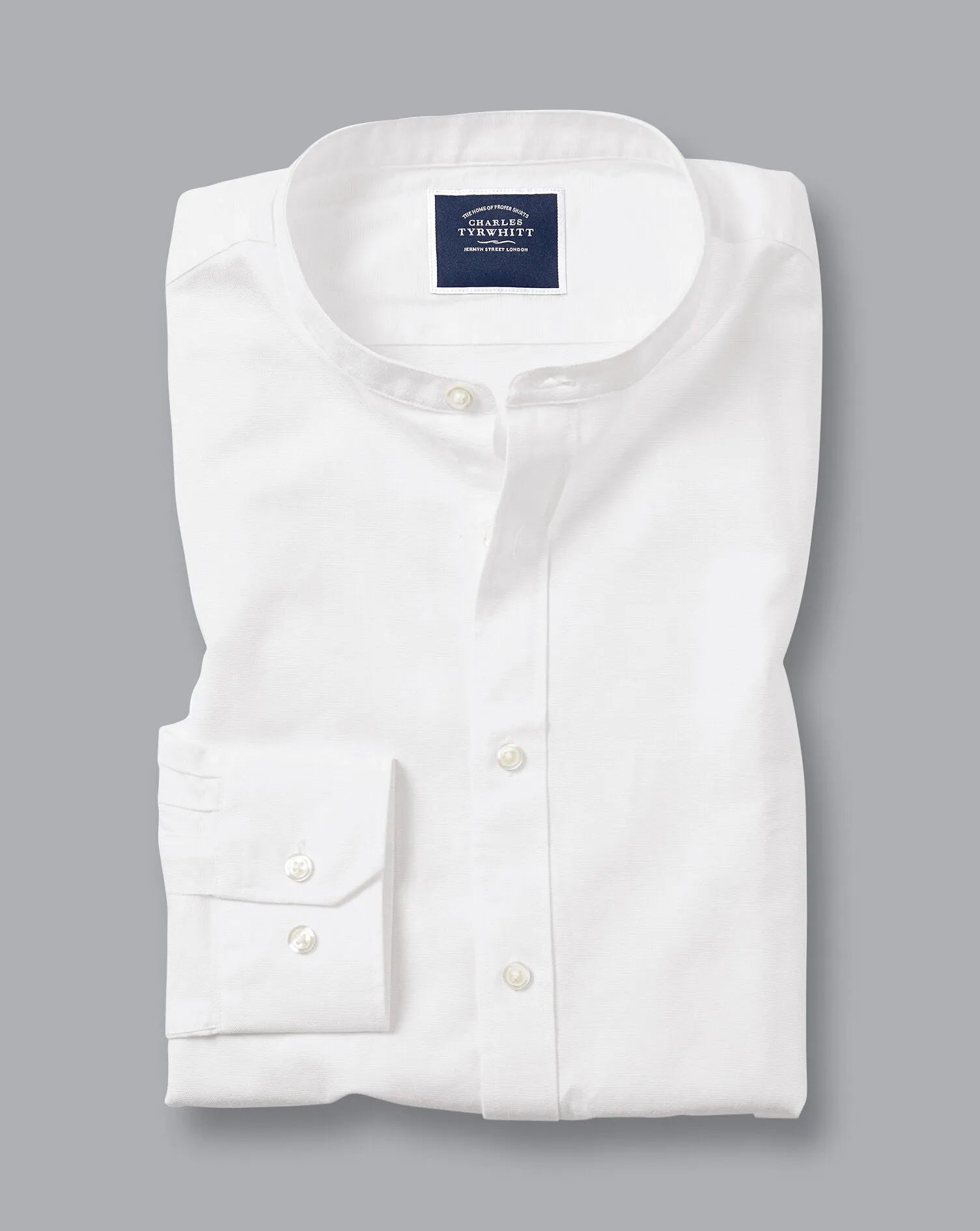 87% cotton, 13% linen Available in slim fit only Collar less Mitered single cuff with two buttons