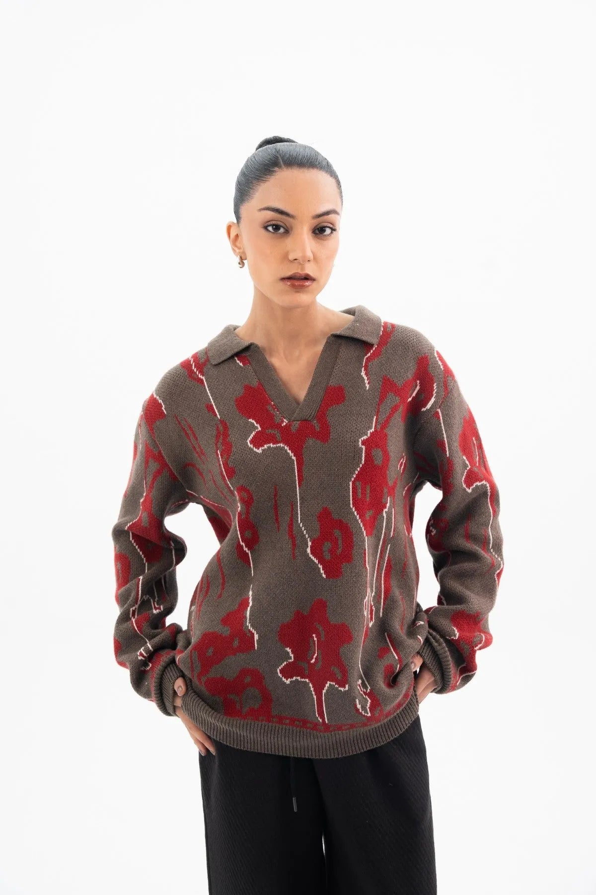 This sweater features a desert palm base color contrasted by red ochre flowers with white highlights. This pattern is created using a high-quality 20 Double Yarn Jacquard knit, giving it unique texture. The wafer-knit 4-panel construction, combined with the relaxed fit and full sleeves, ensures a comfortable drape that holds its shape. It also features a clean johnny collar neckline. Finishing details include sharp ribbed cuffs and a bottom to secure the fit.