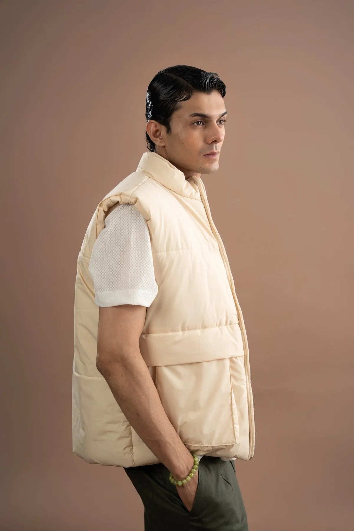 This sleeveless puffer jacket is the best piece for clean, lightweight layering. The outside is made from 100% polyester ripstop, a non-stretch fabric that keeps its shape clean. Inside, we added 200 GSM quilting for real warmth. The whole vest stays lightweight, thanks to the 60–65 GSM shell. It features a quilted band collar and horizontal curve stitching lines across the body. You also get practical cross pockets with a secure snap button, and it closes with a  zip style. The inside is finished with a smooth silk lining and a handy inner pocket. In a refined seed pearl color, this regular fit puffer jacket is ready for whatever you face.