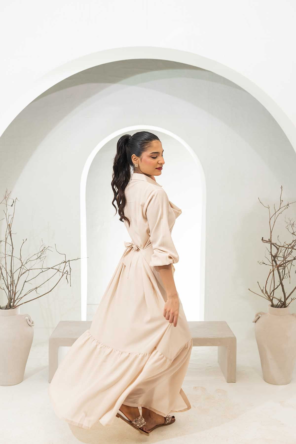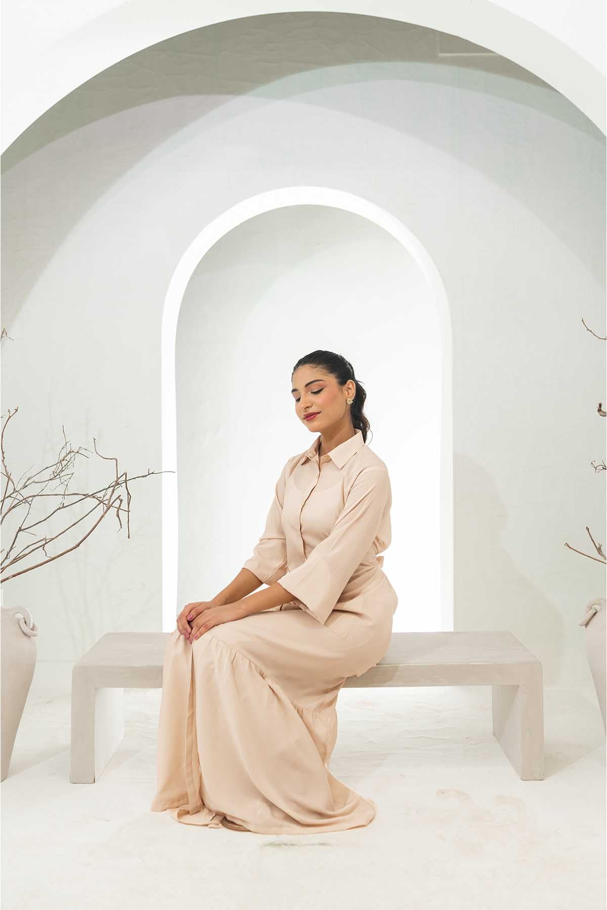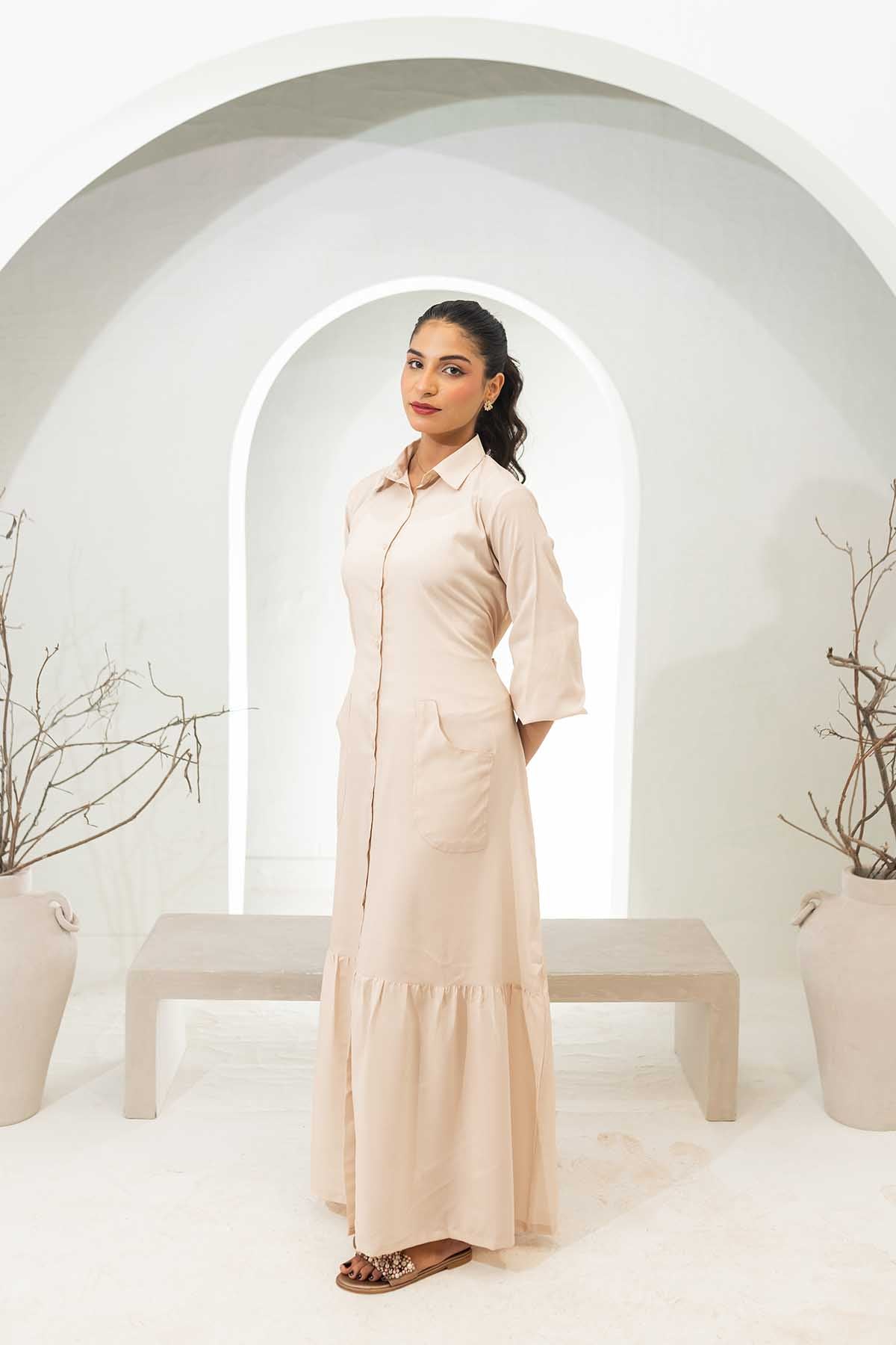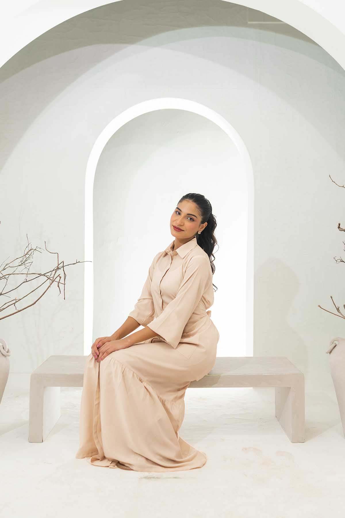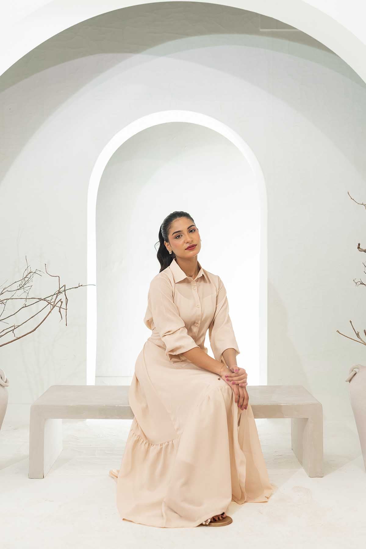 Embrace The Epitome Of Comfort And Style With Our Stunning Bisque Fawn Long Dress. Crafted From Premium, Wrinkle-Free Crepe Fabric. It’S A Shirt Collar Button Down Long Dress With Flattering Cinched Waist And Elastic Detailing On Sleeves.