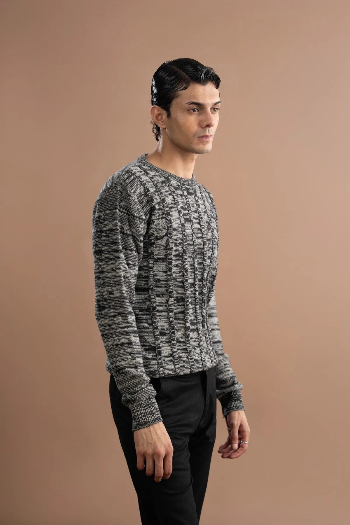 This sweater is built on the Brackets idea of quality and structure with 100% cotton yarn and flat knit panels, but features a truly modern design. The knit uses a self-textured pattern, combining black tones with horizontal white lines and grains. This creates a dense, vertical design that gives the sweater depth and visual energy. It has a classic crew neck and full sleeves in a balanced regular fit, ensuring it keeps your shape clean and while providing comfortable warmth.Â