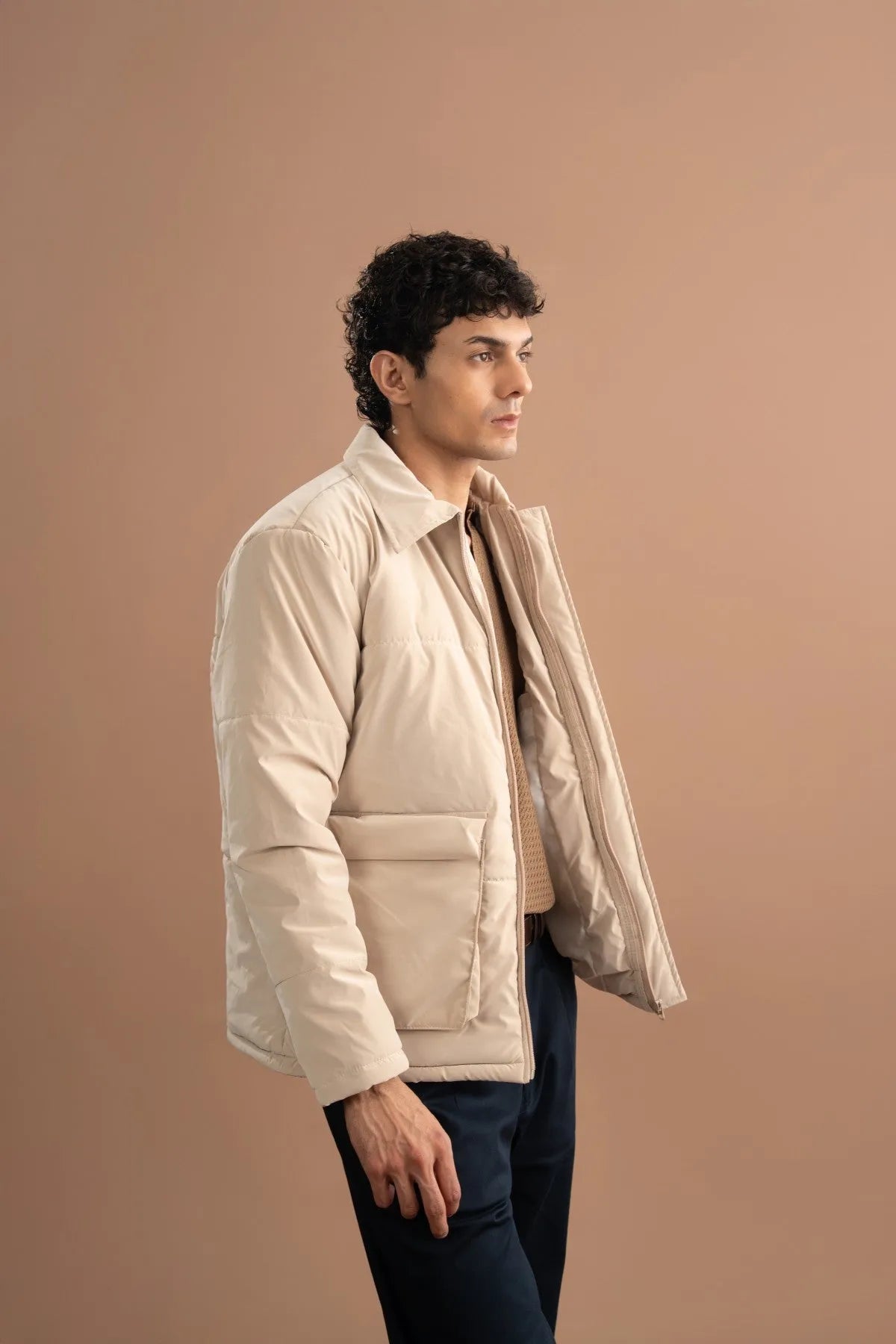 Parachute puffer jacket is ready for the cold. It features a regular fit and a clean collar, made from a 100% nylon parachute shell in seed white. We added 250 GSM quilting for warmth that feels light, not bulky. The design is sharp, with simple horizontal stitching and multiple main storage points: 3D square pockets with flaps on the front and an inner pocket. It also has a full zip front closure with an overlaying flap to block the wind, and a smooth silk lining on the inside for great comfort.