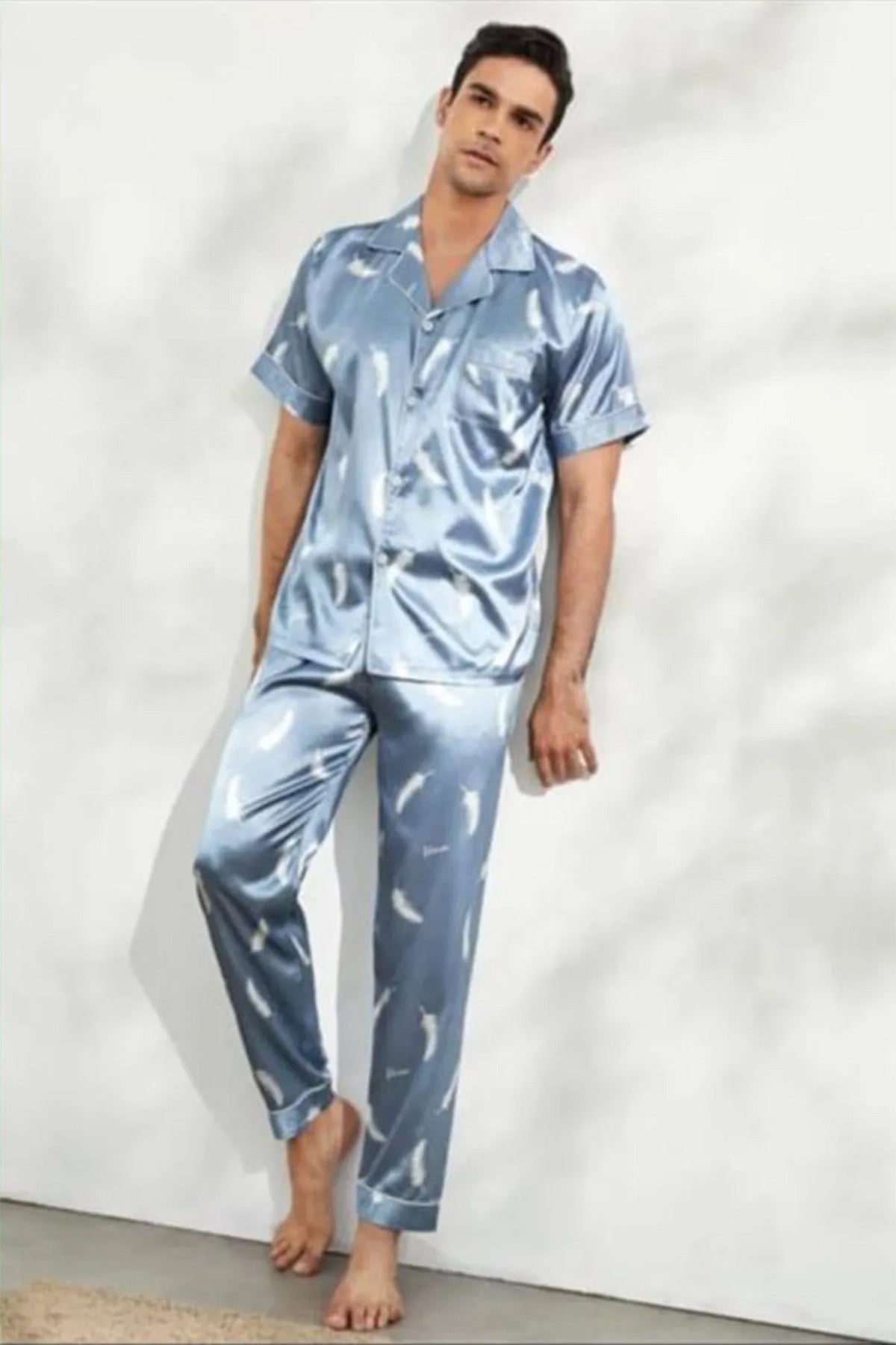 Our Men's Satin Half-Sleeve Pajama Set is nicely tailored with a classic cut. Made of 100% lightweight polyester fabric with a satin weave and silky feel, these men's pajamas feature one front pocket on the chest, a comfortable elastic waistband