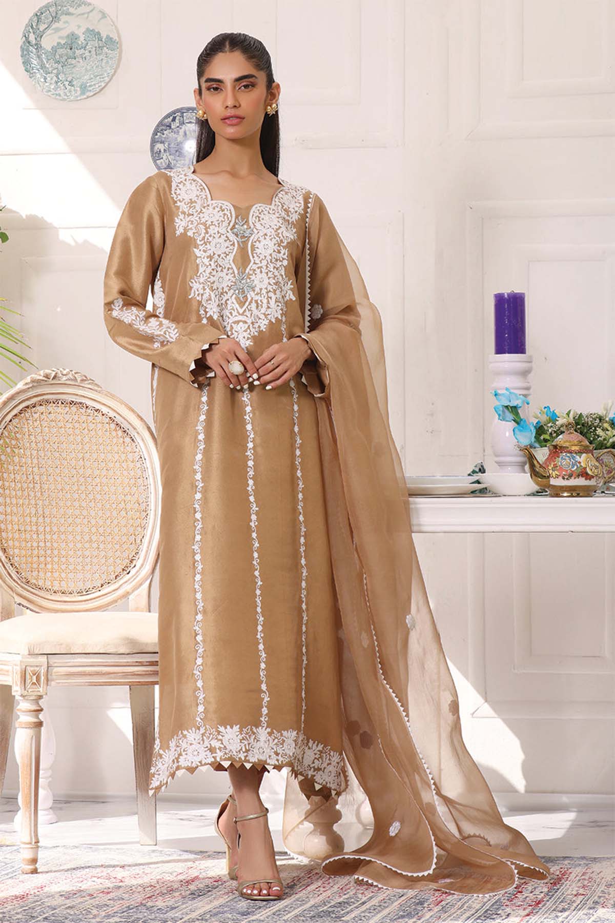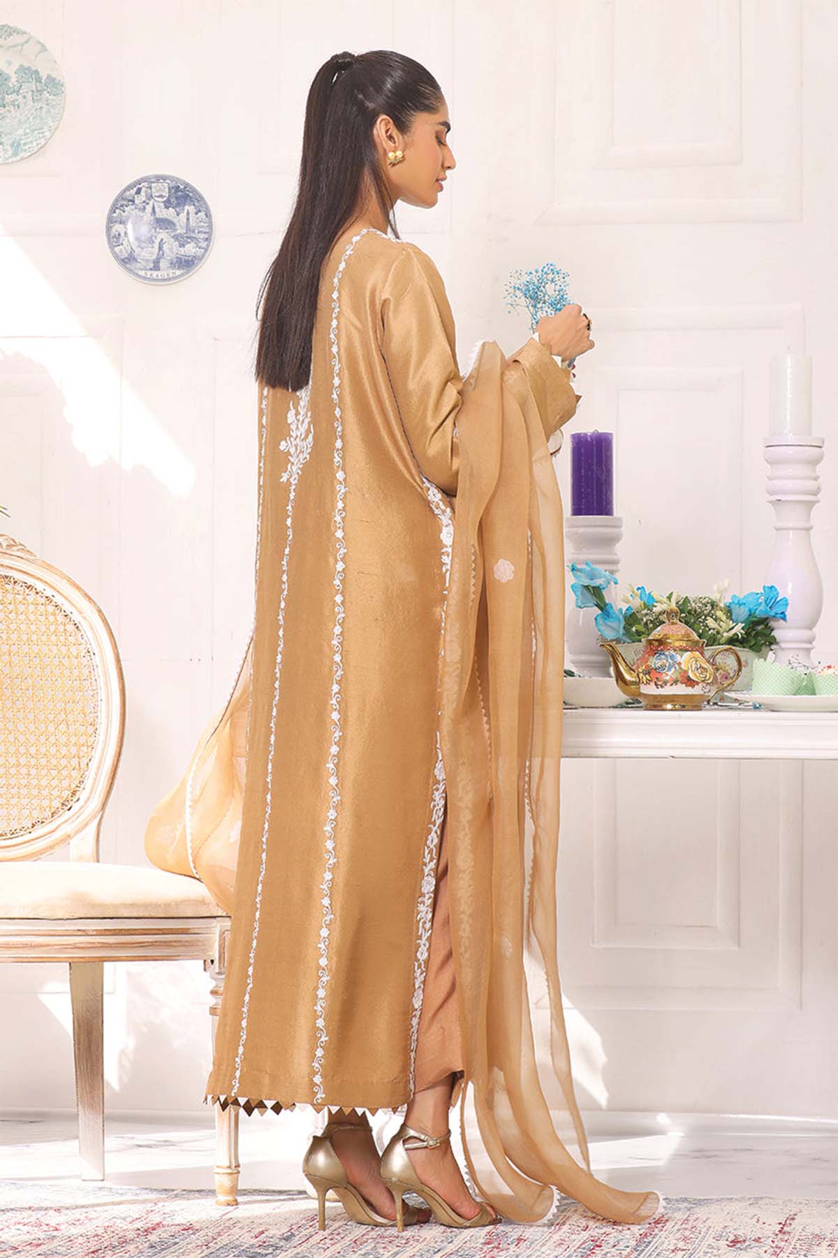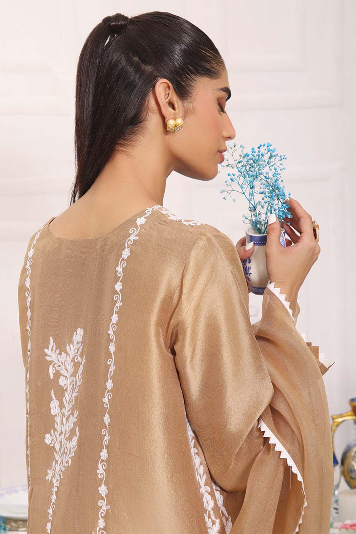 This Luxurious Raw Silk Panel Shirt Intricate Ari Embroidery Front And Back That Is Delicately Handcrafted To Perfection Detailed With Namak Para Lace Which Is Handmade Embellished With Handmade Buttons, Paired With Embroidered Organza Dupatta And Straight Trouser