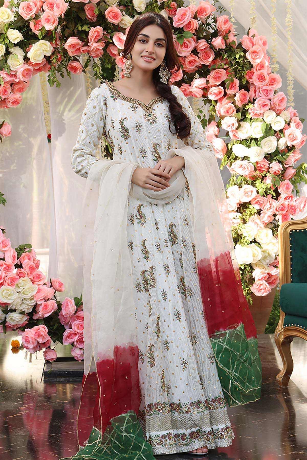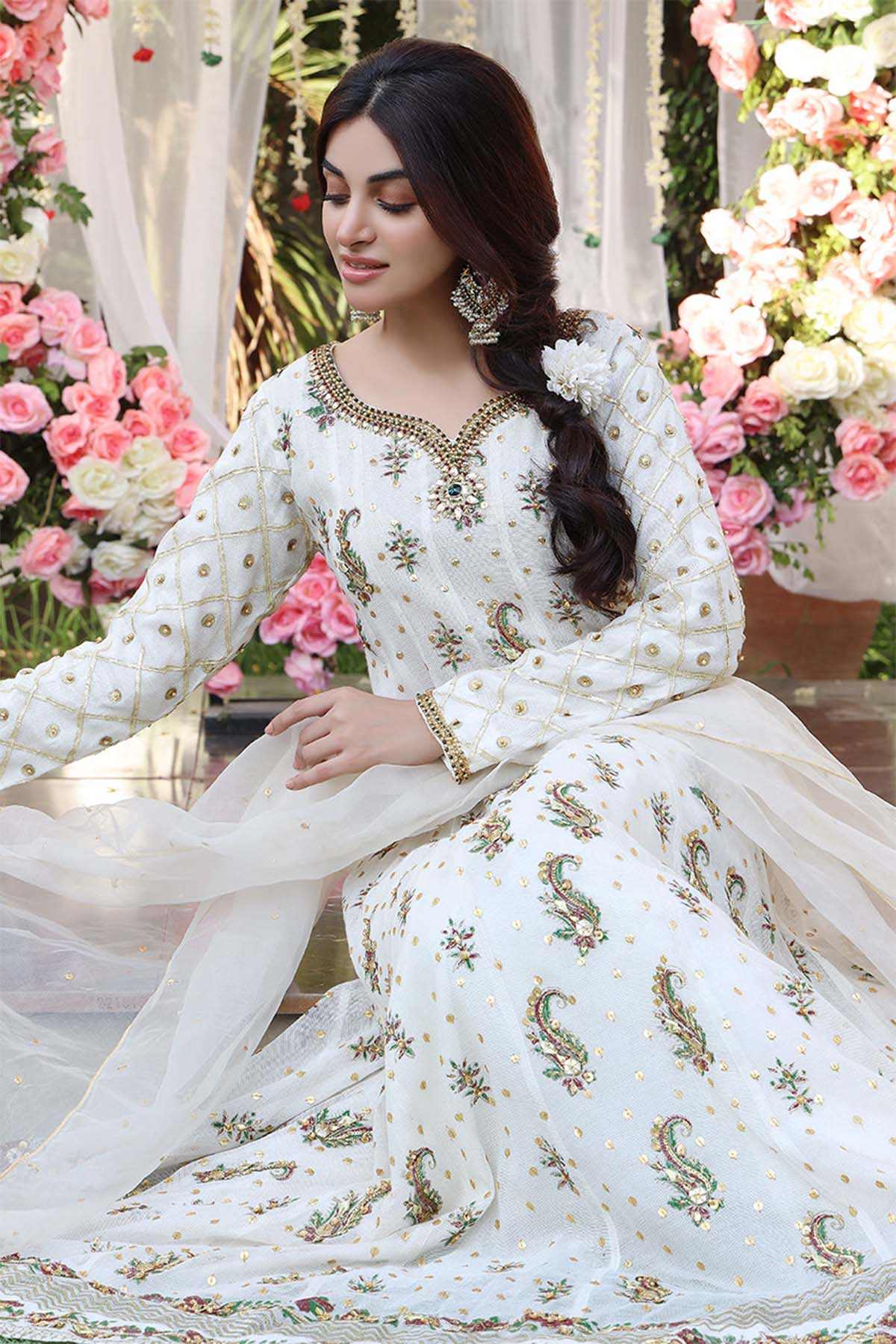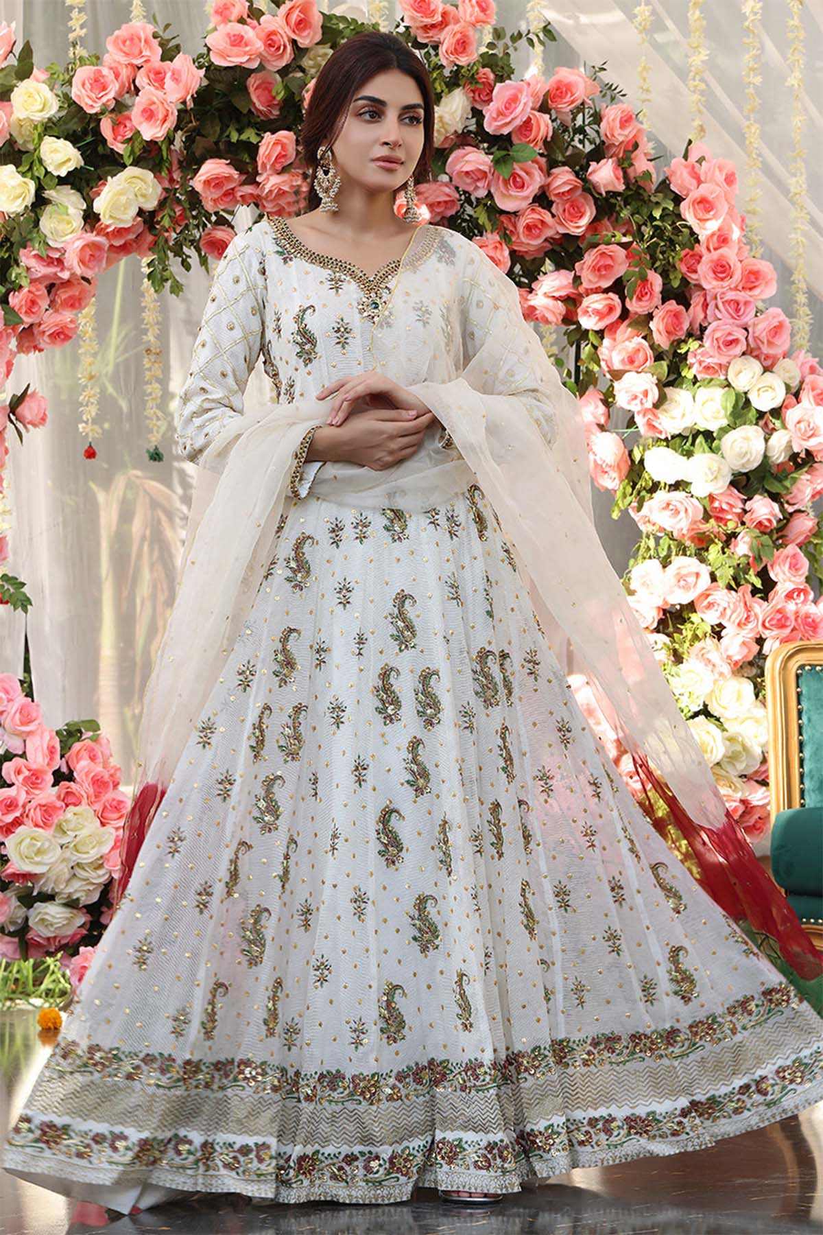 A Floor-Length Kalidar Made Of White Cotton Net Showcases Exquisite Block Printing, Embellished With Gotta And Zardozi Embroidery On The Neck, Adorned With Stones. It Is Paired With An Organza Dupatta To Complement The Ensemble.