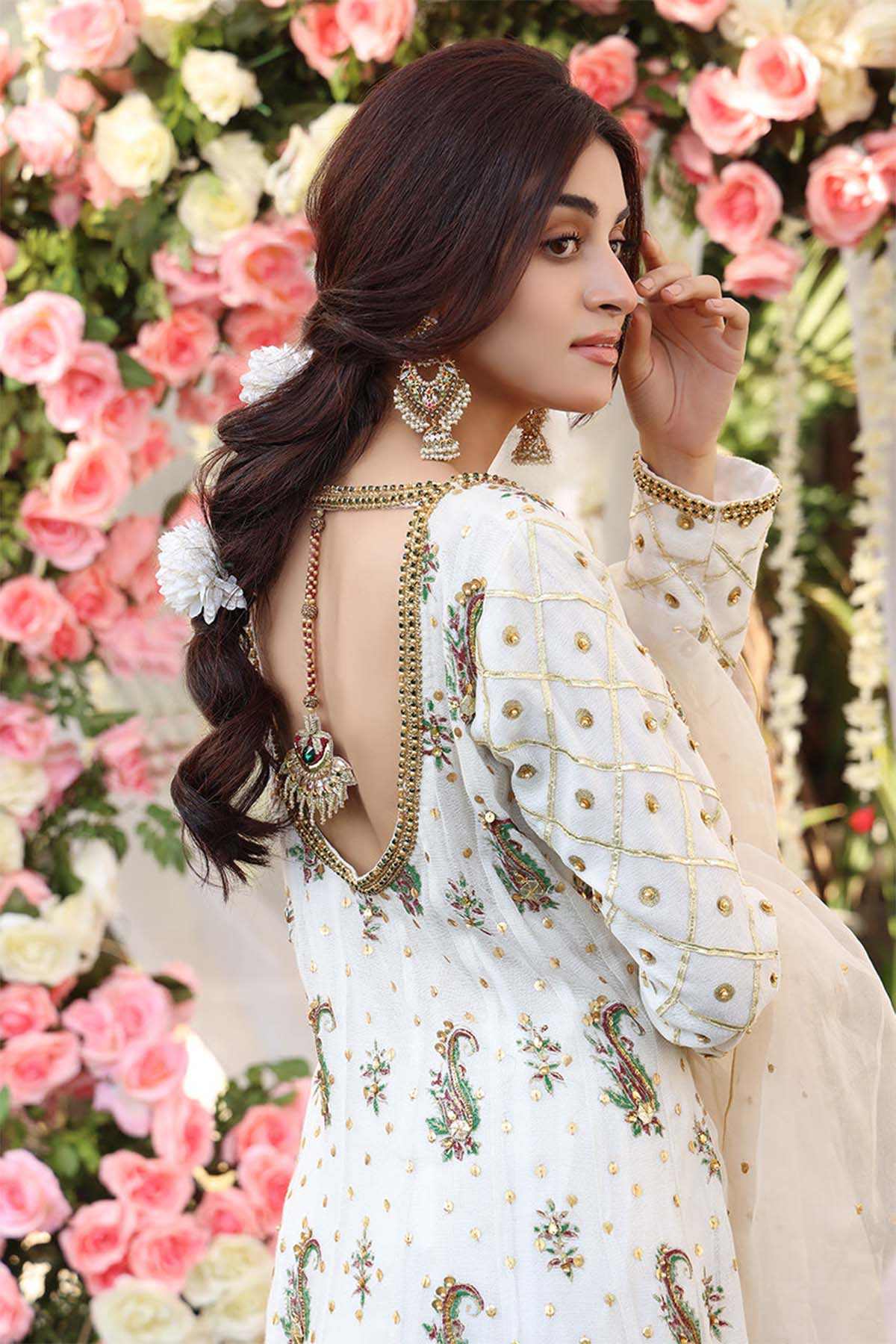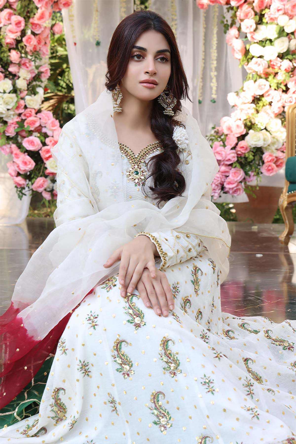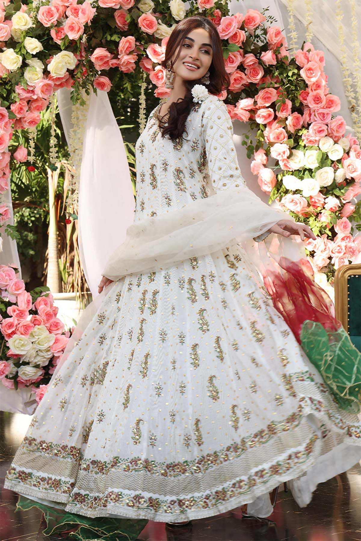 A Floor-Length Kalidar Made Of White Cotton Net Showcases Exquisite Block Printing, Embellished With Gotta And Zardozi Embroidery On The Neck, Adorned With Stones. It Is Paired With An Organza Dupatta To Complement The Ensemble.