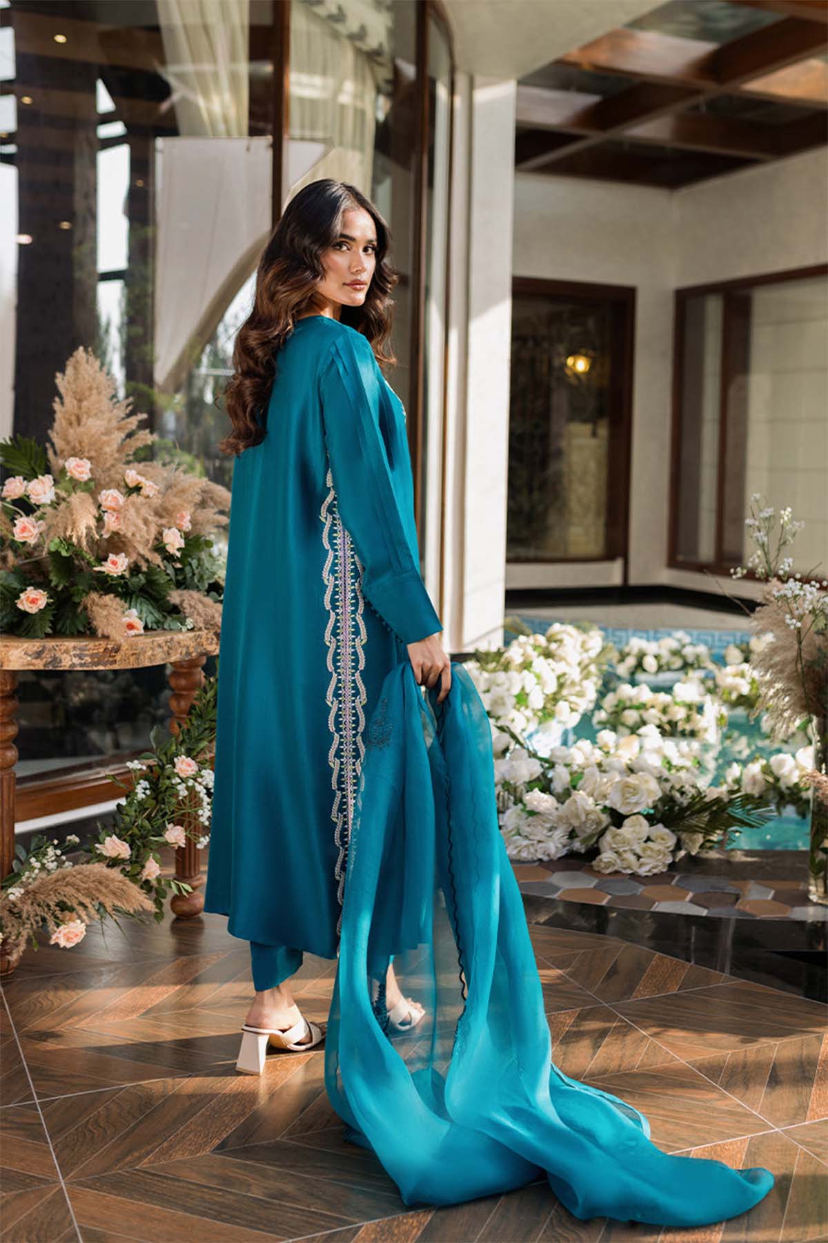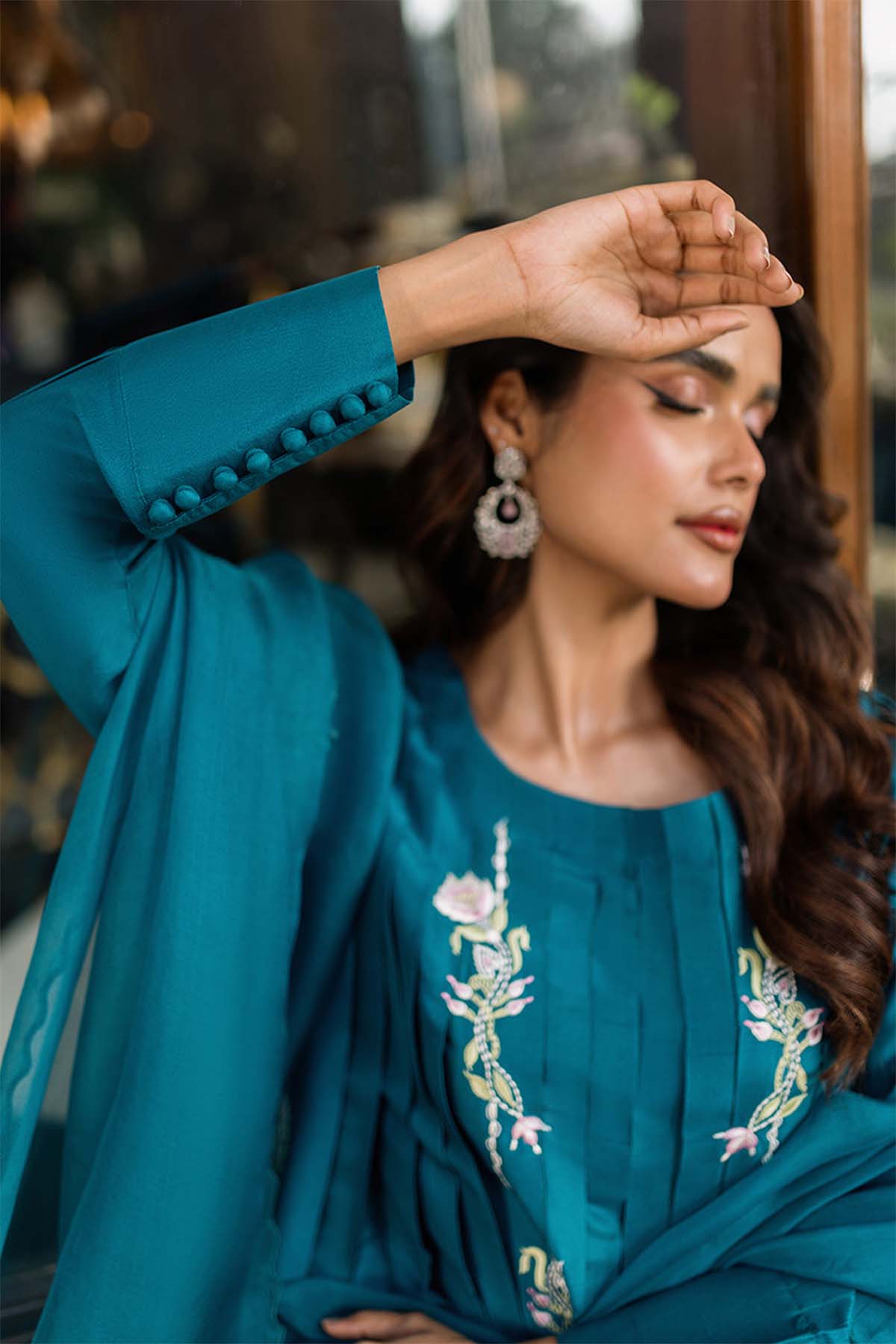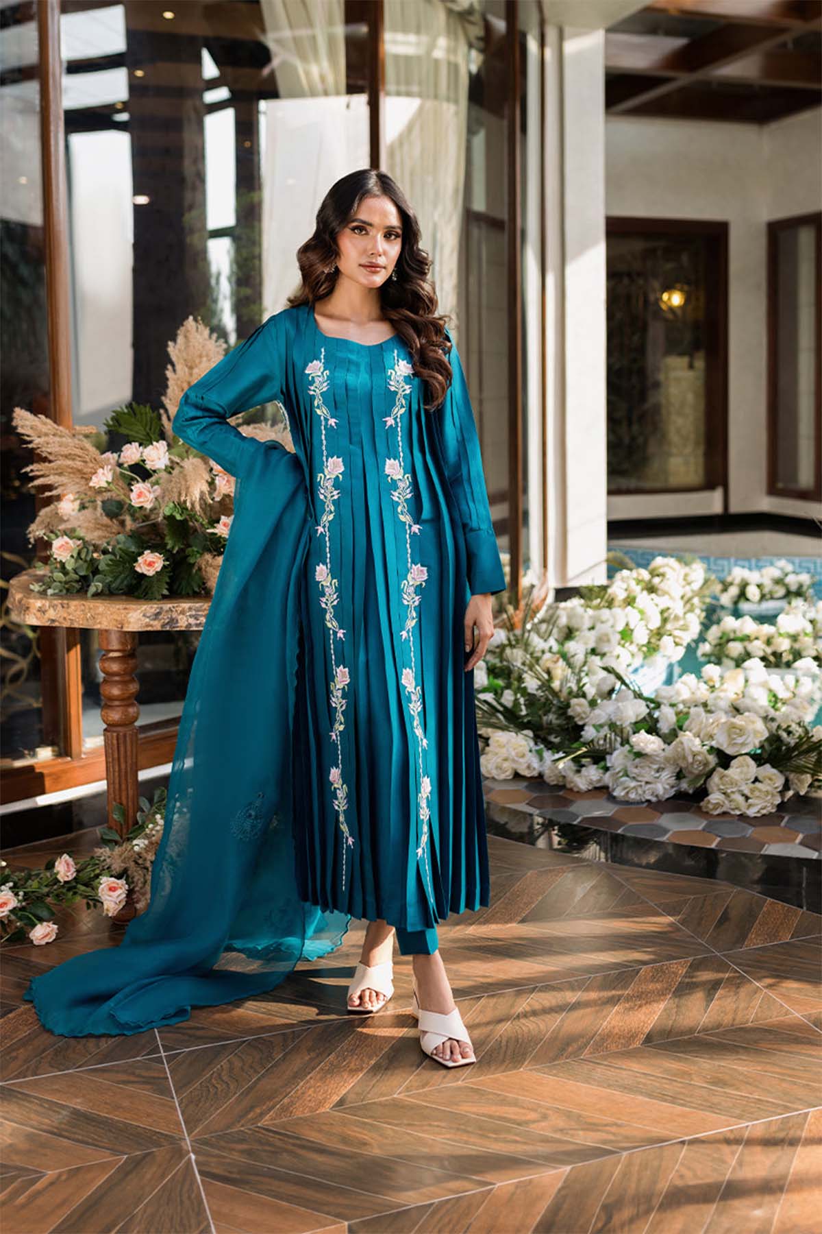 Indulge In Luxury With Pleated Raw Silk Shirt, Adorned With Embroidered Bunch Detailing And A Delicate Side Border. The Loops Button Closure Adds A Touch Of Elegance To The Neckline, Creating A Refined Look. Paired Seamlessly With Raw Silk Straight Trousers, This Ensemble Exudes Sophistication. Complete The Allure With An Organza Dupatta, Making A Statement Of Grace And Style. Elevate Your Wardrobe With This Luxurious Ensemble, Where Every Pleat And Embellishment Tells A Story Of Refined Elegance And Timeless Charm.