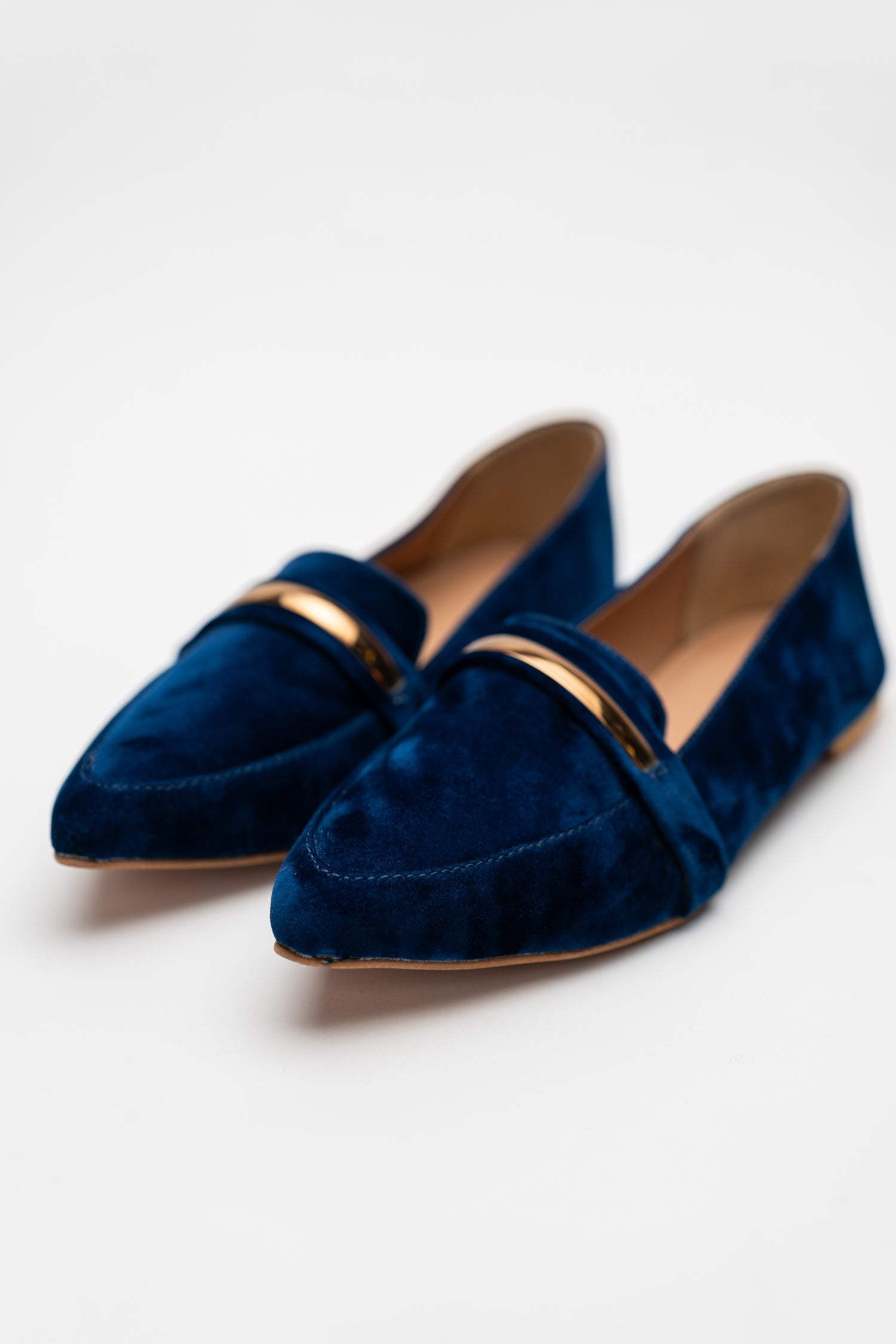 These deep blue pointed-toe flats bring instant polish with their soft suede-effect finish and sleek gold strap detail. Comfortable, modern, and easy to style  the perfect upgrade for denim days, office fits, and everything in between.