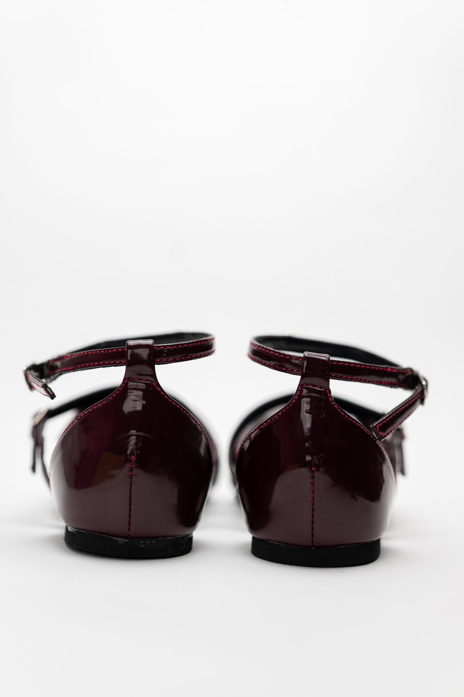 These burgundy pointed-toe flats bring instant edge with their multi-strap design and sleek glossy finish. Lightweight, comfortable, and statement-ready  perfect for days when you want your footwear to do the talking.