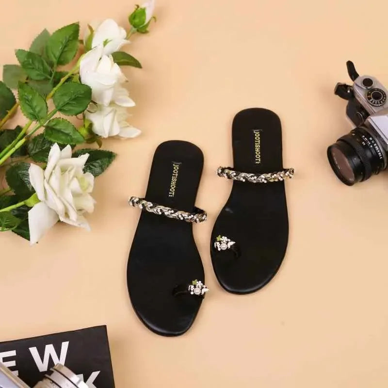 Dark and dazzling, these black slip-ons fuse boldness with elegance. The braided strap adds texture, while the jeweled toe ring catches the light like a secret. Ideal for evening wear or statement daytime looks.