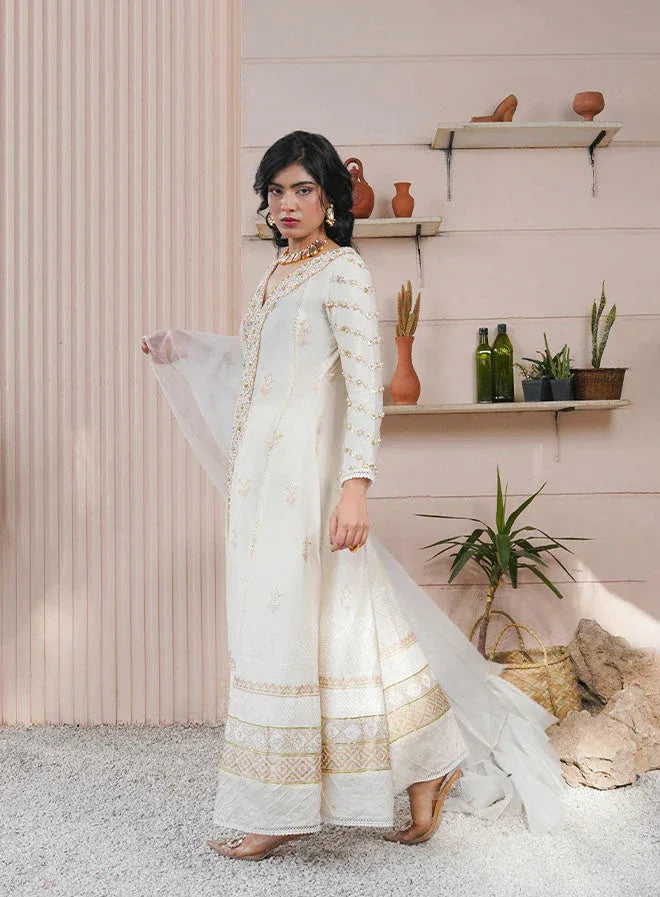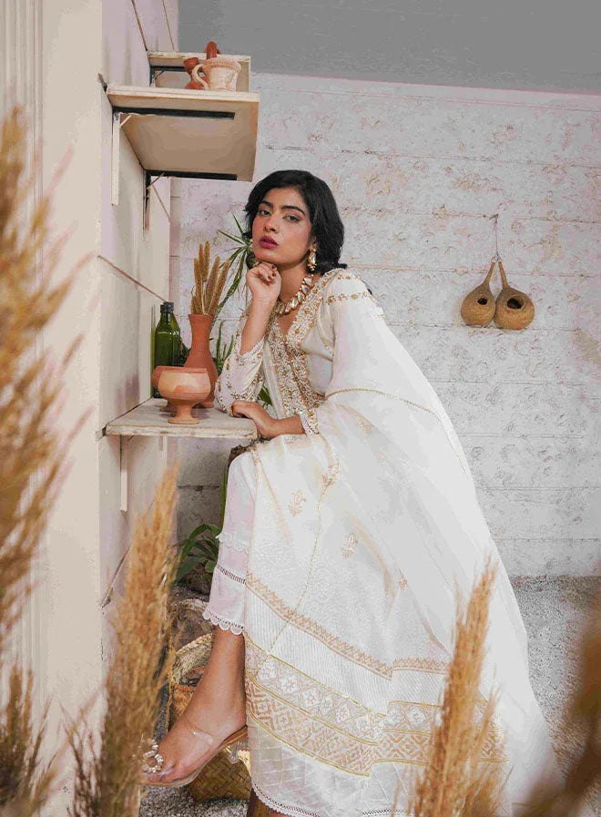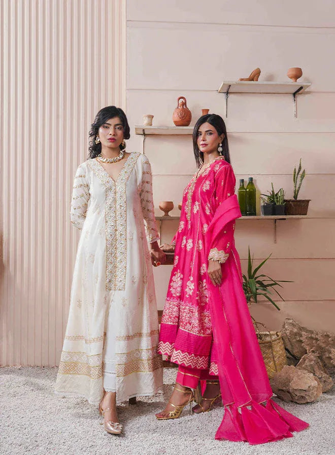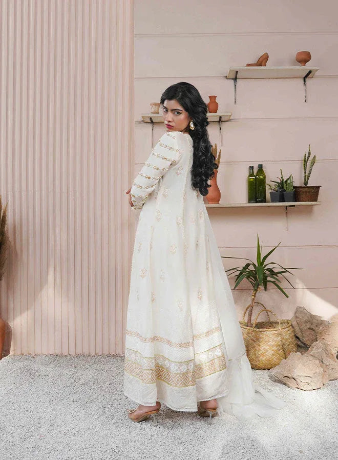 Presenting a must-have collection filled with distinctive, quintessentially Kehkeshan prints, masterfully tailored to be worn and cherished for years to come. This off-white cotton silk gown features artfully illustrated block-printed floral motifs, exuding elegance and grace. The neckline is delicately hand-worked, adding an intricate touch to the design.