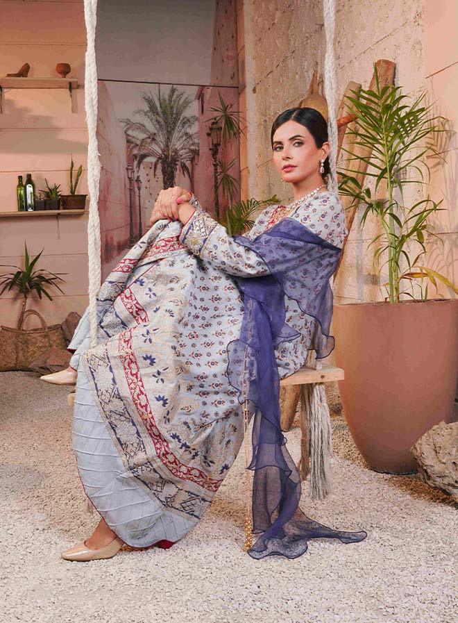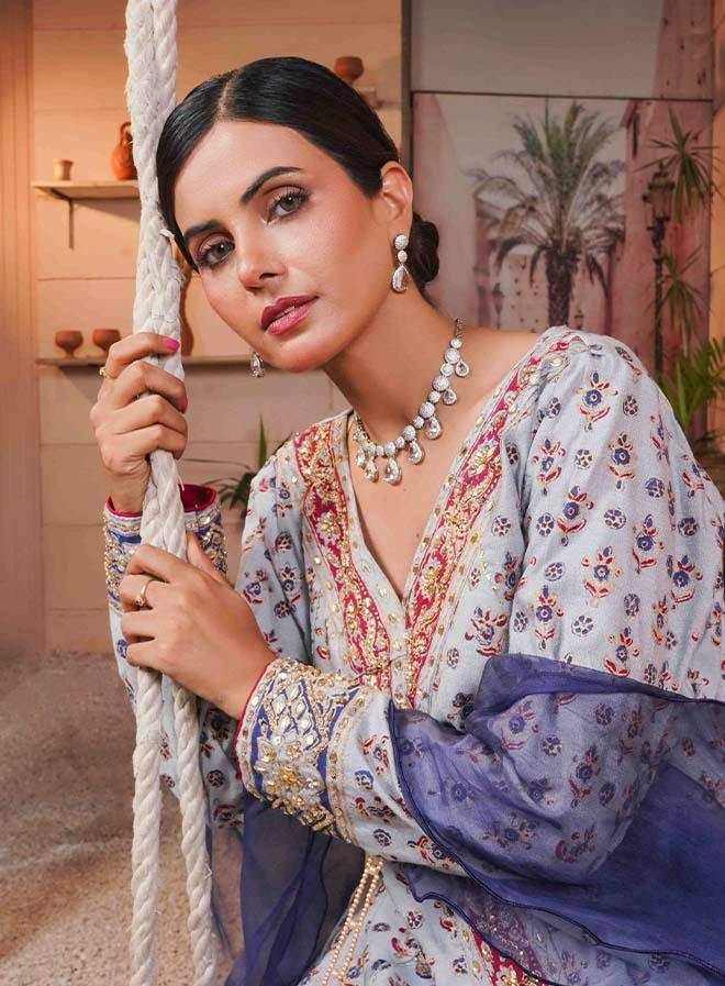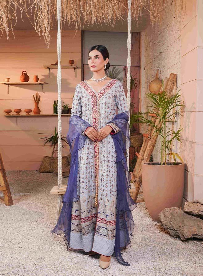 Presenting a must-have collection filled with distinctive, quintessentially Kehkeshan prints, masterfully tailored to be worn and cherished for years to come. This blue cotton silk maxi showcases artfully illustrated block-printed floral motifs, exuding sophistication and charm. The neckline to hemline is adorned with delicate handwork, further enhanced with tassel detailing for an added touch of elegance.