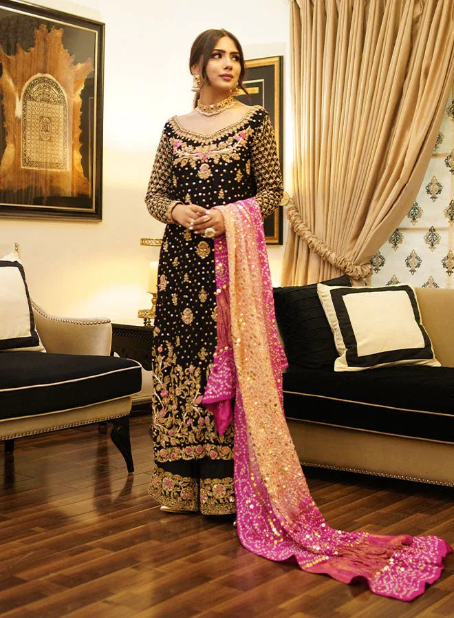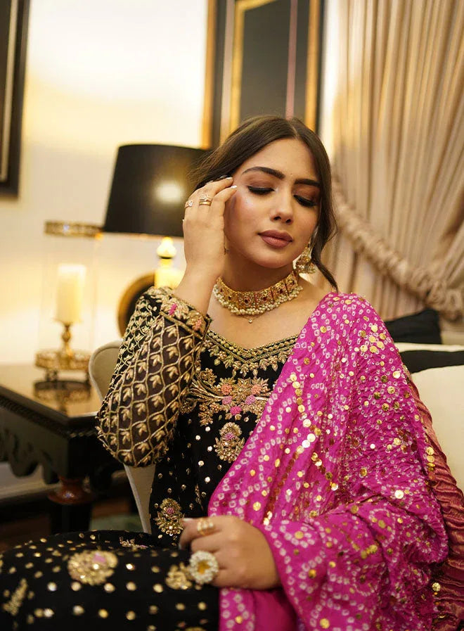 Introducing our exquisite long shirt ensemble, a perfect blend of timeless elegance and regal charm. This three-piece set includes a beautifully designed khaddi net shirt, a luxurious raw silk trouser, and an opulent silk shawl, all presented in a classic black hue. The shirt features intricate resham and solid gold work, embellished with delicate qora, dabka, crystals, and stones, creating a stunning visual appeal. The ensemble is completed with a handworked Kamdani chunri shawl that showcases the artistry of traditional craftsmanship. Ideal for all seasons, this outfit can be customized to suit your preferences, allowing changes in color, fabric, and length. With a shirt length of 49 inches, this set promises to make a resplendent statement at any occasion.