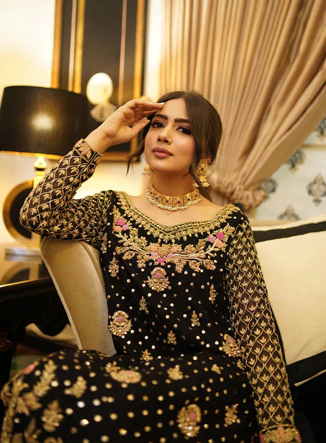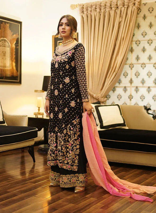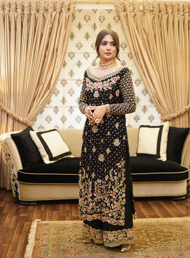 Introducing our exquisite long shirt ensemble, a perfect choice for those who seek timeless elegance and regal charm. This three-piece set includes a beautifully crafted khaddi net shirt, luxurious raw silk trouser, and a stunning chiffon dupatta, all in a classic black color. The shirt showcases intricate handwork with resham and solid gold embellishments, featuring delicate qora, dabka, crystals, and stones that create a resplendent statement. It is paired with a handworked Kamdani chunri shawl, highlighting the artistry of traditional craftsmanship. Suitable for all seasons, this outfit can be customized to fit your preferences, allowing changes in color, fabric, and length. With a shirt length of 49 inches, this ensemble promises to elevate your style for any occasion.