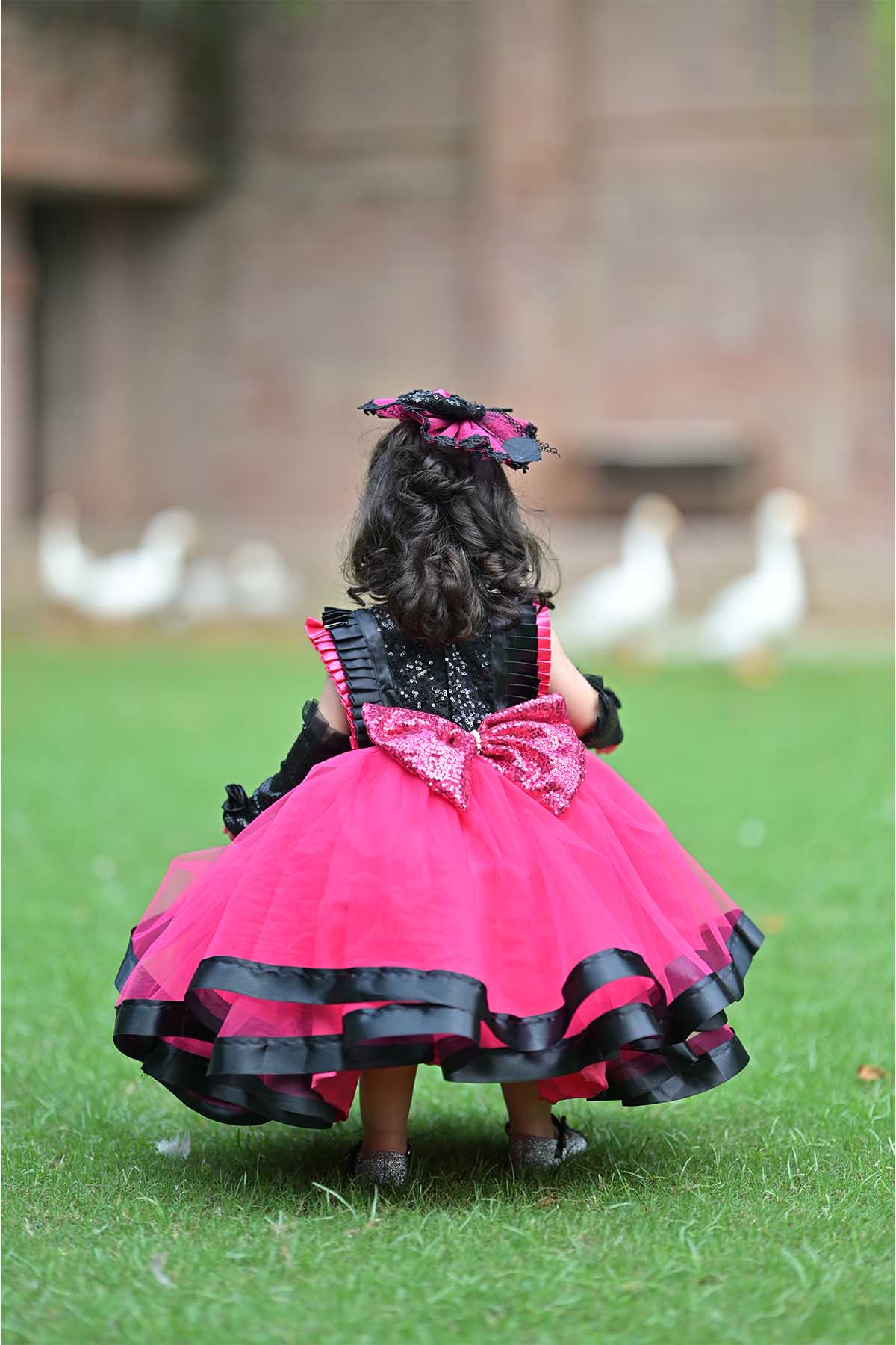 This Short Frock Is A Dazzling Ensemble That Effortlessly Captures Attention With Its Vibrant Shocking Pink Hue. The Base Of The Frock Is Crafted From A Delicate Breeze Fabric, Adding A Touch Of Lightness And Movement To The Garment. The Body Of The Frock Is Adorned With A Mesmerizing Layer Of Sequins On Shimmery Net, Creating A Captivating Play Of Light That Ensures You Stand Out In Any Crowd.