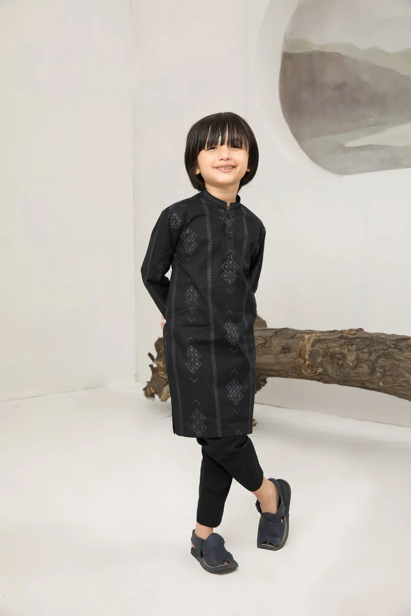 Black Motif Cotton Embroidered Kurta Trouser - Kids