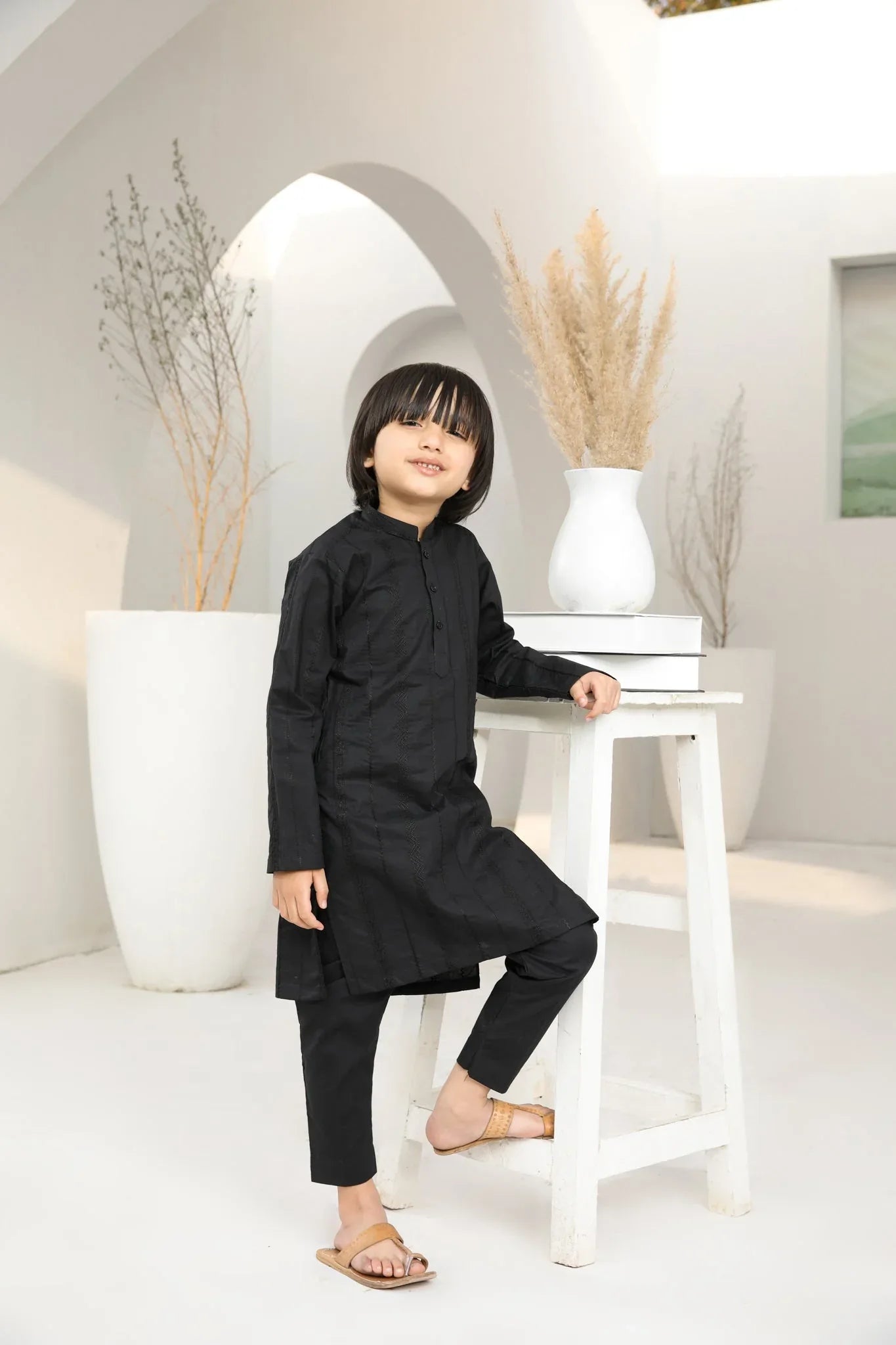 Black Falling Cotton Embroidered Kurta Trouser - Kids