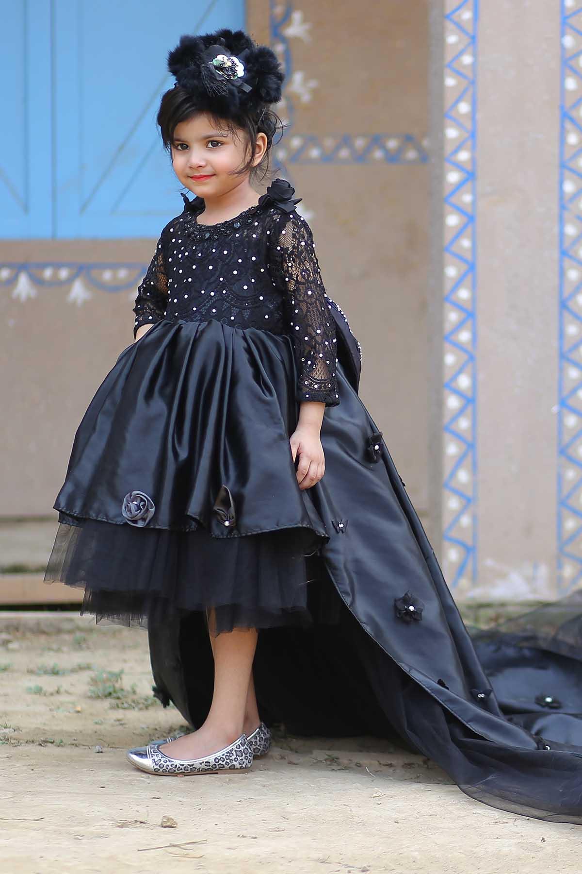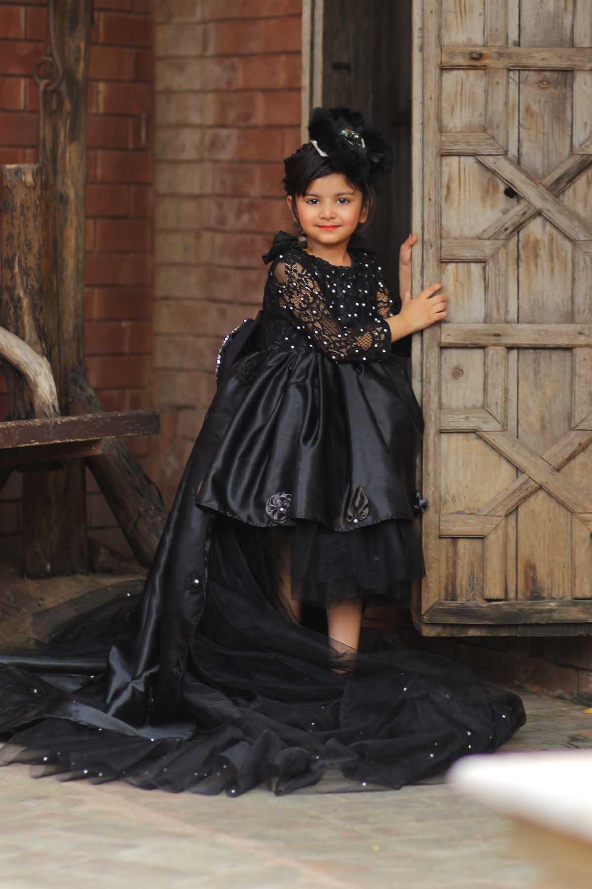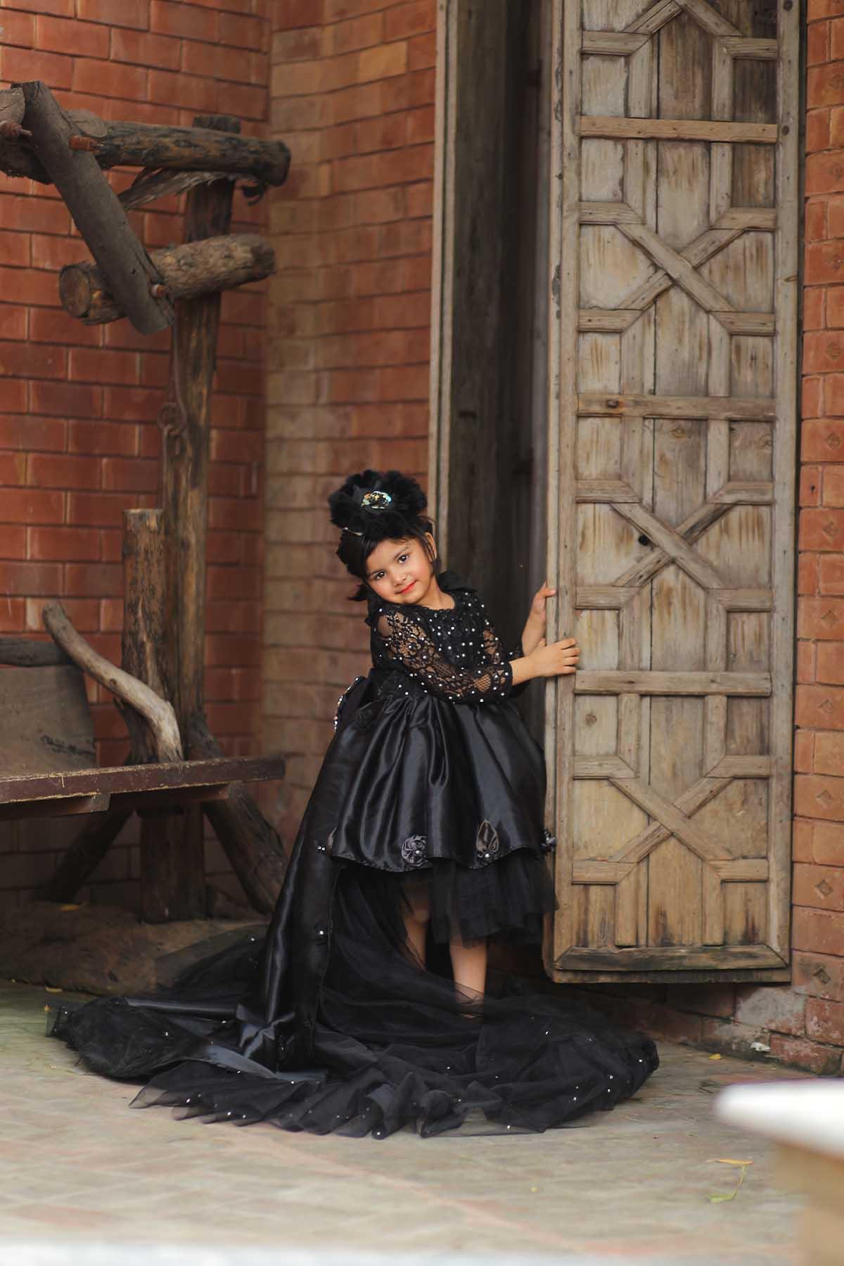 The Black Forest Queen drop-tail frock is a striking and sophisticated ensemble that exudes timeless allure. Cloaked in a rich black hue, the bottom and tail of the frock are meticulously crafted from luxurious katan silk, imparting a regal and graceful drape. The body of the dress, fashioned from intricately embroidered breeze net, showcases an elegant fusion of textures. The ensemble is adorned with a lavish display of 3D flowers and delicate pearls, adding a touch of opulence and femininity.