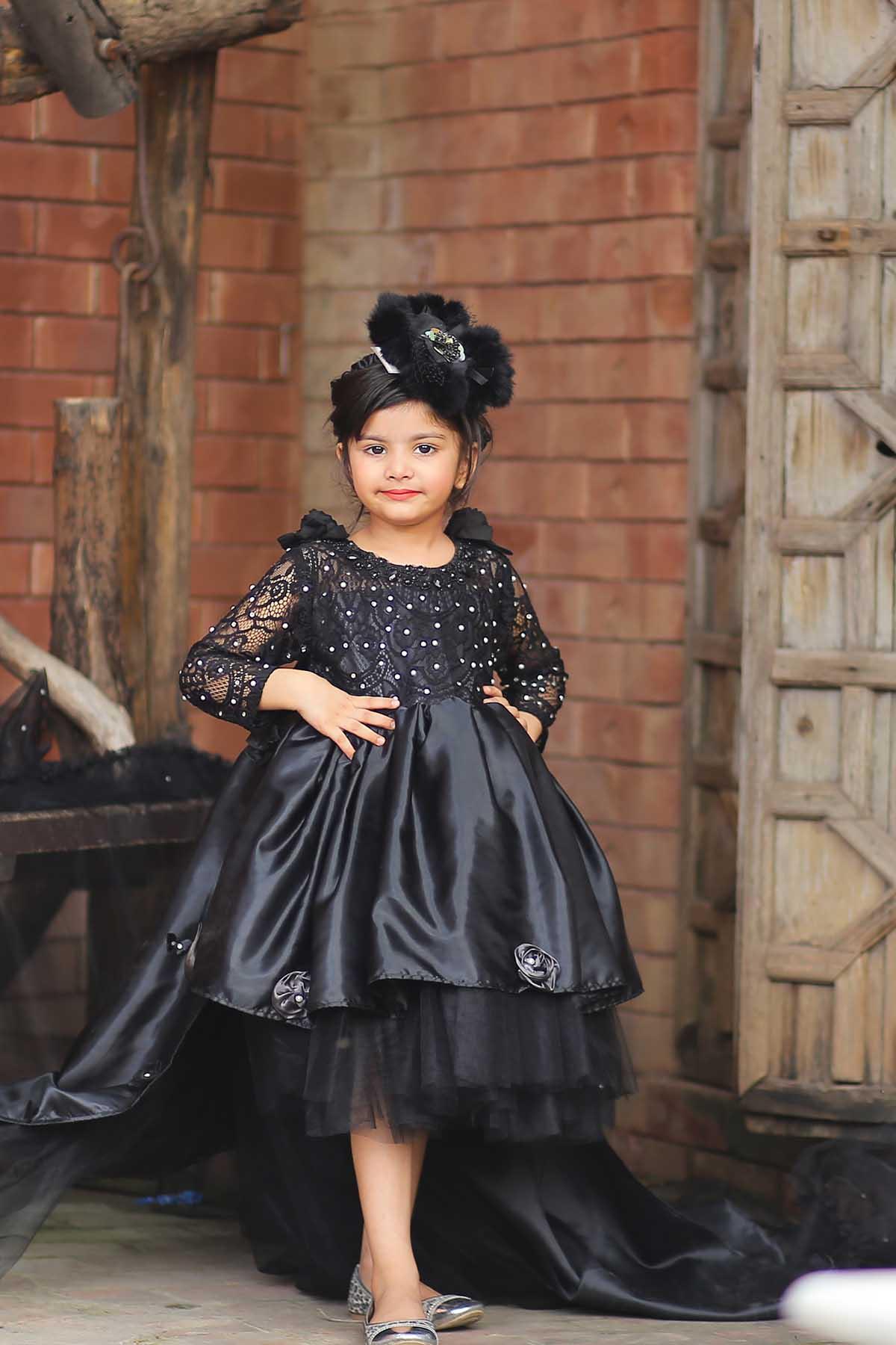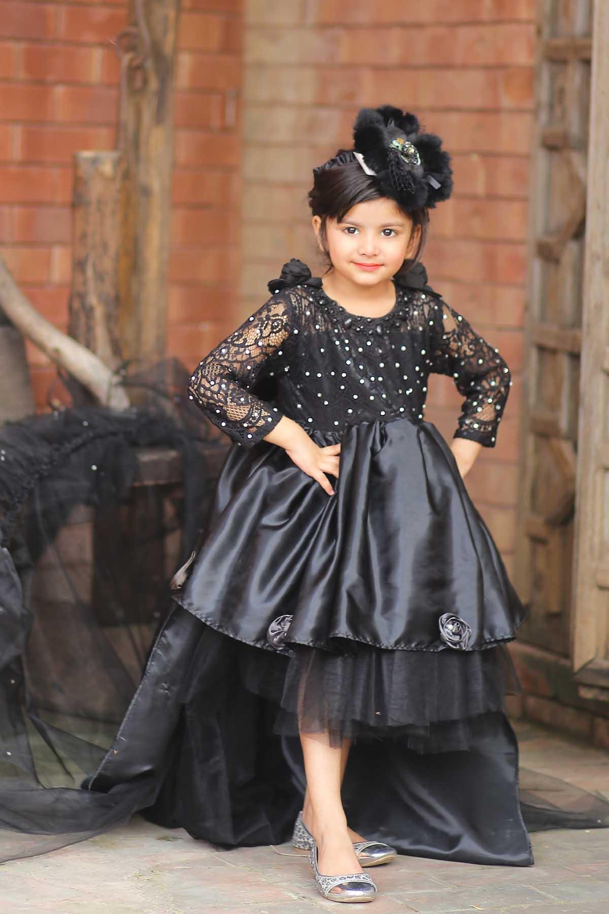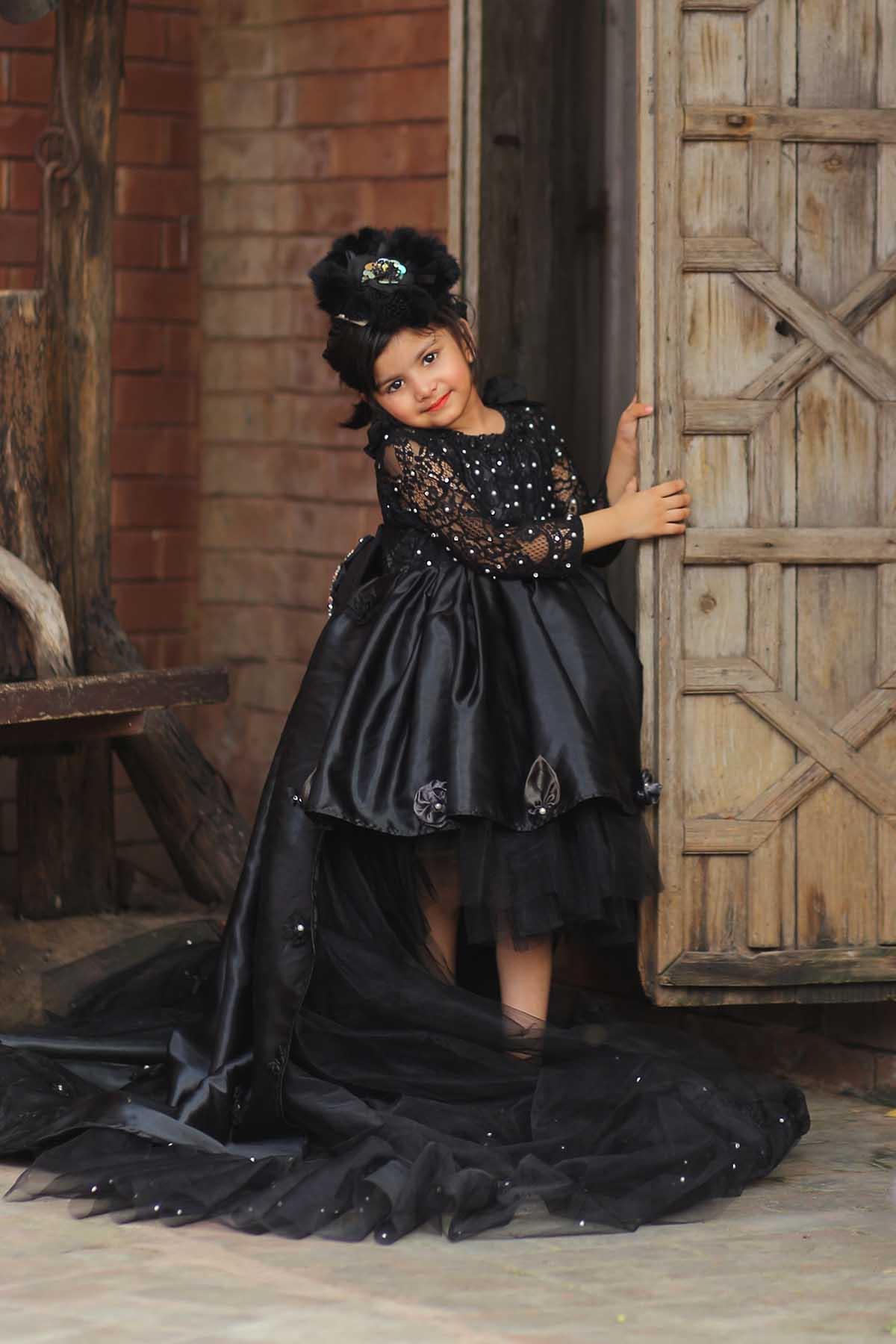 The Black Forest Queen drop-tail frock is a striking and sophisticated ensemble that exudes timeless allure. Cloaked in a rich black hue, the bottom and tail of the frock are meticulously crafted from luxurious katan silk, imparting a regal and graceful drape. The body of the dress, fashioned from intricately embroidered breeze net, showcases an elegant fusion of textures. The ensemble is adorned with a lavish display of 3D flowers and delicate pearls, adding a touch of opulence and femininity.