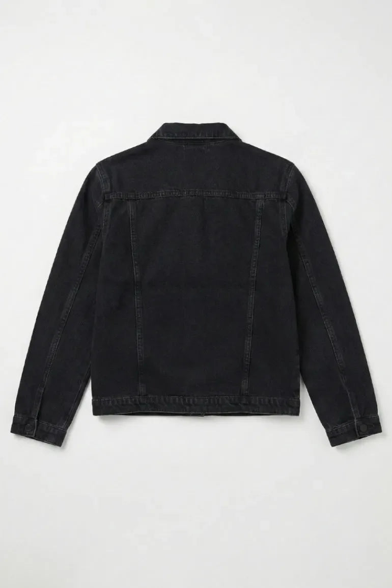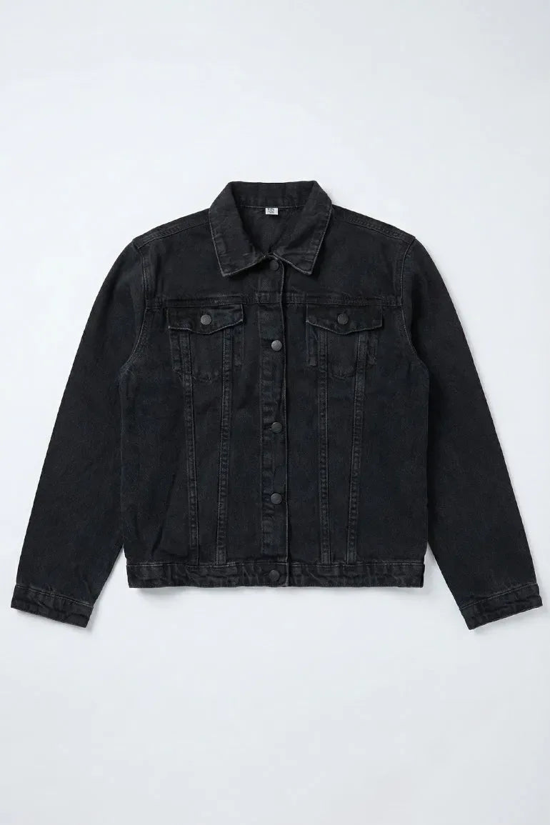 A timeless wardrobe essential — this black denim jacket brings a cool edge to any outfit. Designed with a classic button-down front, flap pockets, and a structured fit, it’s perfect for layering over tees or dresses all year round.
