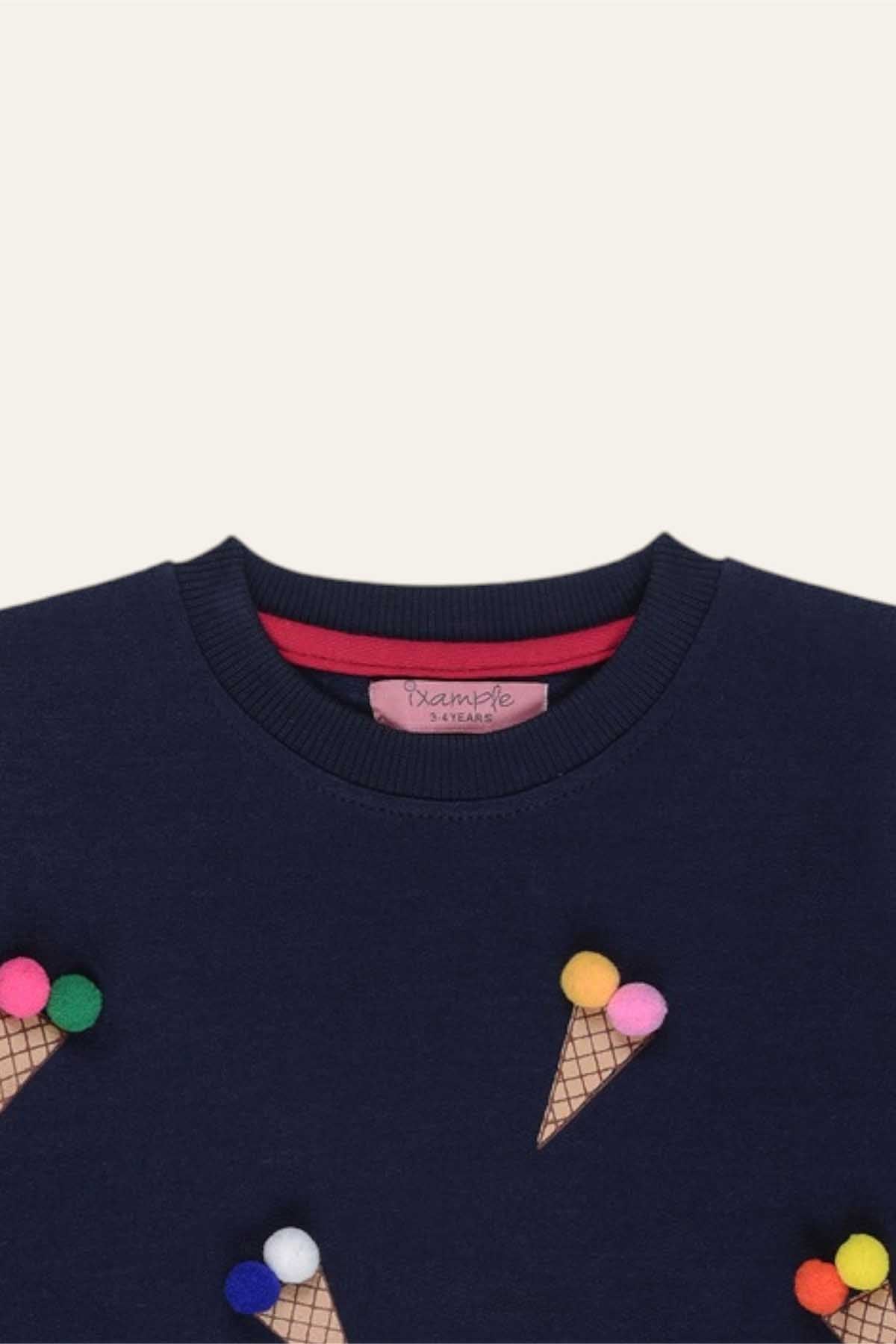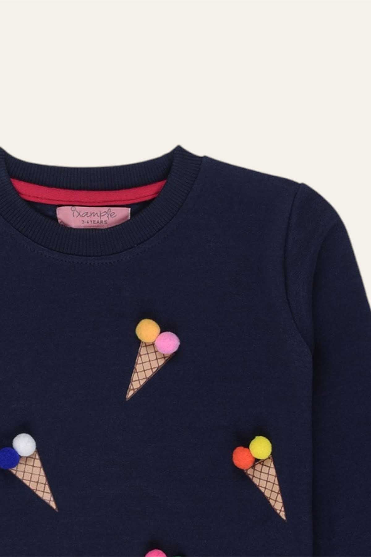 Navy Waffle Printed Sweatshirt With Pom Pom
