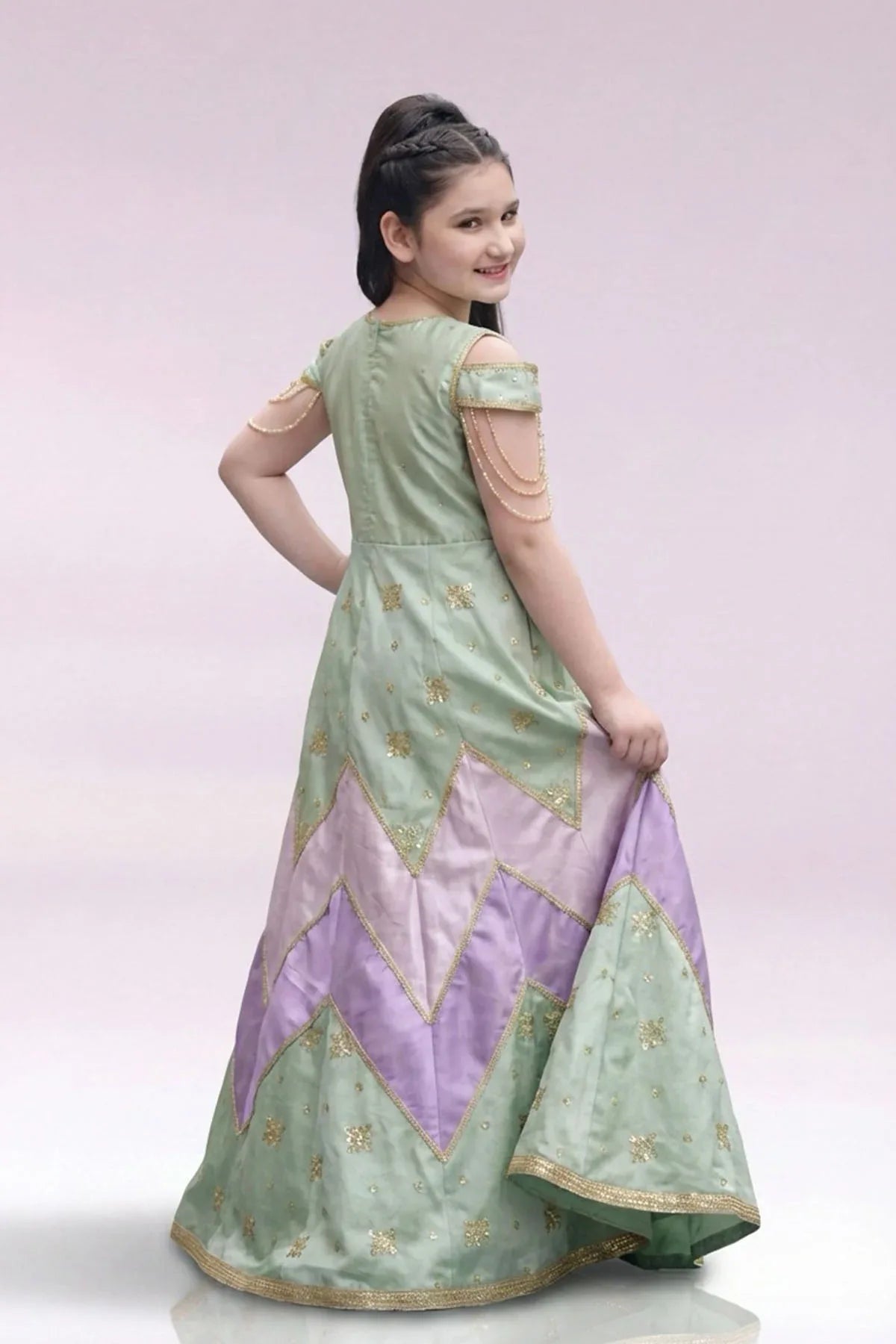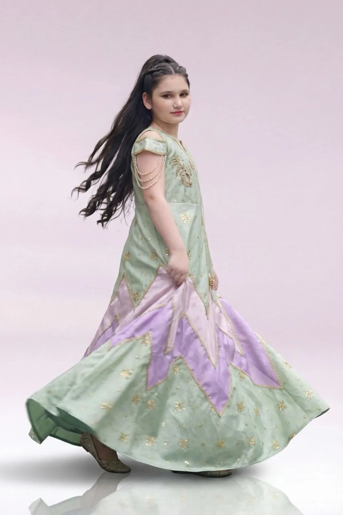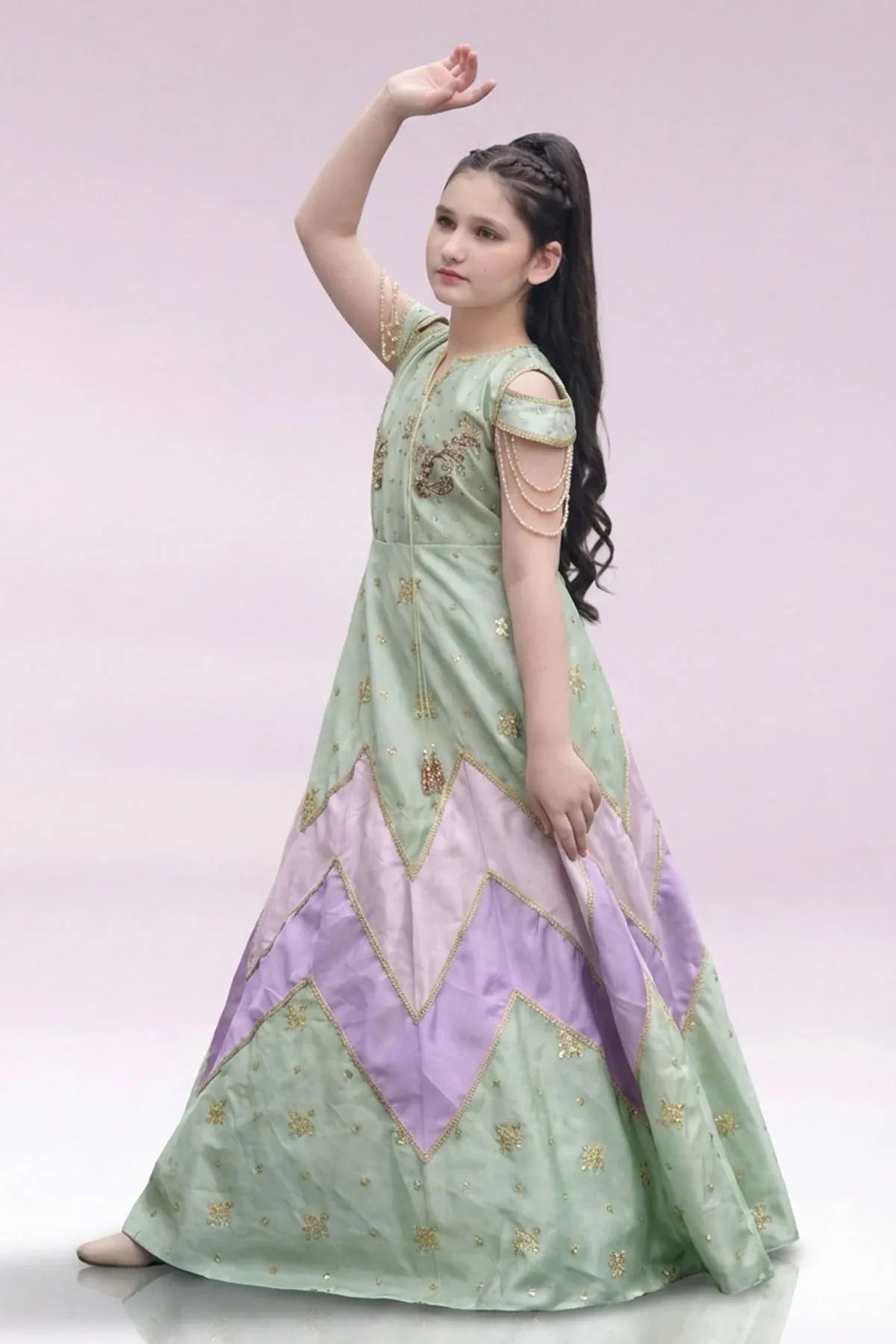 The dress is intricately embellished with a stunning combination of Dabka, Tilla, and Zardozi work, all of which are handwoven to perfection, showcasing the age-old artistry of Indian embroidery. The Dabka, with its metallic sheen, adds an ornate touch, while the Tilla embroidery brings a fine, golden texture that complements the rich fabric. The Zardozi detailing, crafted with metallic threads, brings a regal, timeless appeal to the ensemble.
