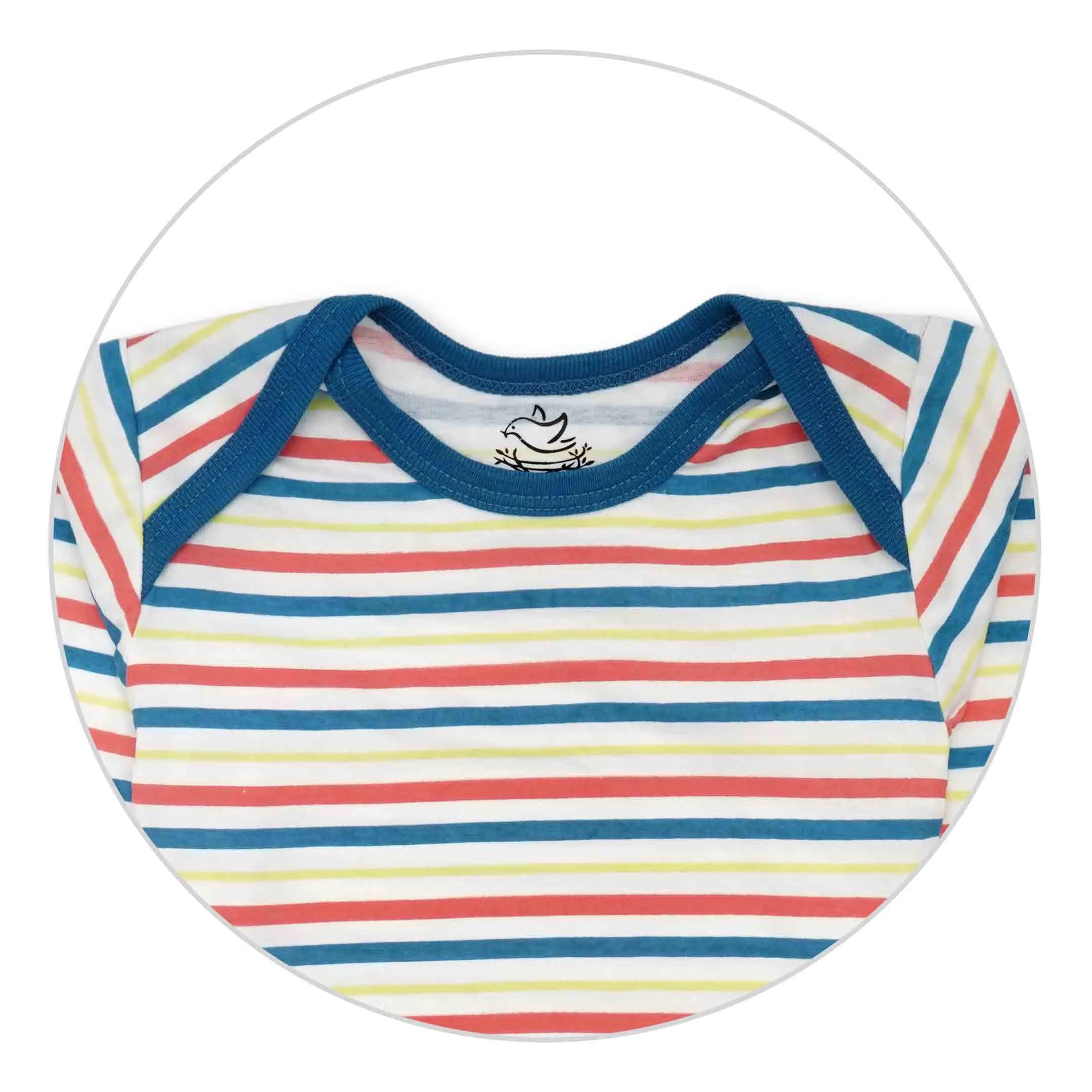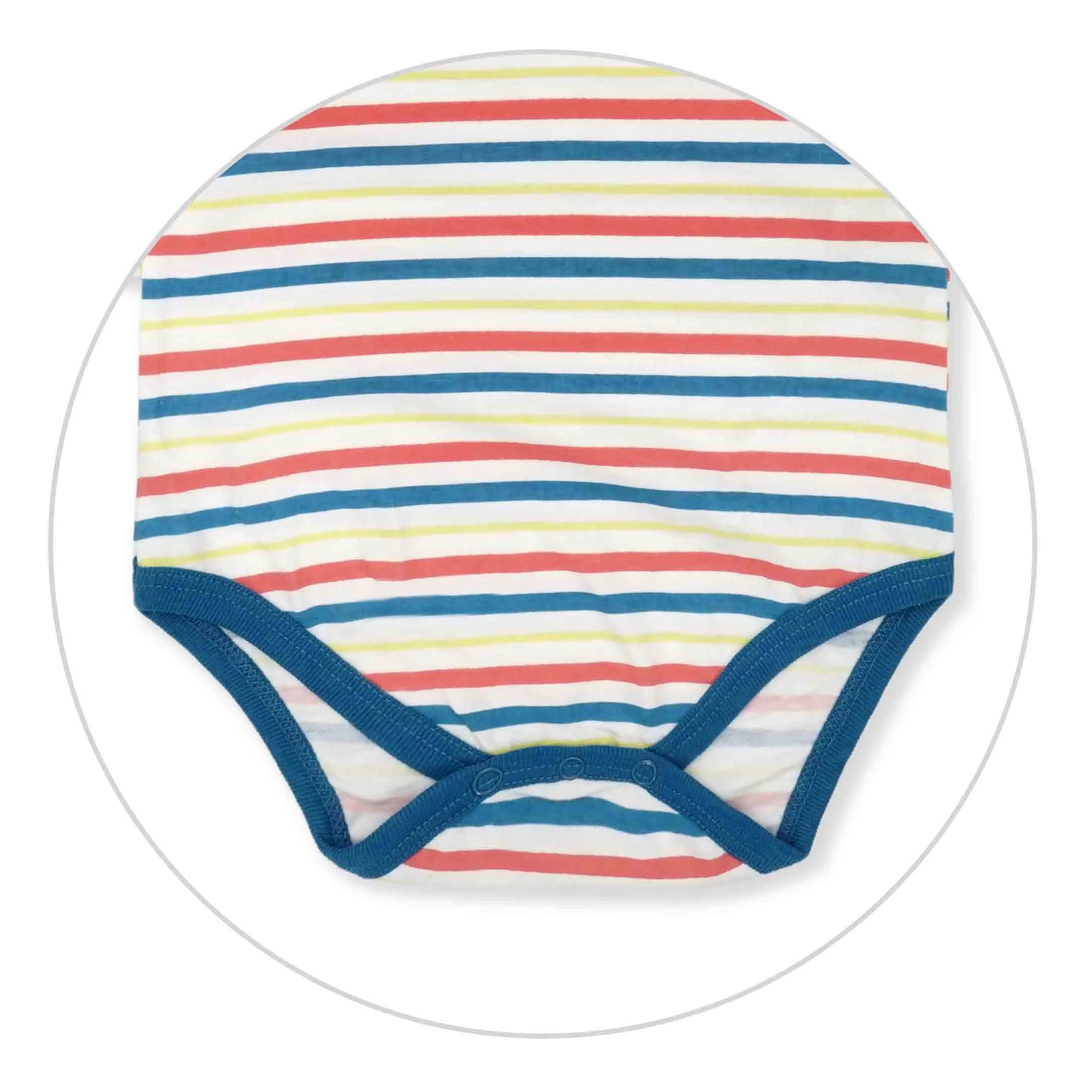 Made from the super soft interlock fabric, our new Fun In The Sea Stripe Long Sleeve Bodysuit is perfect for keeping your little explorer warm and comfy all day long. The playful striped print in red, blue, yellow, and white is sure to spark their imagination, while the blue lining on the lower body, shoulders, round collar, and snap tab buttoned lower adds a touch of classic charm and ease.