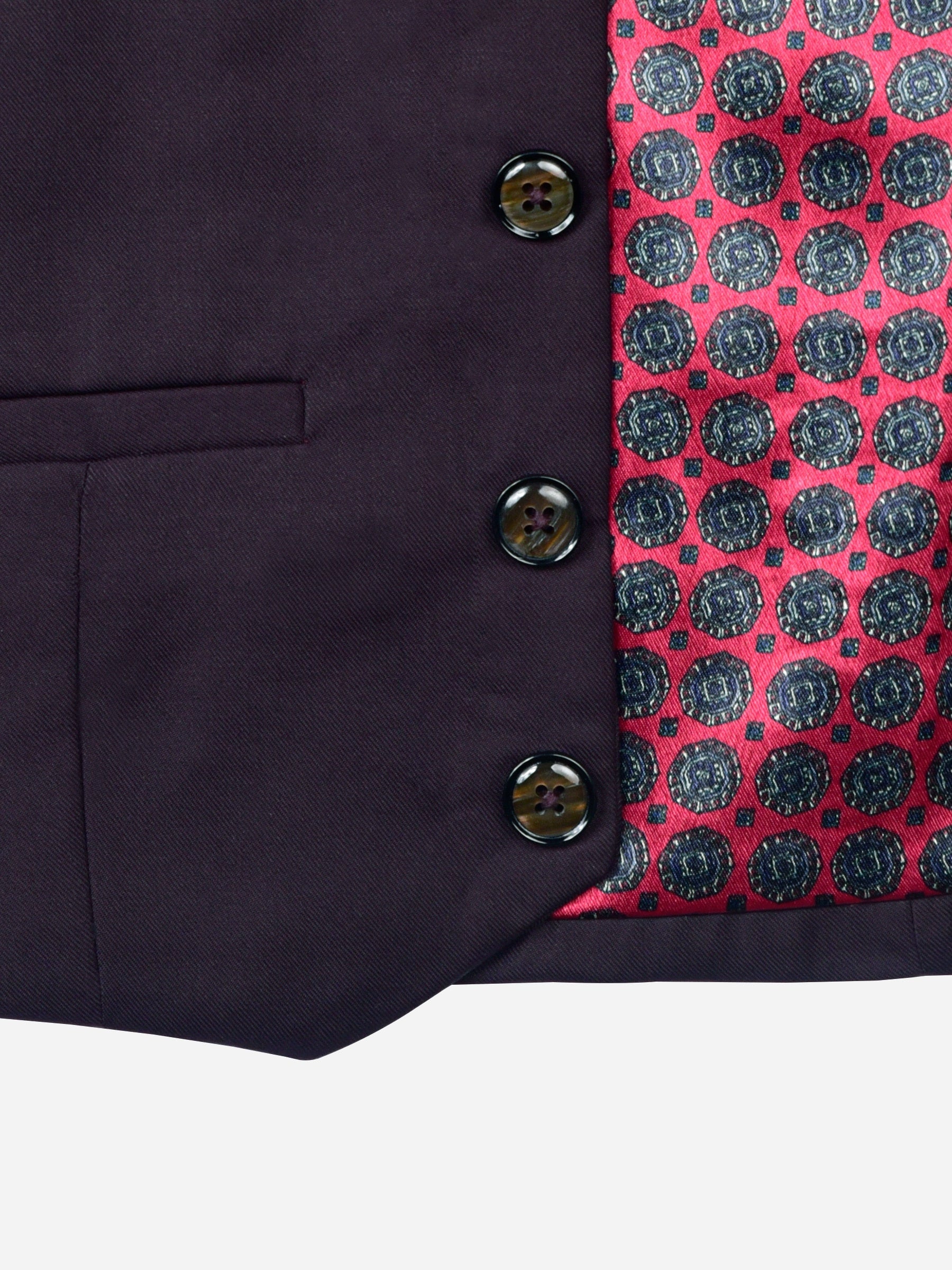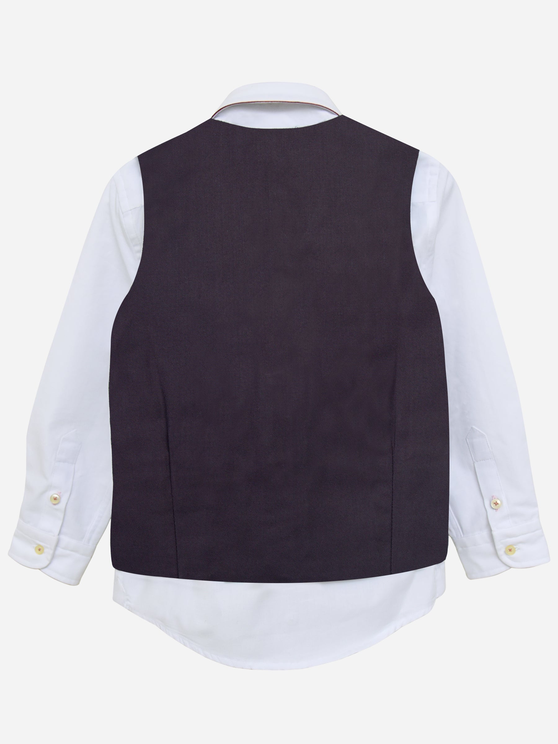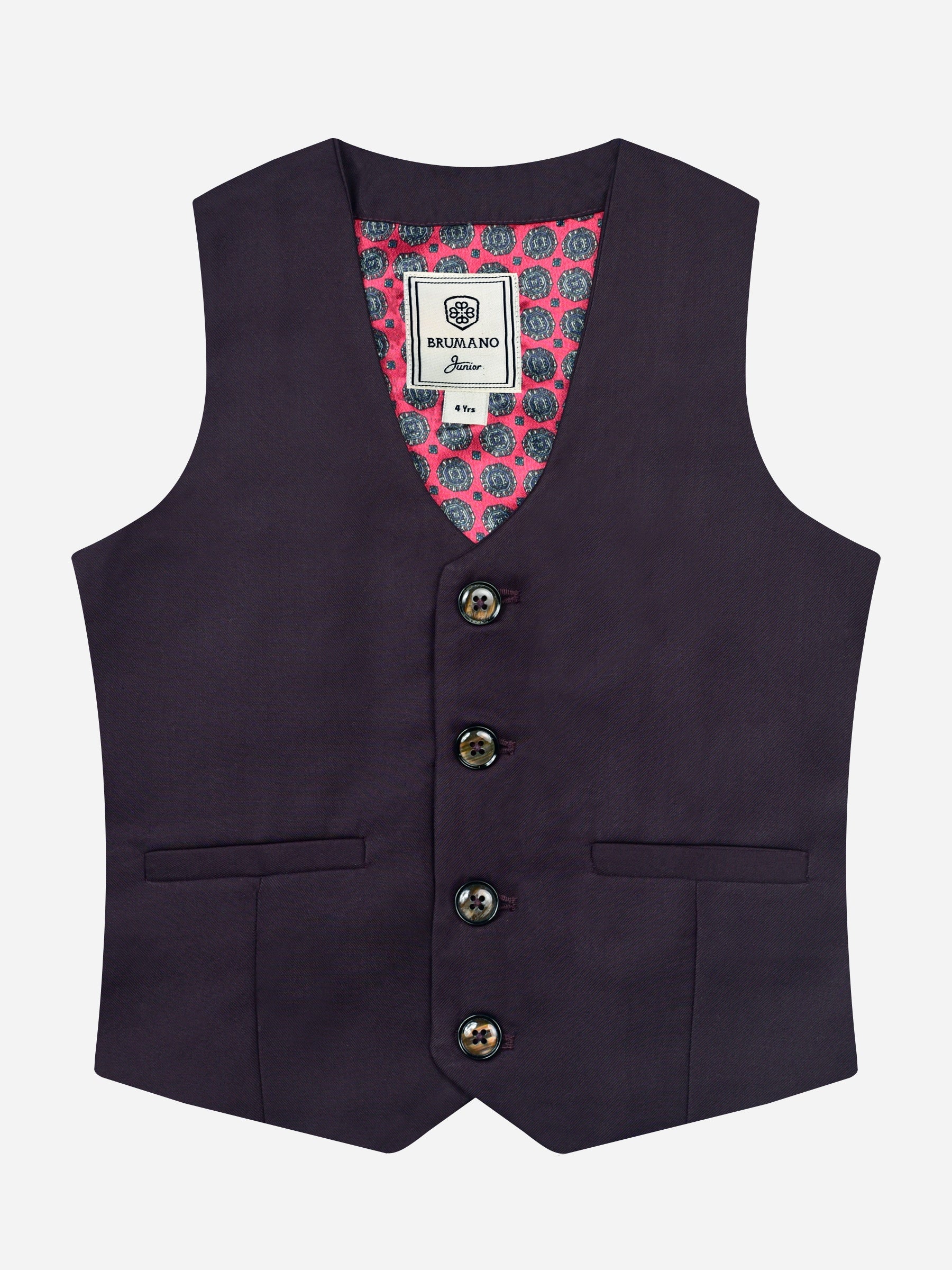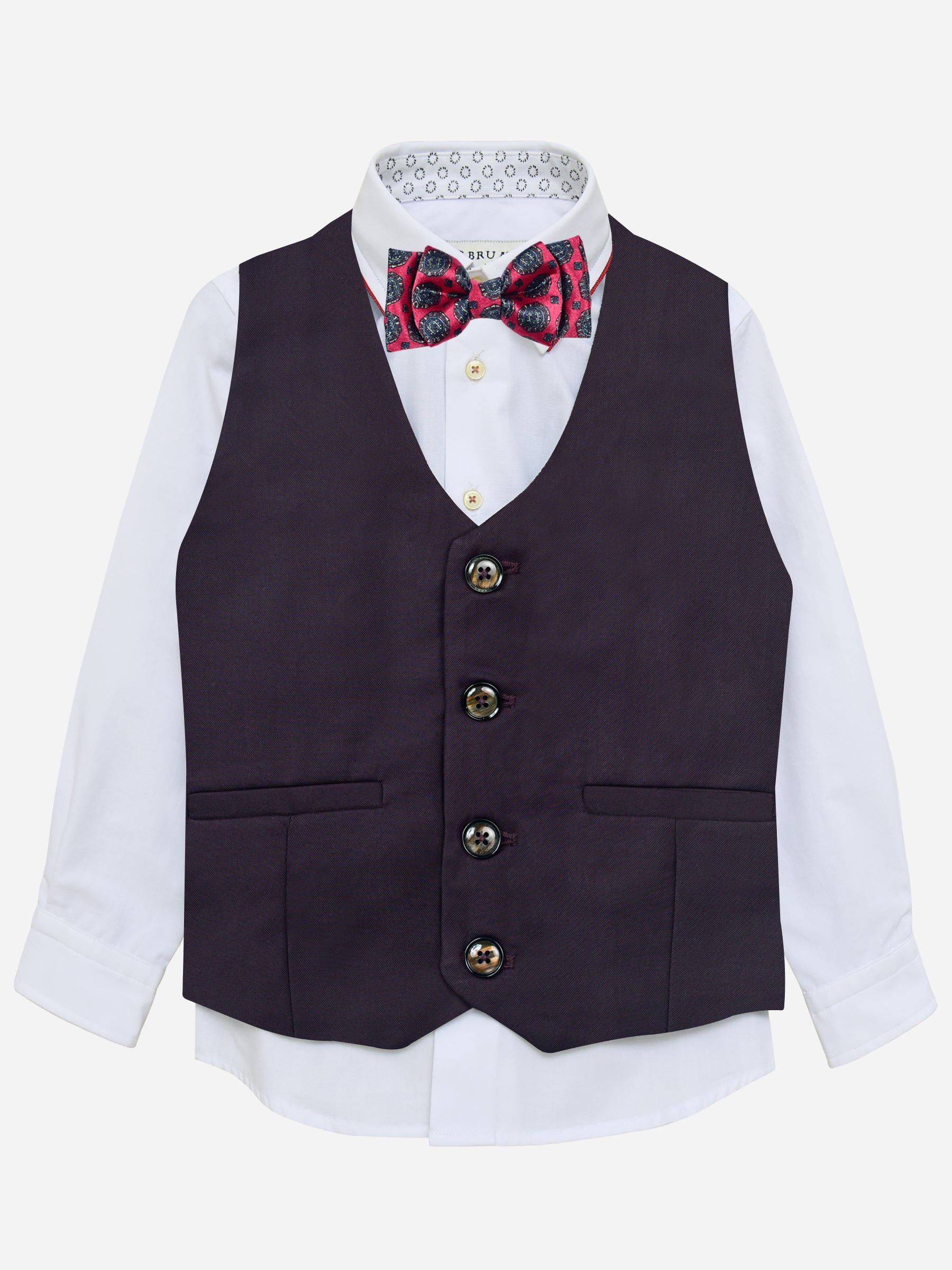 Trendy and stylish suit vest for kids. Made with twill fabric in burgundy color, it features printed inner lining & playful magenta printed bow to make your kid look smart on special days.