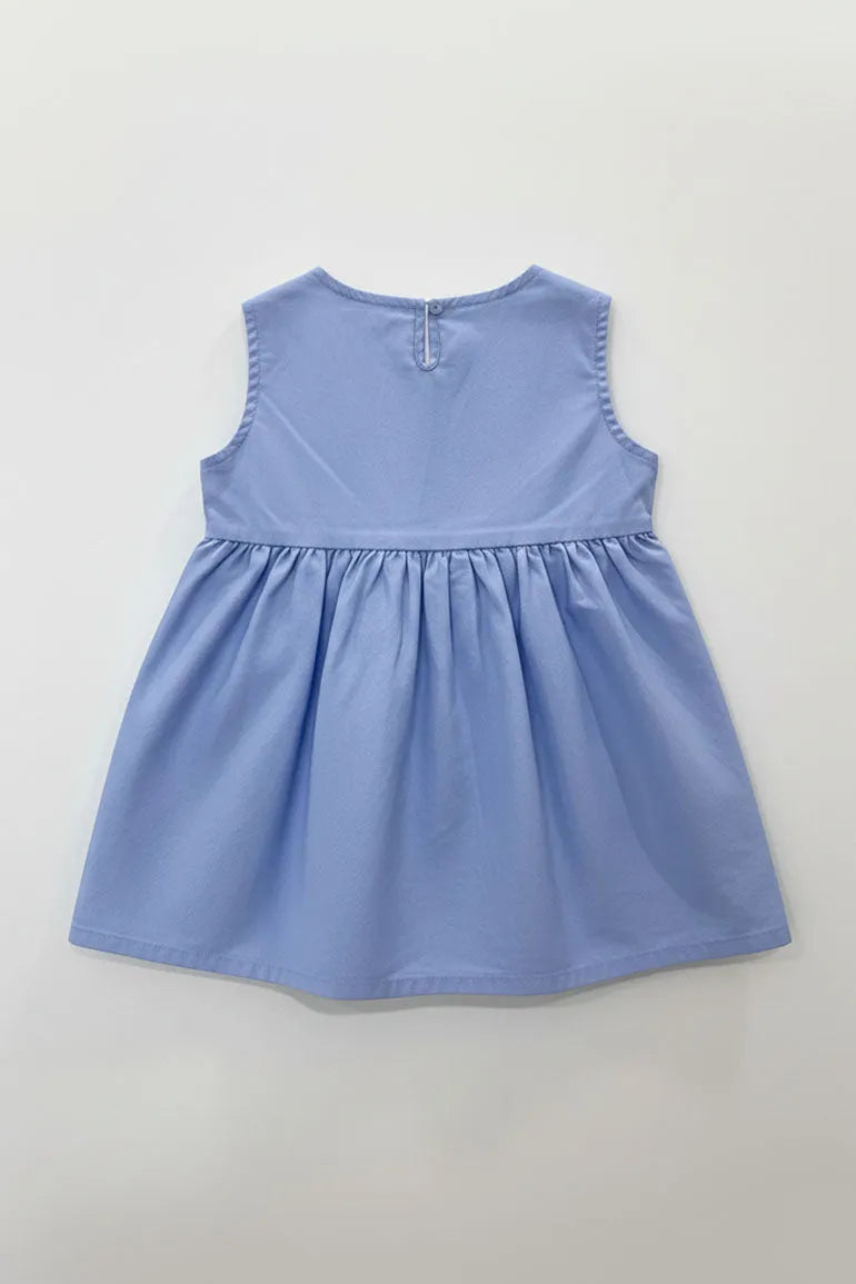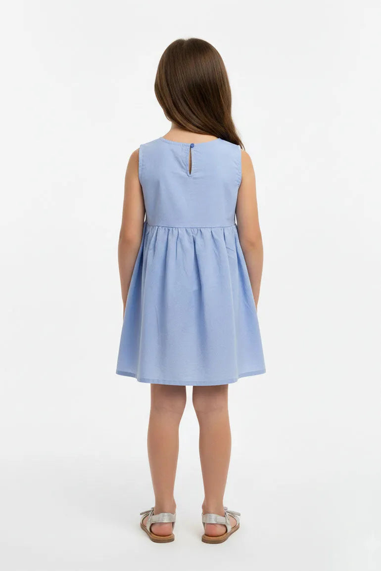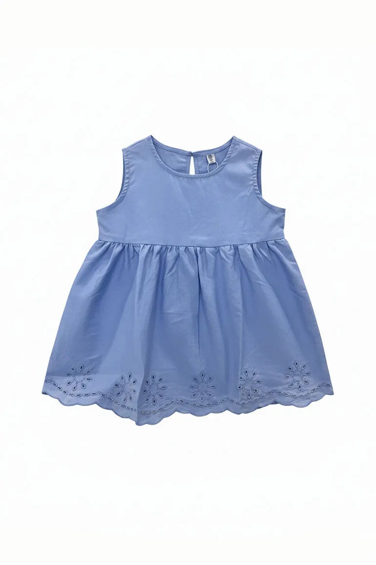 Sleeveless top with a smooth bodice and gathered hem for a cute flowy fit. Eyelet embroidery and scallop hem add a pretty finished look. Easy to wear with jeans leggings or matching pants for outings and play.