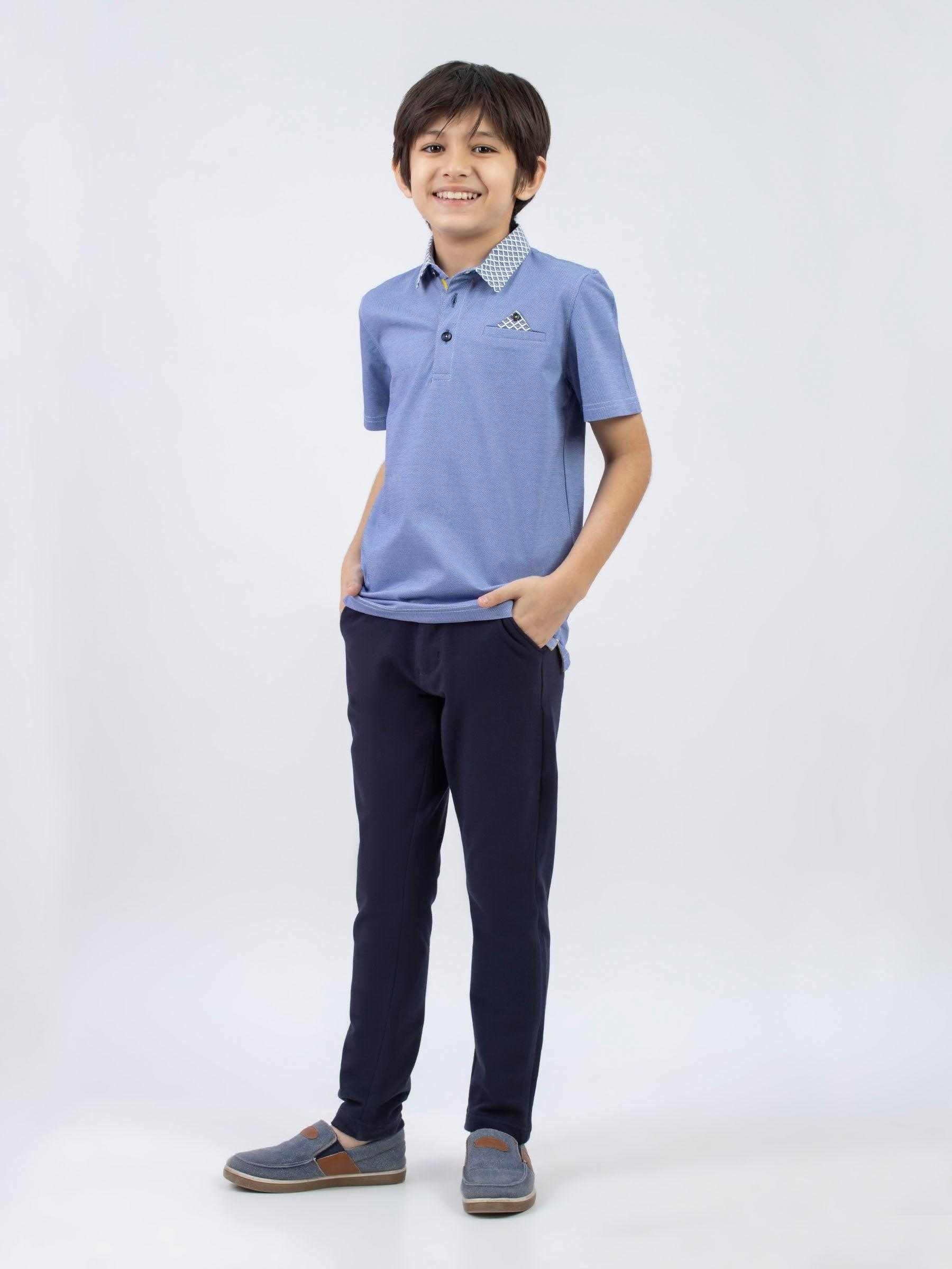 Designed for comfort, this mid blue casual polo shirt seamlessly blends sophistication with laid-back charm. Featuring printed collar for a subtle yet distinctive touch to your kids ensemble.