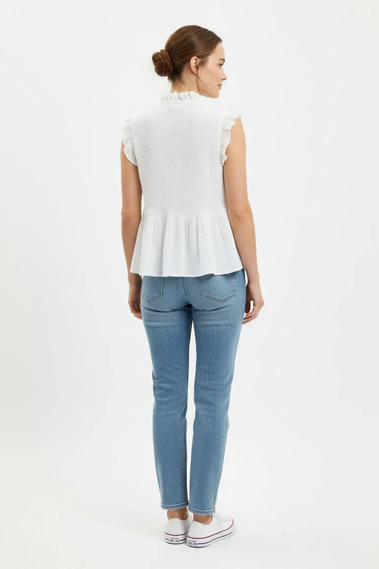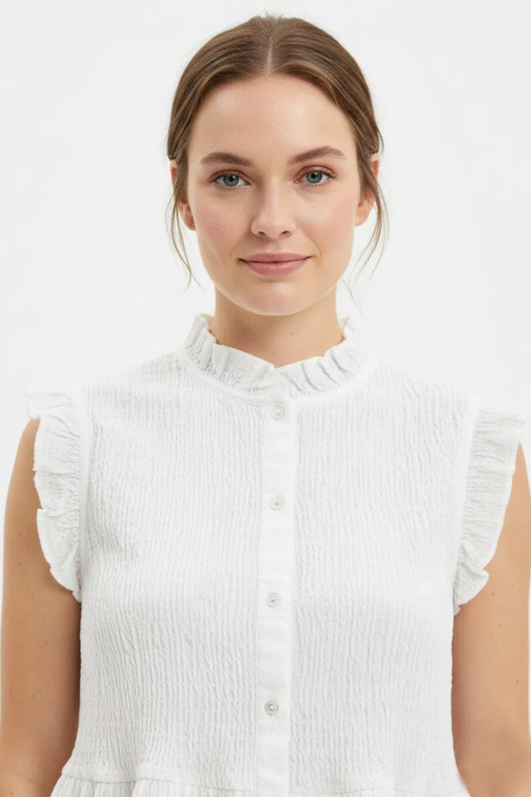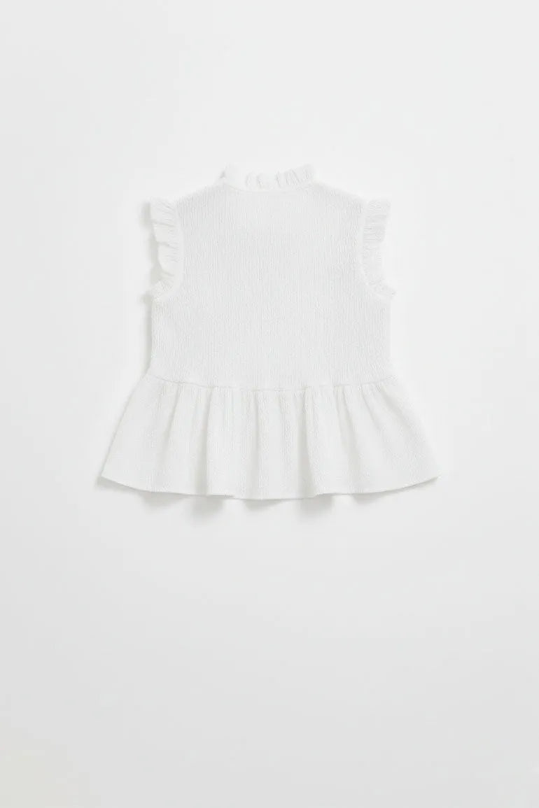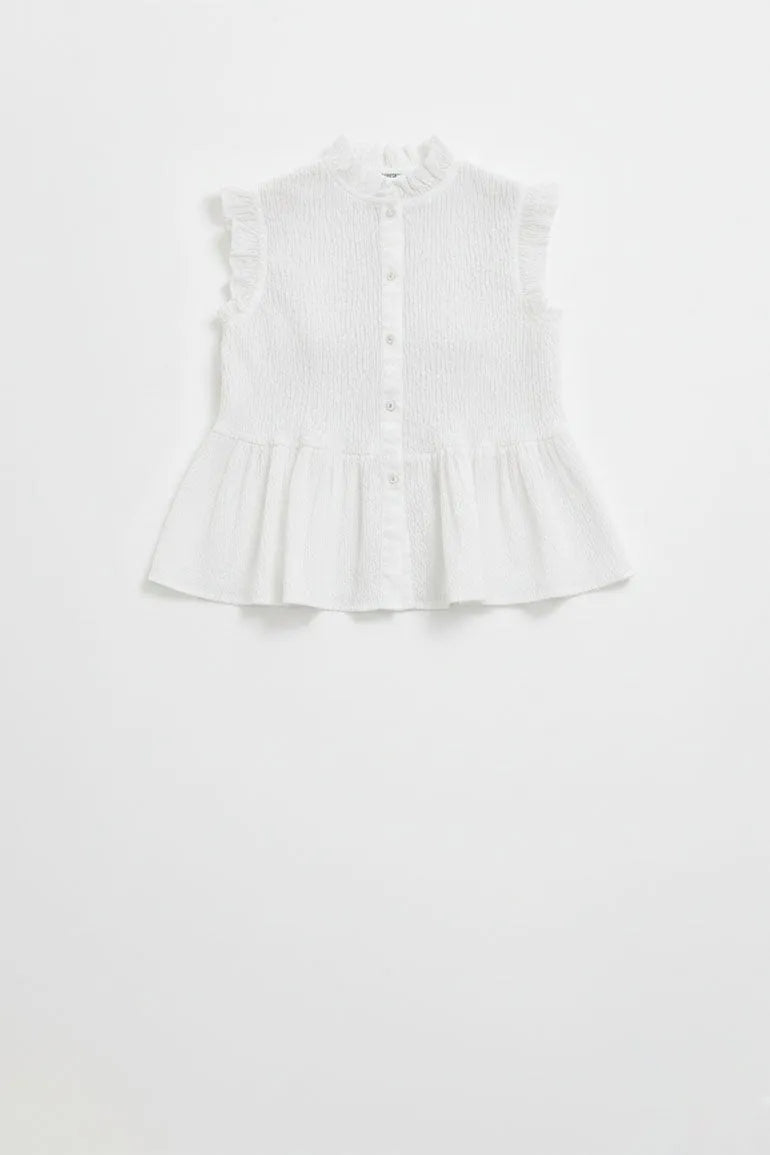 A pretty white top with all-over smocking, ruffle sleeves, and a flared peplum hem for a cute, dressy look. Lightweight and comfy—perfect for summer outings, parties, and festive wear.