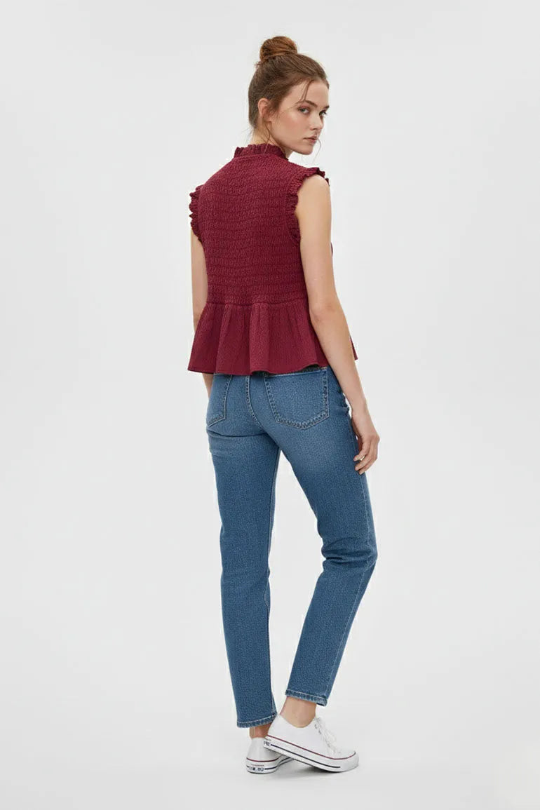 A charming maroon top with all-over smocking, ruffle sleeves, and a flared peplum hem for an easy, dressy look. Soft and comfortable—perfect for casual outings, birthdays, and festive styling.